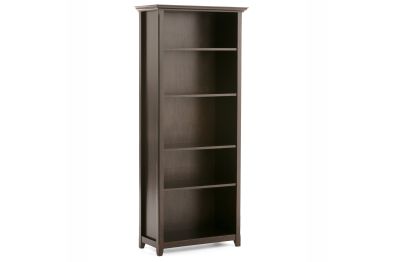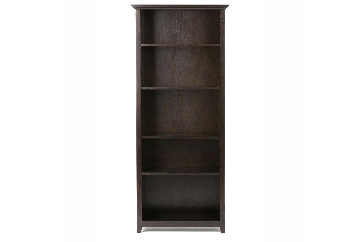 Timeless craftsmanship meets versatile functionality in the Amherst 5 Shelf Bookcase. Handcrafted from solid pine wood, this tall bookshelf features a hickory brown finish, accentuating its natural grain and warm, inviting aesthetic. Four adjustable shelves and one fixed shelf offer flexible storage, perfect for books, decorative pieces, or home office essentials. The crown molding detail and clean lines draw inspiration from transitional design, making this solid wood bookshelf a refined addition to living rooms, offices, or bedrooms. Built from sustainably sourced pine, kiln-dried to resist warping and cracking, this wooden bookcase delivers long-lasting durability while maintaining an eco-friendly footprint. Assembly required.