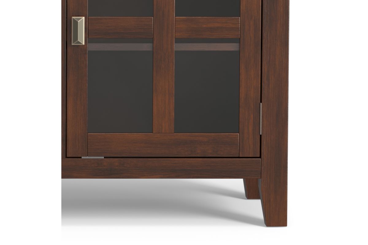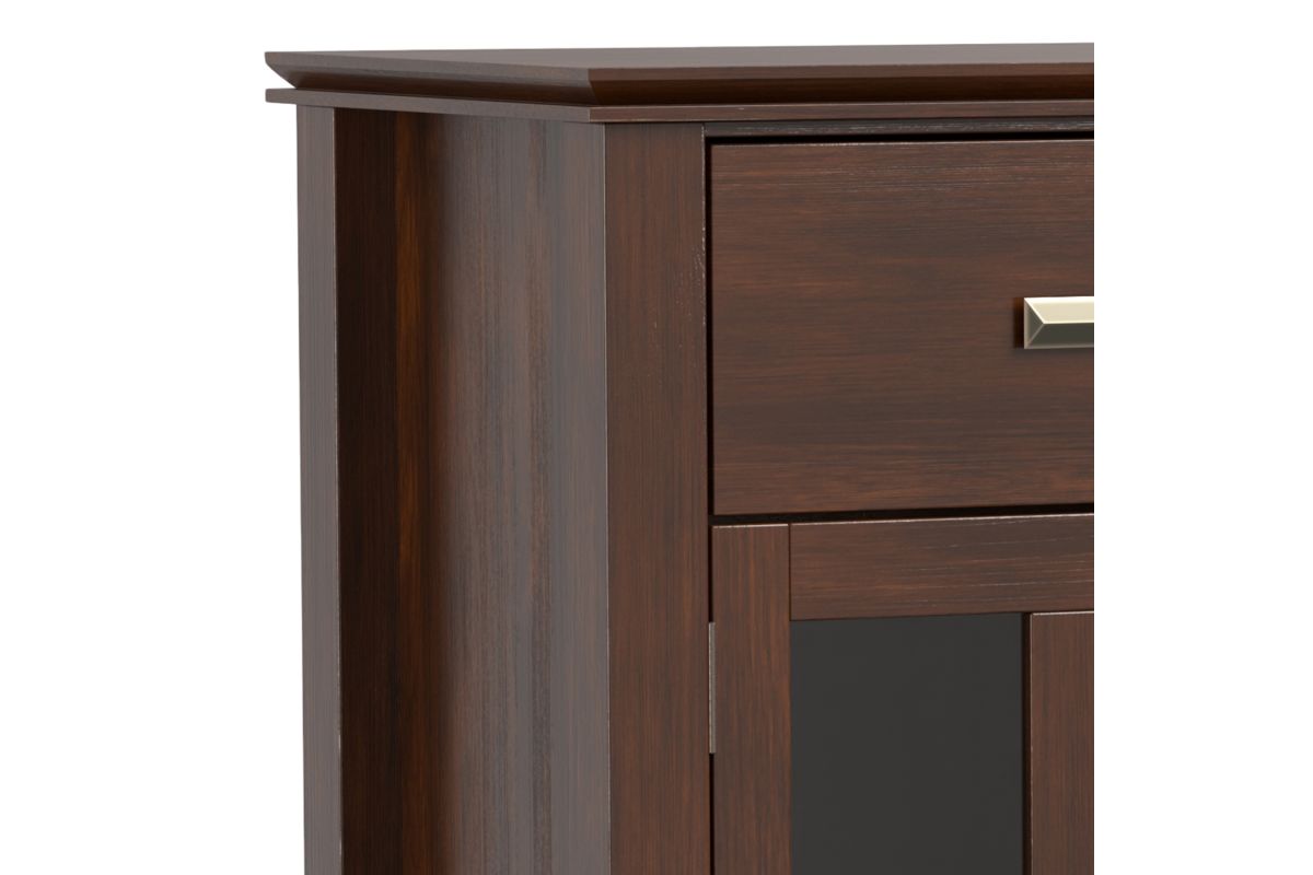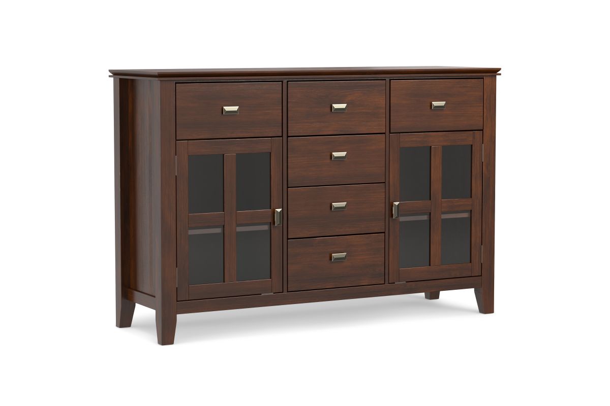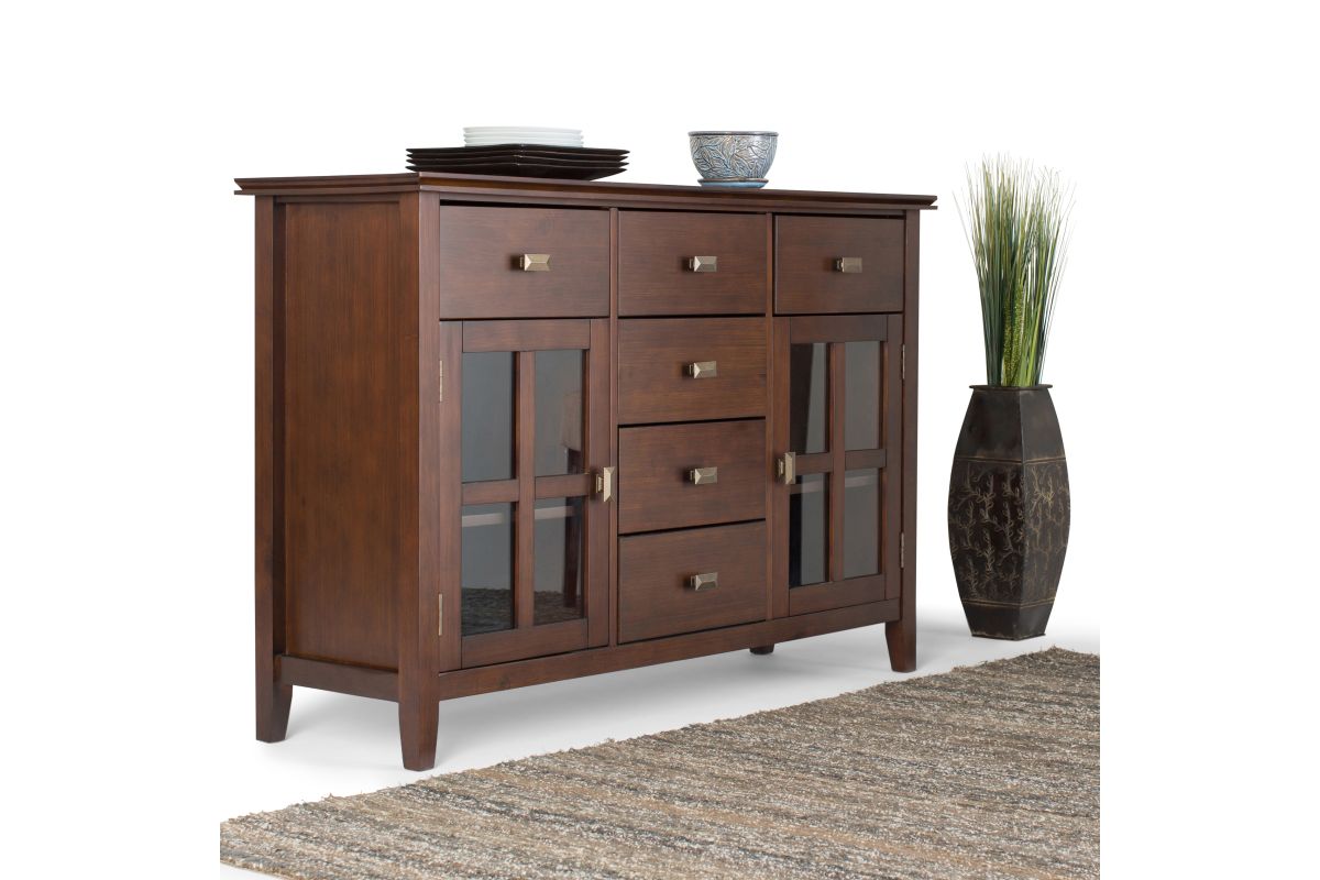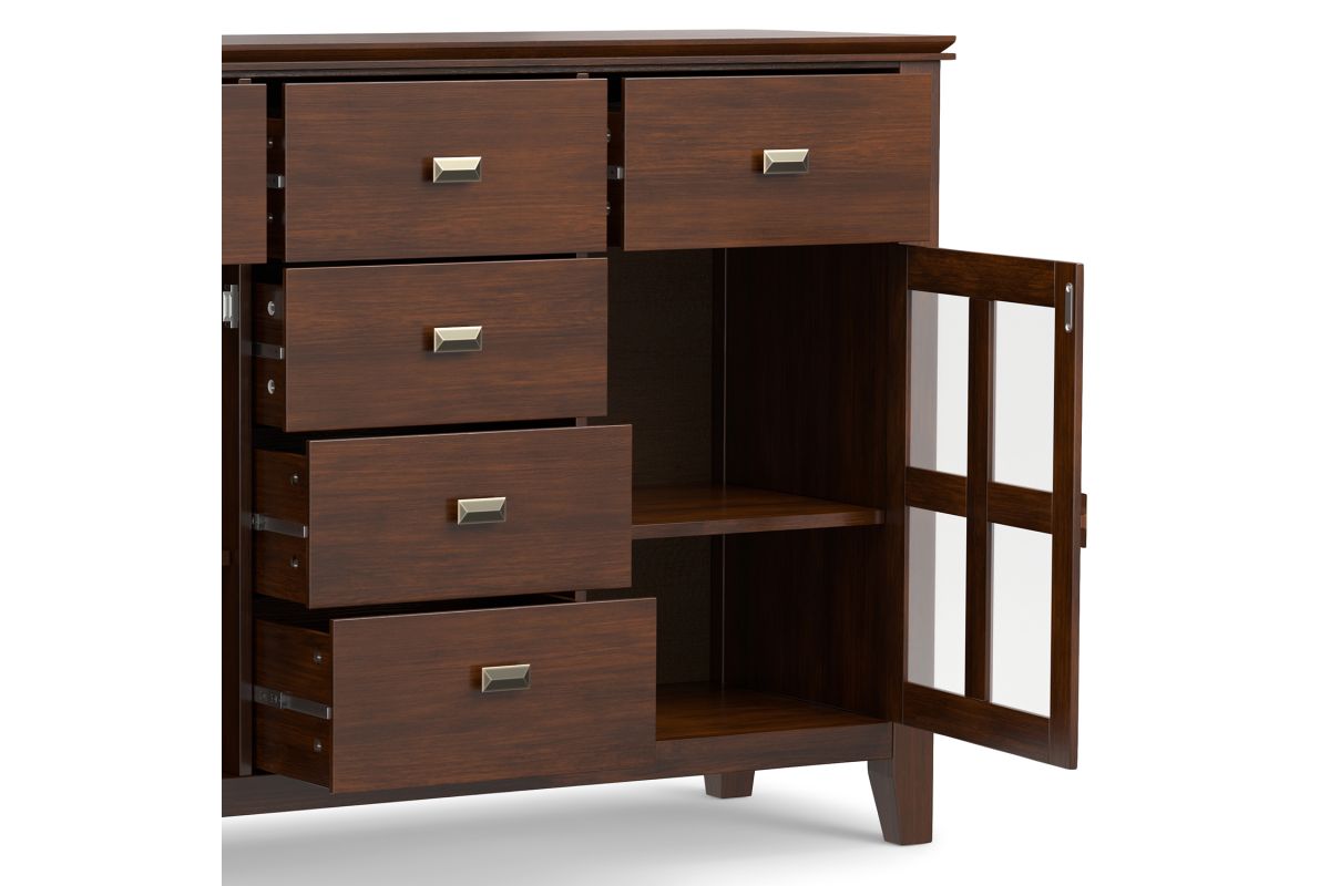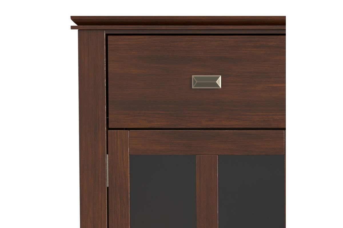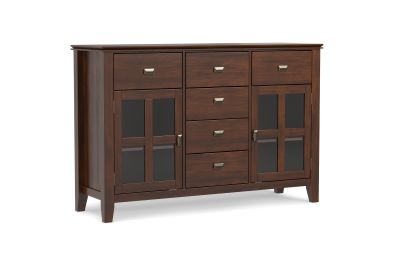 The Artisan Sideboard Buffet in Russet Brown adds a touch of warmth and elegance to your home. Handcrafted from solid wood with a rich hand-applied finish, this sideboard features three spacious drawers, two tempered glass-paneled doors, and adjustable shelves for versatile storage. Perfect for dining rooms, living spaces, or entryways, it offers ample room to organize dinnerware, books, or electronics. The Artisan Sideboard Buffet in Russet Brown combines rustic charm and modern functionality to enhance any space. Assembly required.