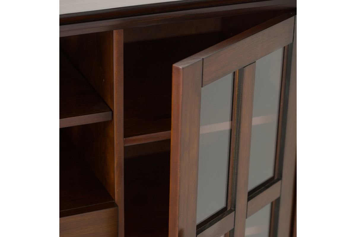 - Features two (2) central drawers with sturdy ball-bearing metal drawer glides for smoother drawer movement, an open center area with one (1) adjustable shelf, and two (2) side tempered glass framed doors that open to large storage spaces with two (2) shelves each
