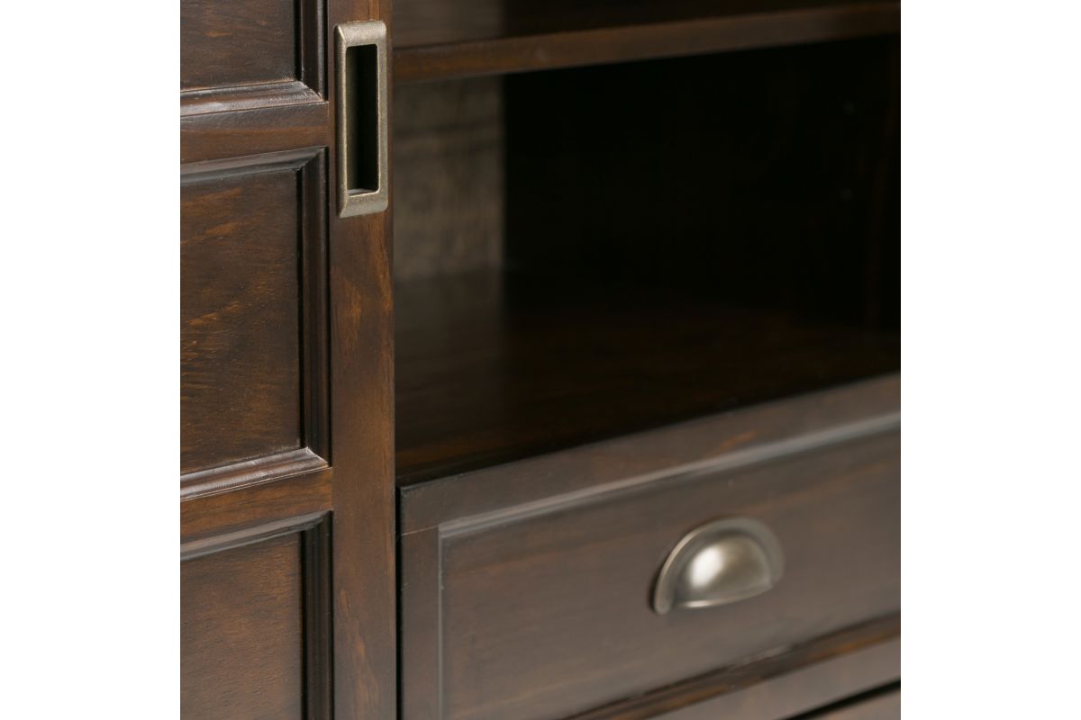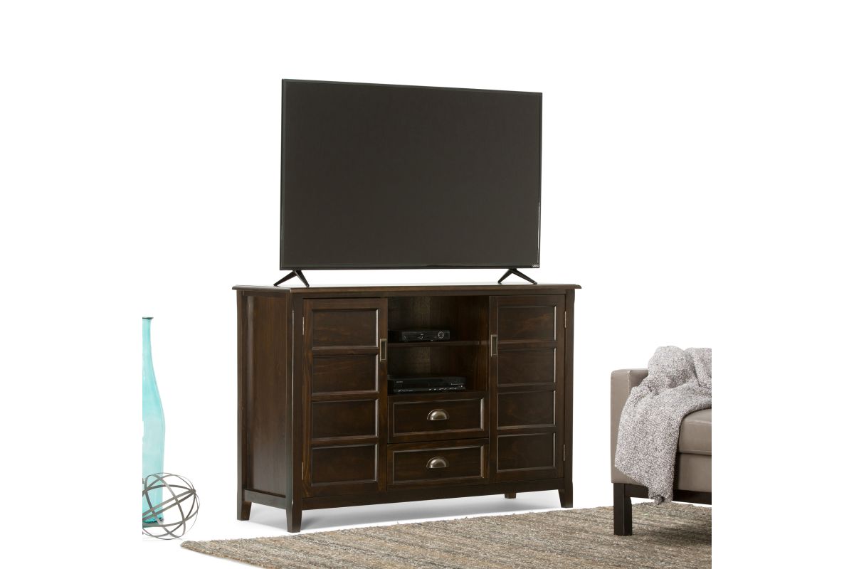 You just bought the ultimate large flat screen TV. Now what to do? Hang it on the wall? No, you need the perfect TV Stand for storage and to enhance your viewing pleasure. Look no further than our popular Burlington TV Stand. It is perfectly sized for TVs up to 60 inches and its 36 inch height puts the TV at a level that is ideal for comfortable viewing. The Burlington TV Stand has plenty of storage and space for all your media and gaming devices. It has a large centrally located open area with one adjustable shelf and two drawers. The two large side storage cabinets open to two adjustable shelves. The unit features cord management cut-outs for easy installation of TV and media components. Assembly required.