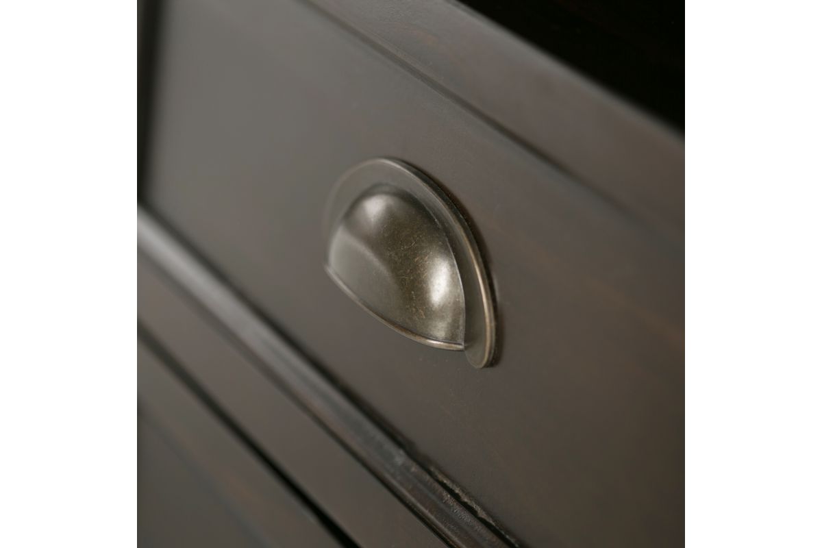 - Transitional design includes rounded molded table top, ladder framed doors, square, slightly tapered legs and antique bronze classic drawer pulls