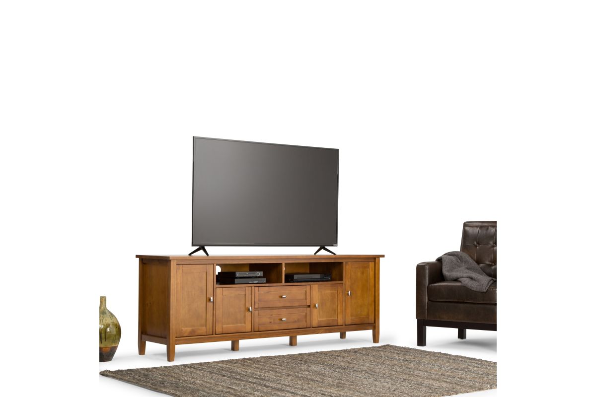 Now that 80 inch flat screen TVs are more affordable, you need to have one. To enjoy it fully, you will also need the perfect TV Stand to position your TV just right. Look no further. The Warm Shaker Extra Wide TV Stand is perfectly sized for TVs up to 80 inches. It has plenty of storage space for all your media and gaming devices. It has a large centrally located open area with two drawers as well as two enclosed spaces. The two large side storage cabinets open to one adjustable shelf each. The unit features cord management cut-outs for easy installation of TV and media components. Assembly required.