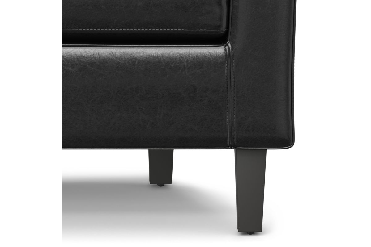 - Features curved back, sides with top stitching detail, dark brown solid wood legs and removable high density foam seat cushion