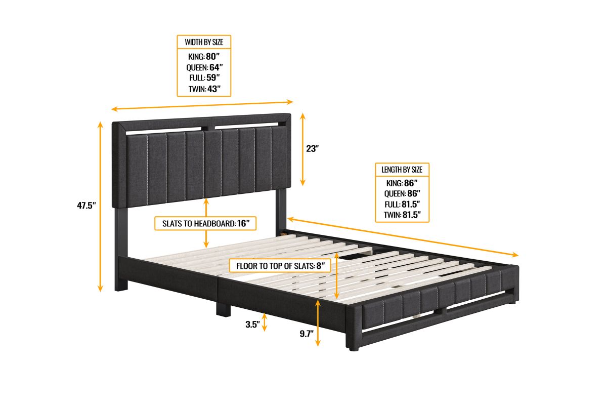 This stately upholstered platform bed frame features vertical channel tufting on the headboard with matching footboard that extends to the floor for a unique, polished focal piece for any bedroom. Frame is wrapped and slightly padded for a premium look and feel. Bed comes with a full 14-slat system that will support up to 700 lbs. No box spring or foundation required. Ships in 1 box for easy transport. Assembles in under 15 minutes, and all hardware is conveniently zipped up behind the headboard. 1 Year Limited Warranty.