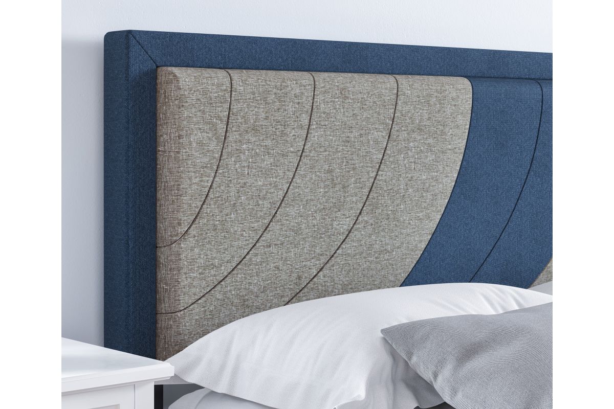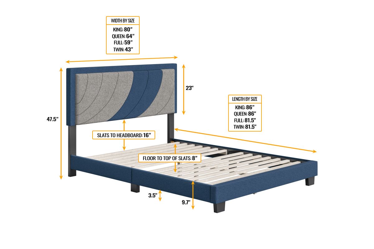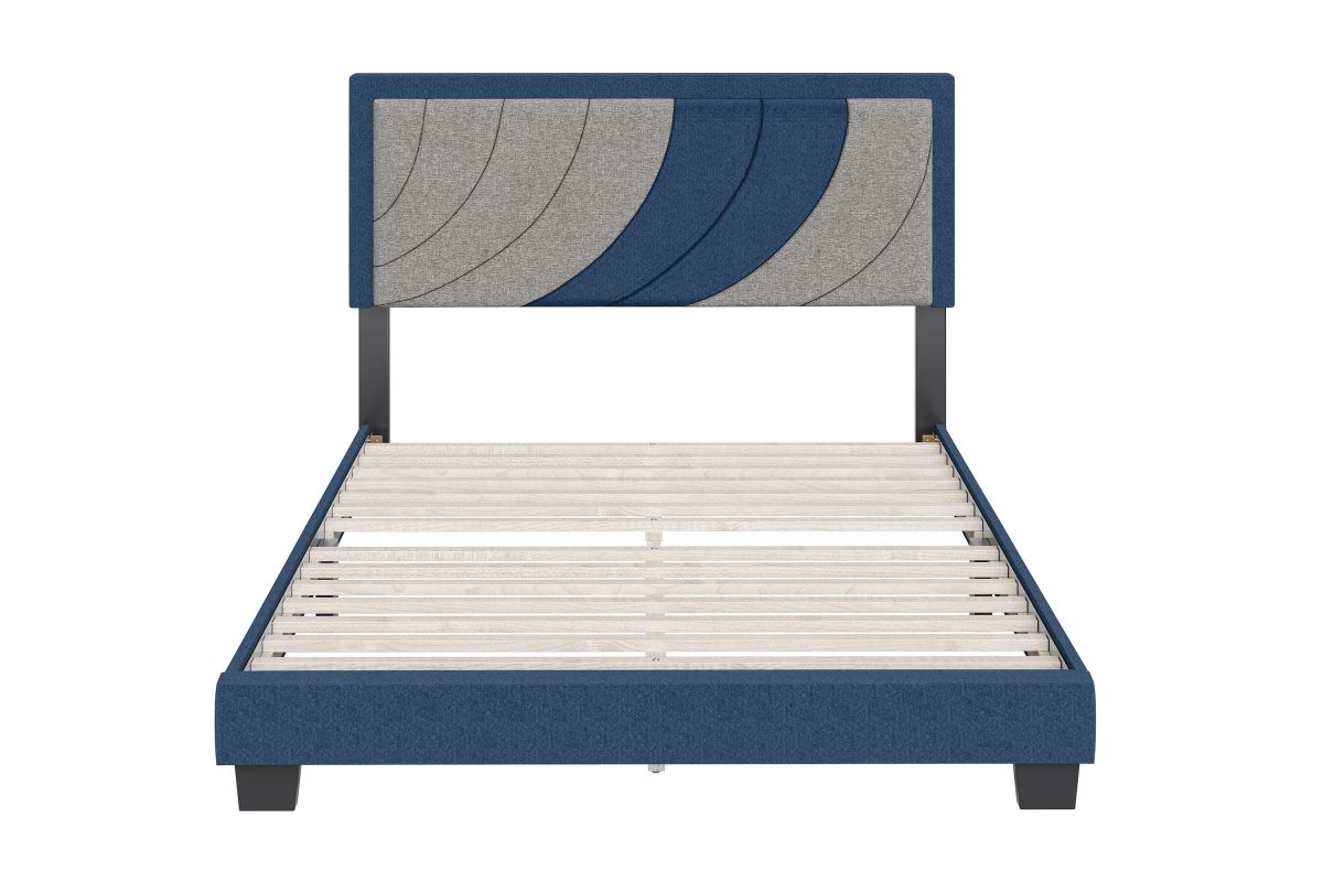 Sail away on this nautical-themed two-toned upholstered platform bed. The headboard features a bold color blocked design of an upward-moving wave to inspire only the best dreams. The headboard is framed in a contrast color, along with the sides and foot of the bed for a uniform, pulled-together look. Frame is fully wrapped and slightly padded for a premium look and feel. Bed comes with a full 14-slat system that will support up to 700 lbs. No box spring or foundation required. Ships in 1 box for easy transport. Assembles in under 15 minutes, and all hardware is conveniently zipped up behind the headboard. 1 Year Limited Warranty.