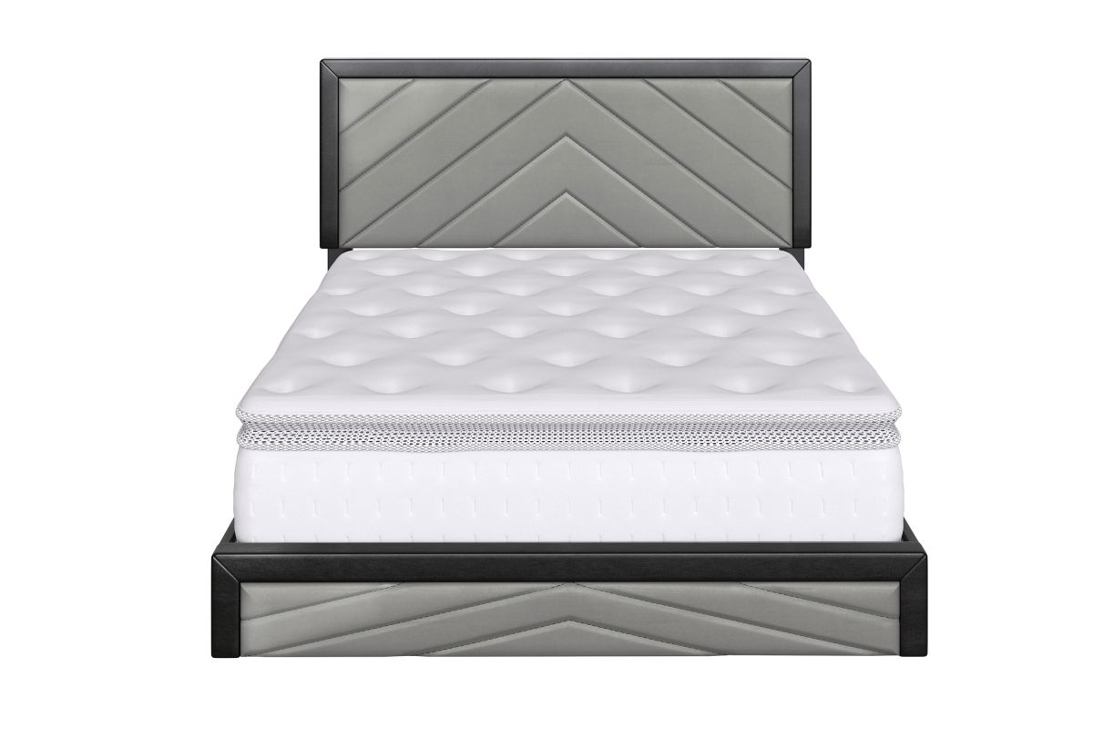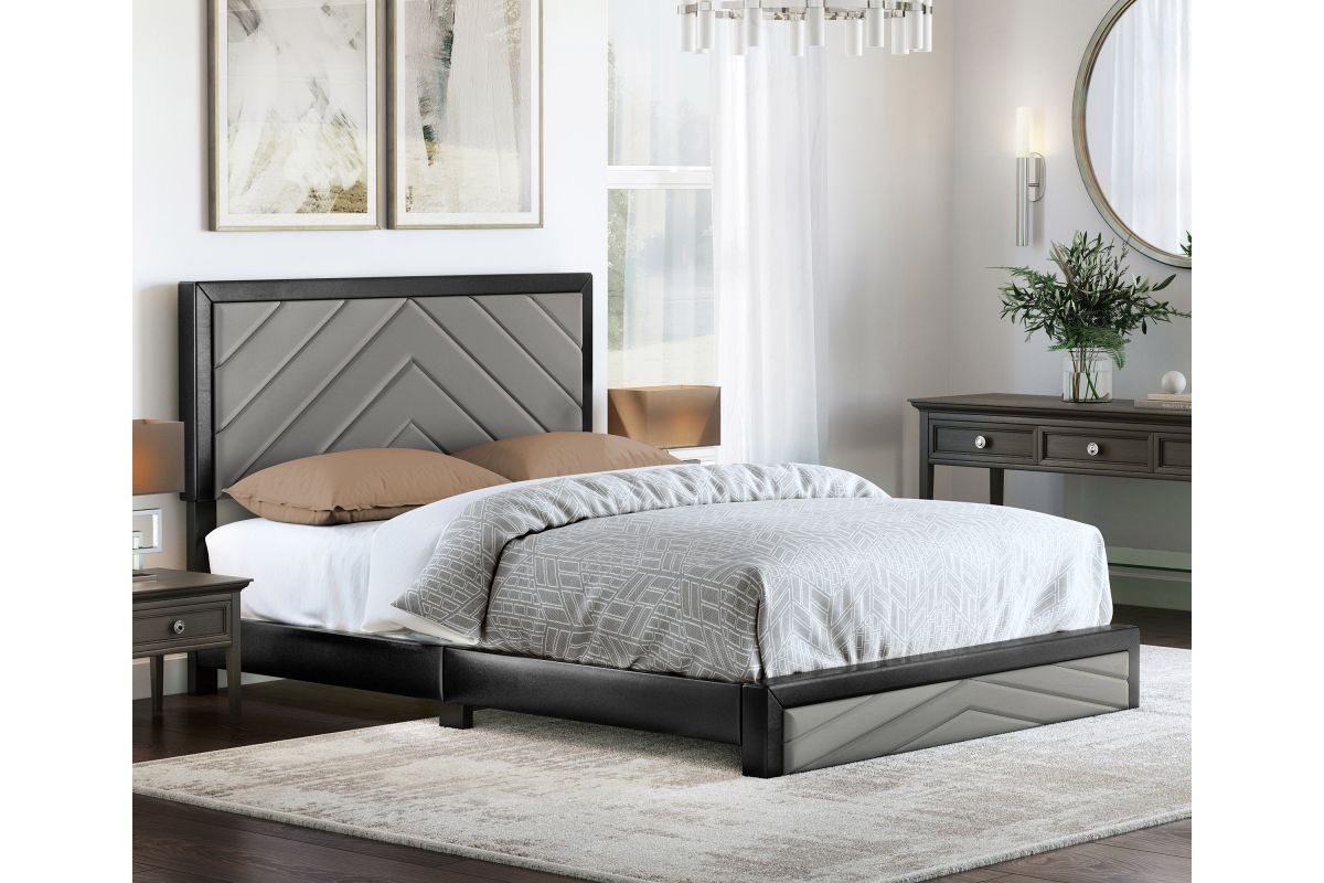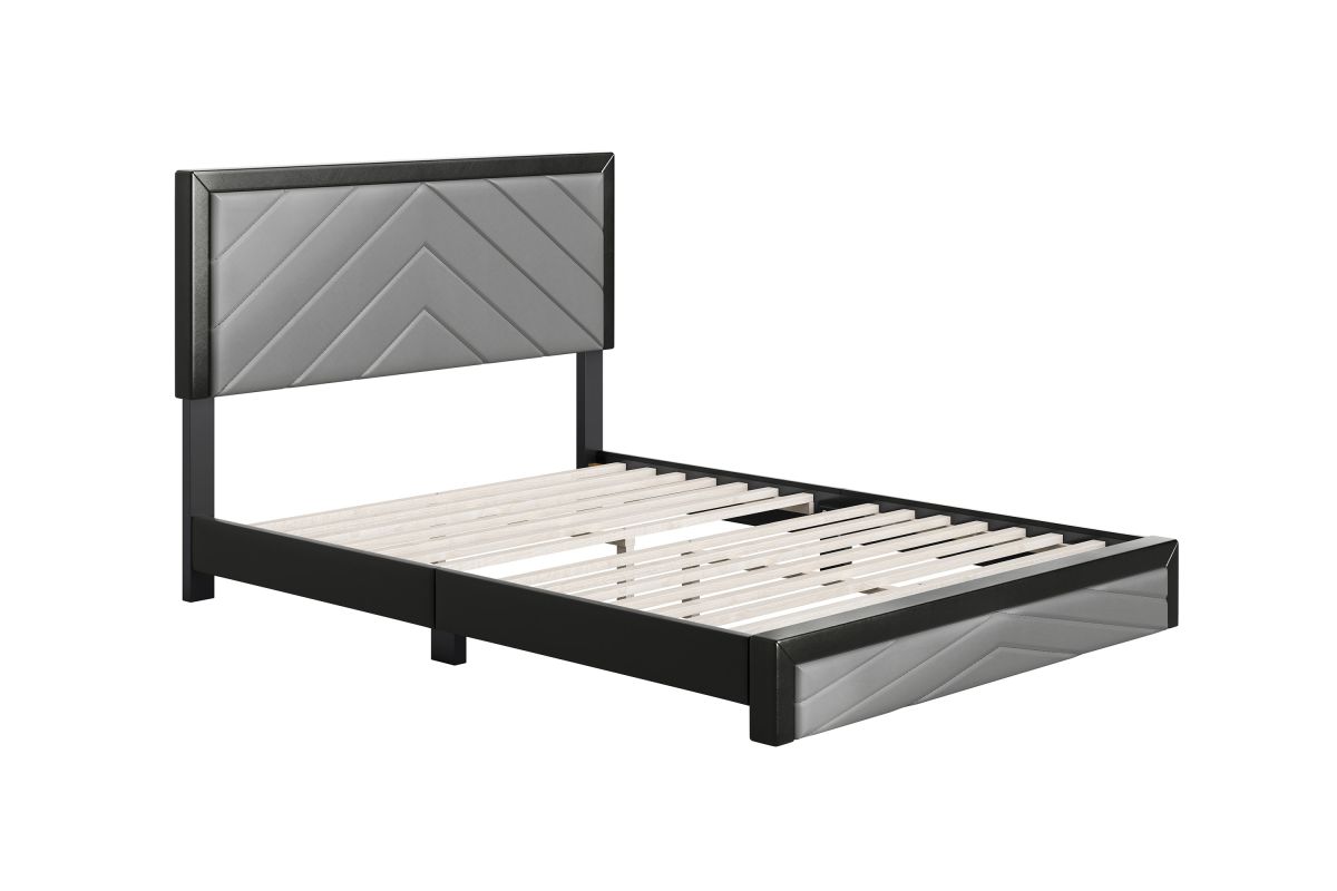 A chevron-themed headboard and footboard shows off the architectural stitching of this upholstered platform bed. The footboard extends to the floor for a unique, modern appeal. The bed comes with a 14-slat support system that holds up to 700 lbs. A box spring is optional with this bed. This platform bed ships in a single box, with easy-to-follow instructions to go from box to bed in under 30 minutes. Comes with a limited 1 year warranty.