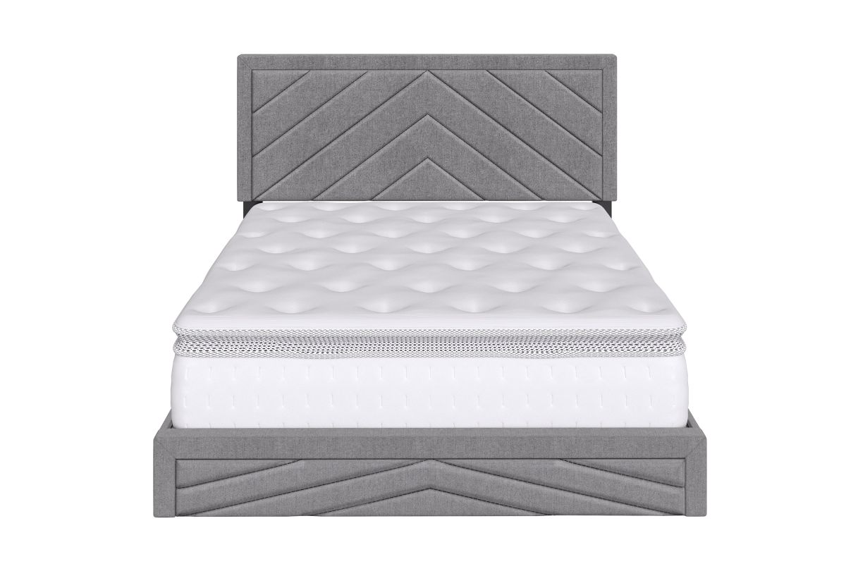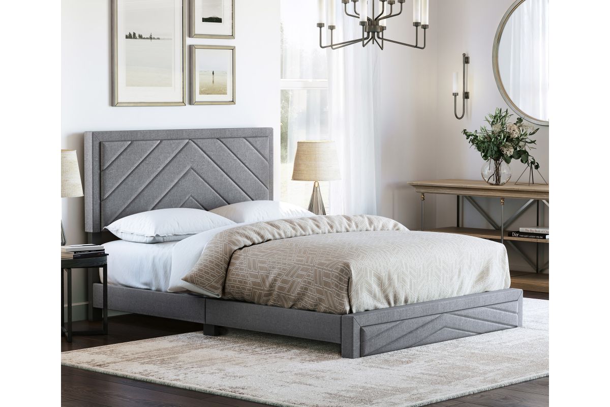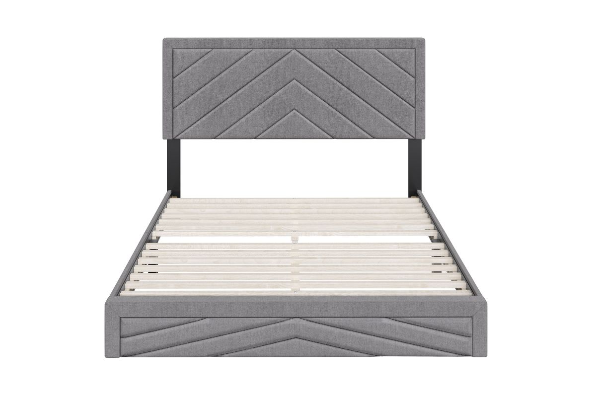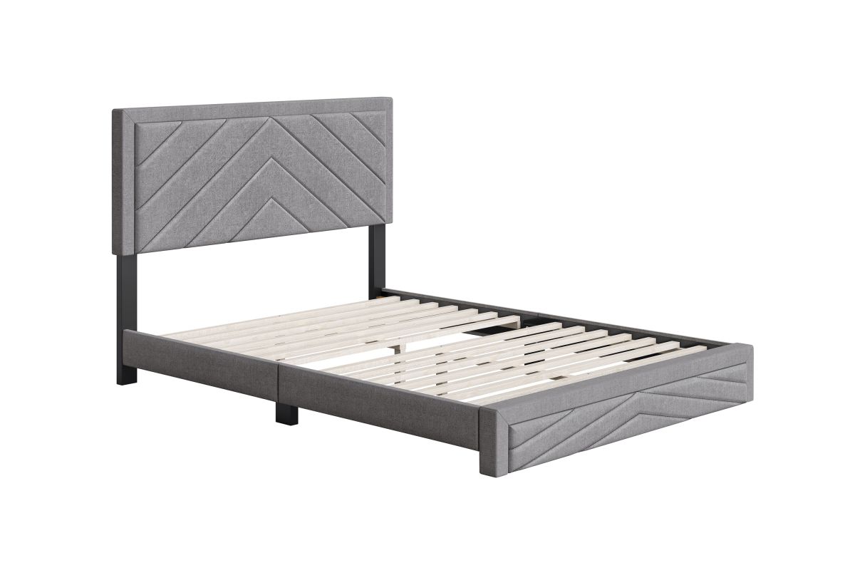 A chevron-themed headboard and footboard shows off the architectural stitching of this upholstered platform bed. The footboard extends to the floor for a unique, modern appeal. The bed comes with a 14-slat support system that holds up to 700 lbs. A box spring is optional with this bed. This platform bed ships in a single box, with easy-to-follow instructions to go from box to bed in under 30 minutes. Comes with a limited 1 year warranty.