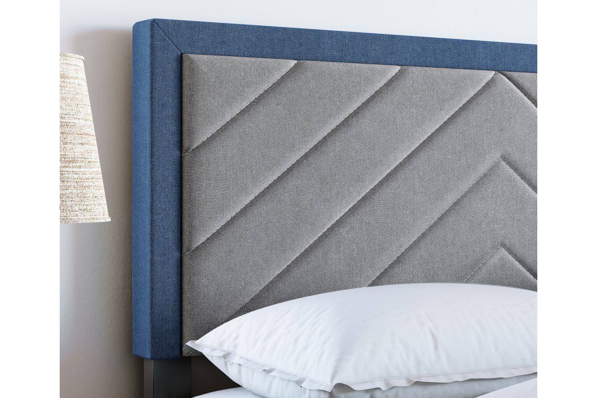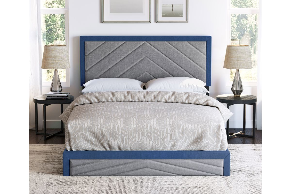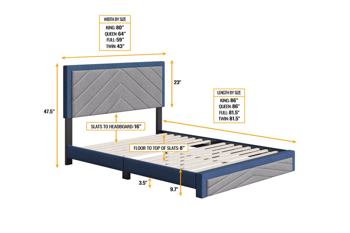 A chevron-themed headboard and footboard shows off the architectural stitching of this upholstered platform bed. The footboard extends to the floor for a unique, modern appeal. The bed comes with a 14-slat support system that holds up to 700 lbs. A box spring is optional with this bed. This platform bed ships in a single box, with easy-to-follow instructions to go from box to bed in under 30 minutes. Comes with a limited 1 year warranty.
