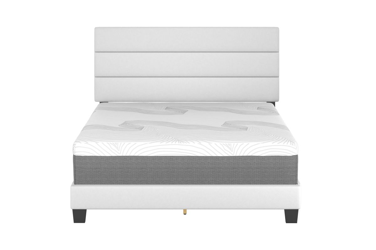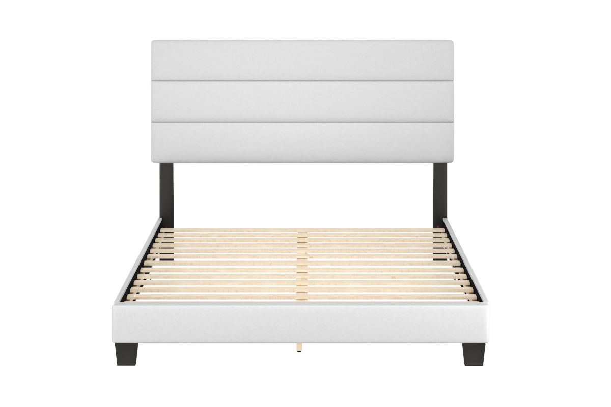 Clean, modern lines define this upholstered platform bed, making it the showpiece in any setting. The horizontal lines of the tri-panel headboard create a linear design concept you can easily accentuate with your favorite decor. Manufactured with high quality materials, the entire bed is upholstered and slightly padded for a premium look and feel.
