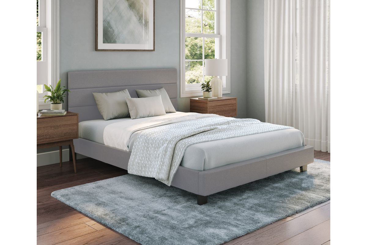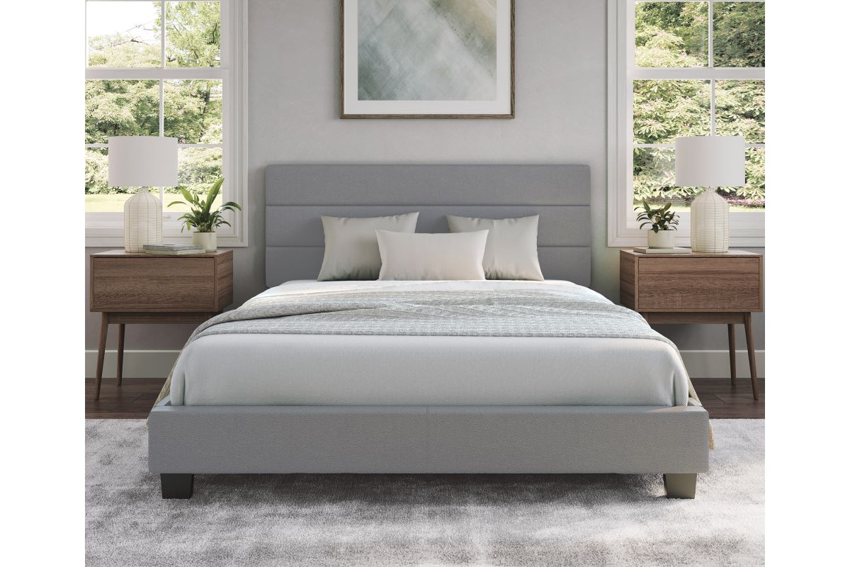 Clean, modern lines define this upholstered platform bed, making it the showpiece in any setting. The horizontal lines of the tri-panel headboard create a linear design concept you can easily accentuate with your favorite decor. Manufactured with high quality materials, the entire bed is upholstered and slightly padded for a premium look and feel.
