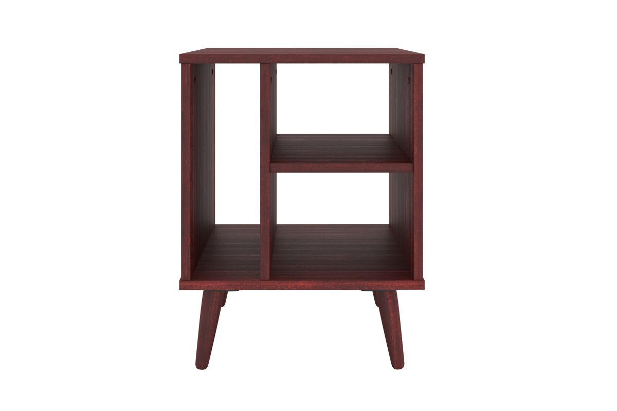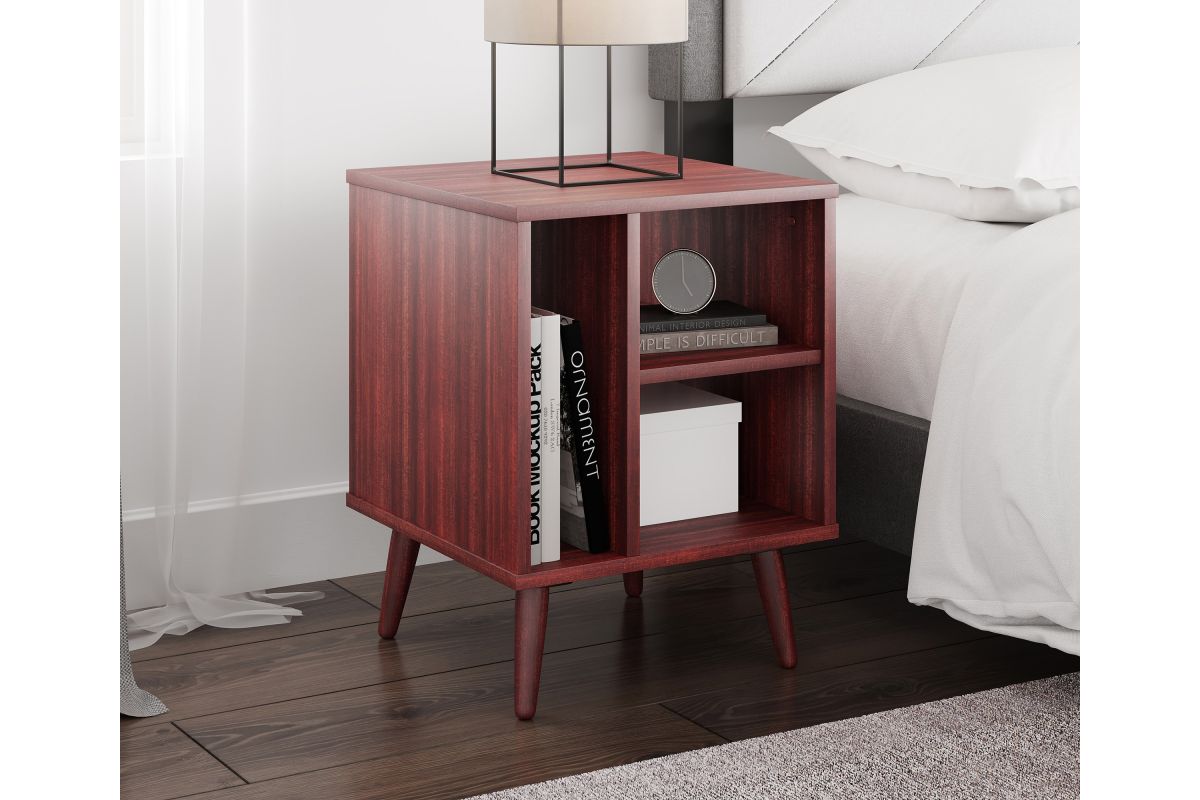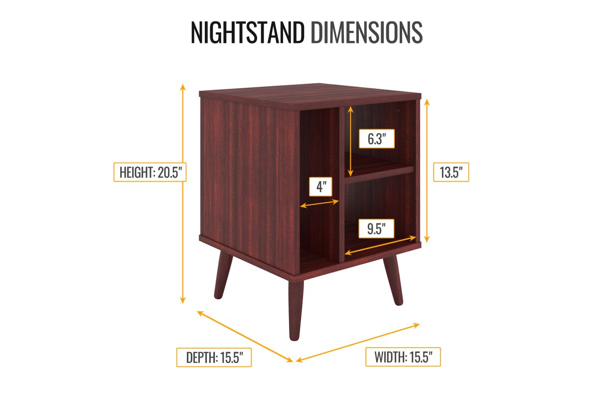 For a furniture piece as unique as your style, the Winston Mid-Century Modern Nightstand is the perfect fit. This retro end table features three open storage cubbies to keep your bedside essentials organized. Keep your phone or journal on the upper shelf, while the tall narrow section is perfect for vinyl records or books. The Warwick Mid-Century Modern Nightstand features solid wood tapered legs that add retro style; a laminated MDF upper keeps your table easy to clean. At just over 20 inches high, this wooden night table pairs perfectly with lower profile platform beds. Winston's effortless midcentury modern profile can add flair to your living room or home office, too, thanks to four different attractive wood-grain finishes. Keep your essentials at hand and in vintage style with the Winston Mid-Century Modern Nightstand. Ships to your door in a single box and assembles in 15 minutes (2 adults recommended). Assembly is required.