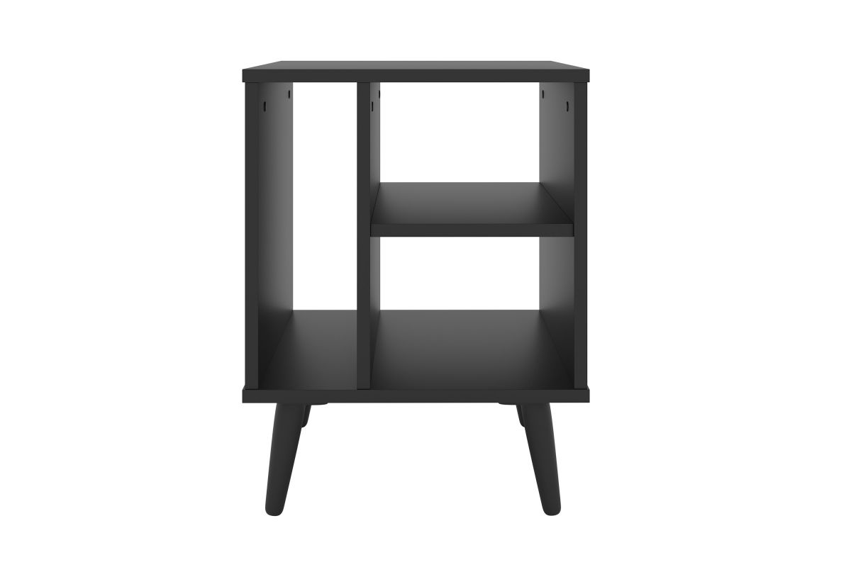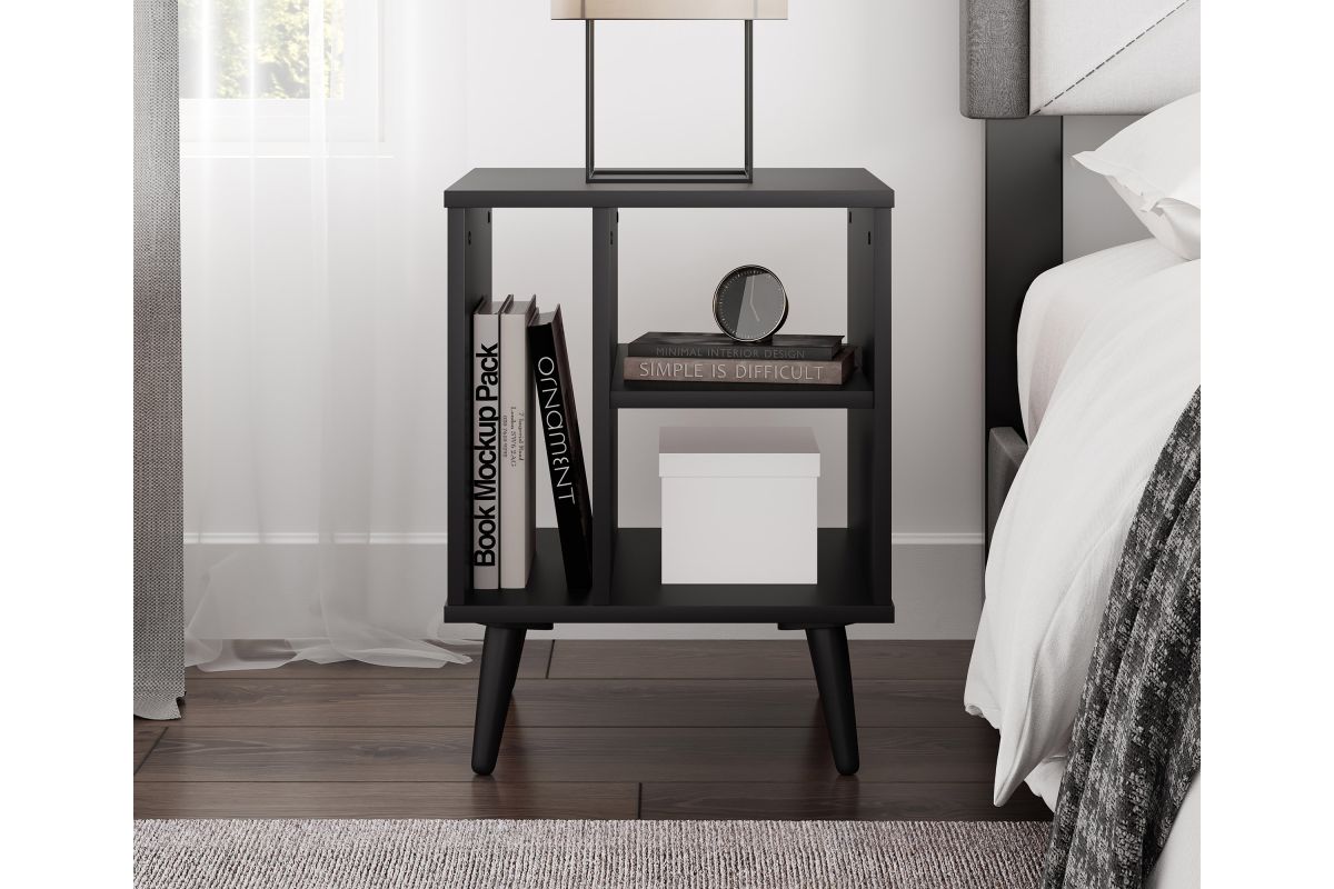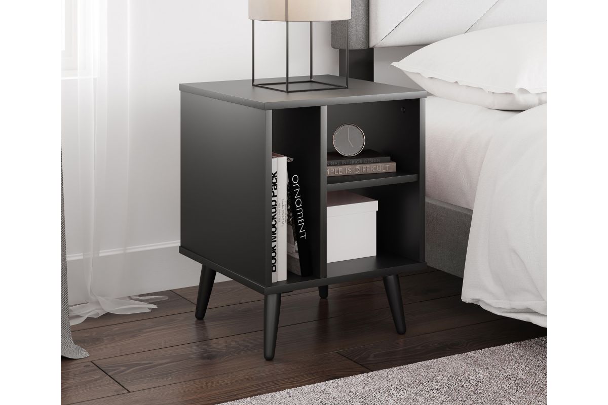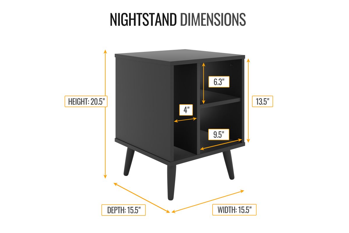 For a furniture piece as unique as your style, the Winston Mid-Century Modern Nightstand is the perfect fit. This retro end table features three open storage cubbies to keep your bedside essentials organized. Keep your phone or journal on the upper shelf, while the tall narrow section is perfect for vinyl records or books. The Winston Mid-Century Modern Nightstand features solid wood tapered legs that add retro style; a laminated MDF upper keeps your table easy to clean. At just over 20 inches high, this wooden night table pairs perfectly with lower profile platform beds. Winston's effortless midcentury modern profile can add flair to your living room or home office, too, thanks to four different attractive wood-grain finishes. Keep your essentials at hand and in vintage style with the Winston Mid-Century Modern Nightstand. Ships to your door in a single box and assembles in 15 minutes (2 adults recommended). Assembly is required.