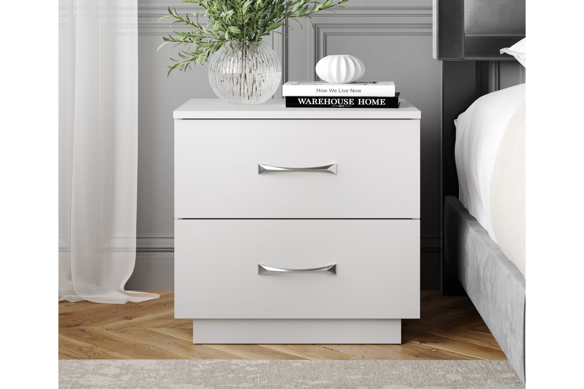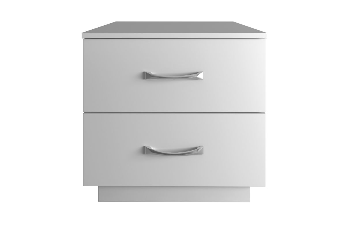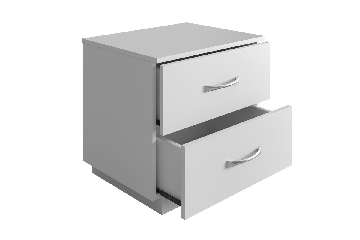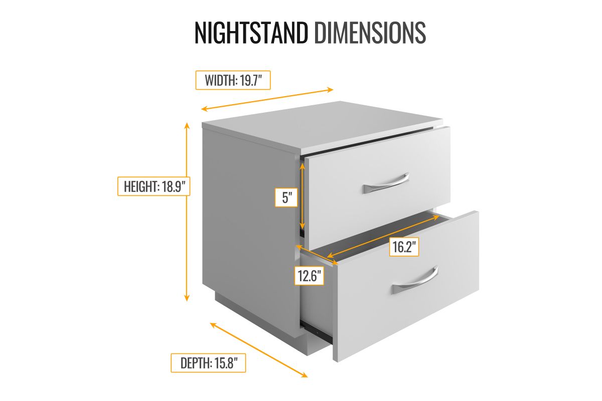 Sleek and modern, the Hollister Two-Drawer Nightstand is your elegant storage solution. This bedside table features an ultra-stable pedestal base and smooth, easy-clean laminated MDF construction. Two easy-glide drawers provide plenty of storage for your reading glasses and phone, and the Hollister's brushed nickel drawer pulls are a modern accent. At just under 19 inches high, the Hollister Two-Drawer Nightstand keeps your bedtime essentials within arm's reach. Not just for bedrooms: this wooden end table adds functionality to your living room, home office, or dorm room. No matter what you need to store, the Hollister Double Drawer Nightstand keeps it neatly out of sight. Assembles in under 15 minutes with all tools included (2 adults recommended for assembly). Each Nightstand ships conveniently in 1 box. Assembly is required.