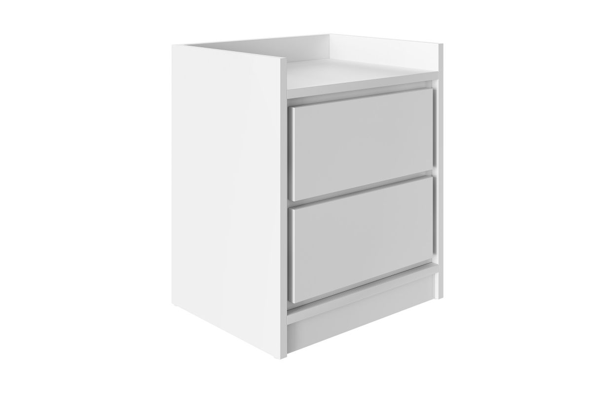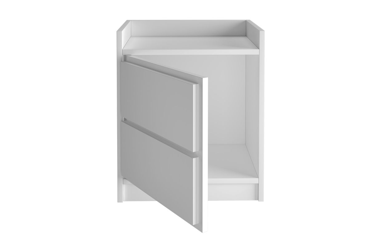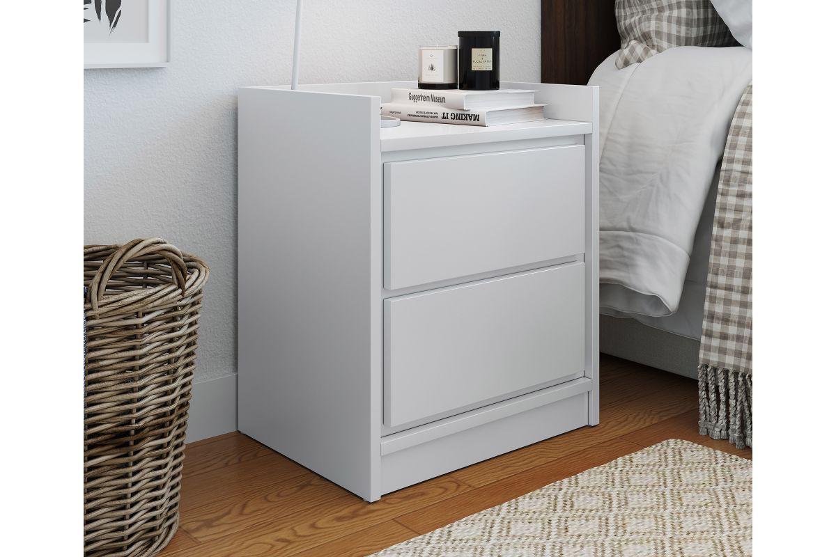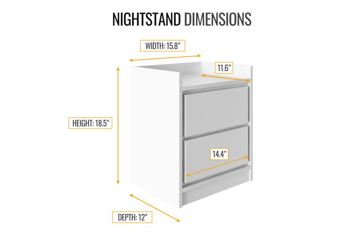 For a simple, economical and dependable bedside storage solution, look no further than the Vincenzo Nightstand. Front panel may look like it has 2 drawers, but instead has an easy-to-open push-spring door that provides a ton of free storage space. At 18.5" high, it is the perfect height for lower platform beds, or any guest bed. The top edge is raised on the sides and back to prevent items from rolling off, which is super helpful when you need to reach for your glasses or phone when you wake up. Fabricated with durable particle board, the black and white versions are lacquered, the walnut finish is laminate. Assembles easily in minutes, only needing a Phillips screwdriver and hammer. With this cute little nightstand, you"ll be set up for bedside storage in no time! Assembly is required.