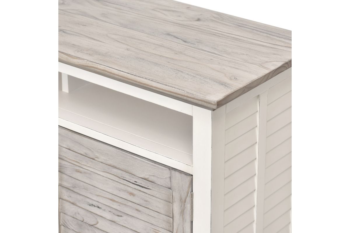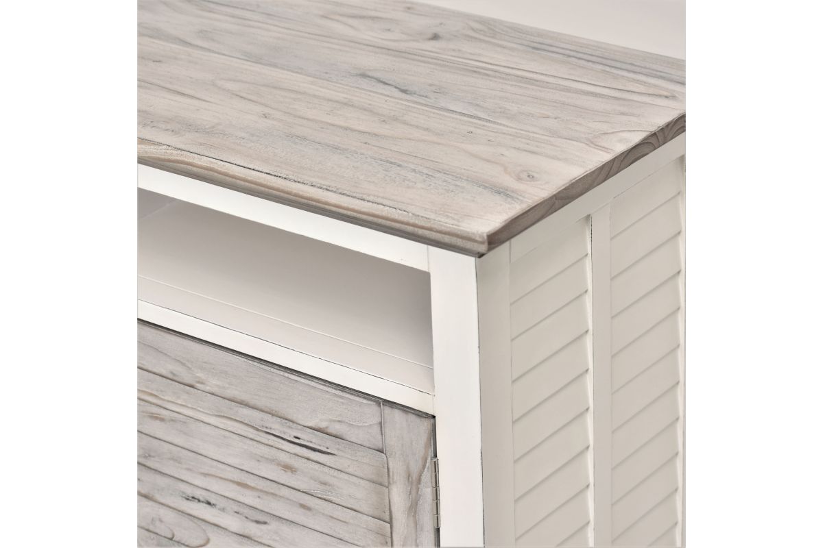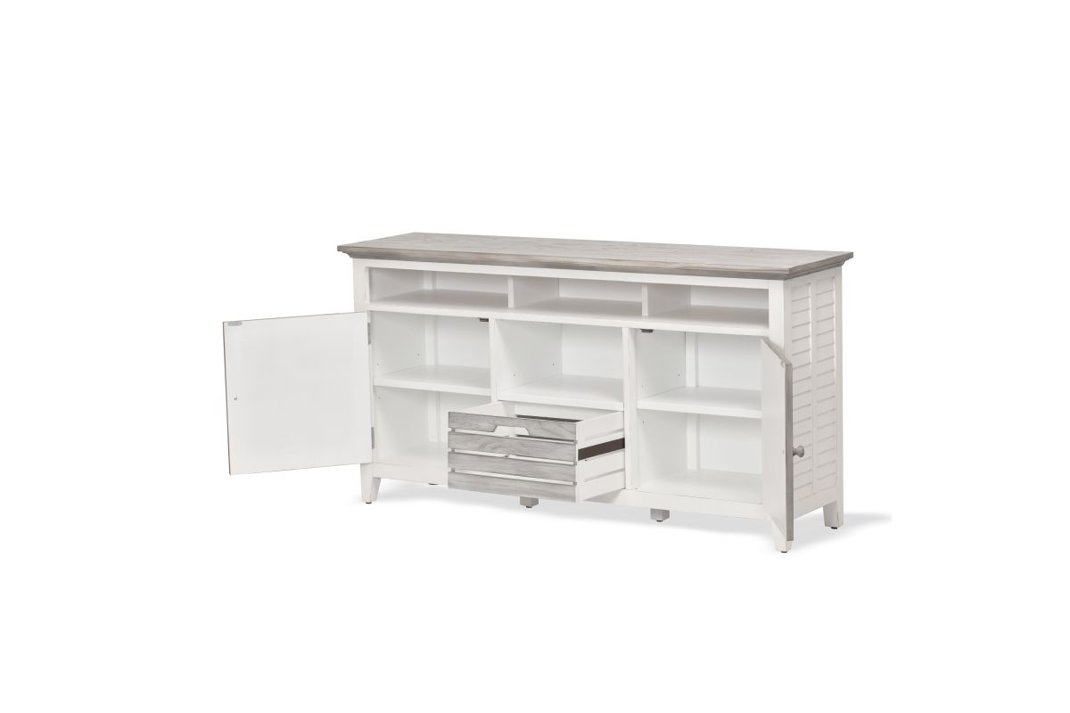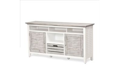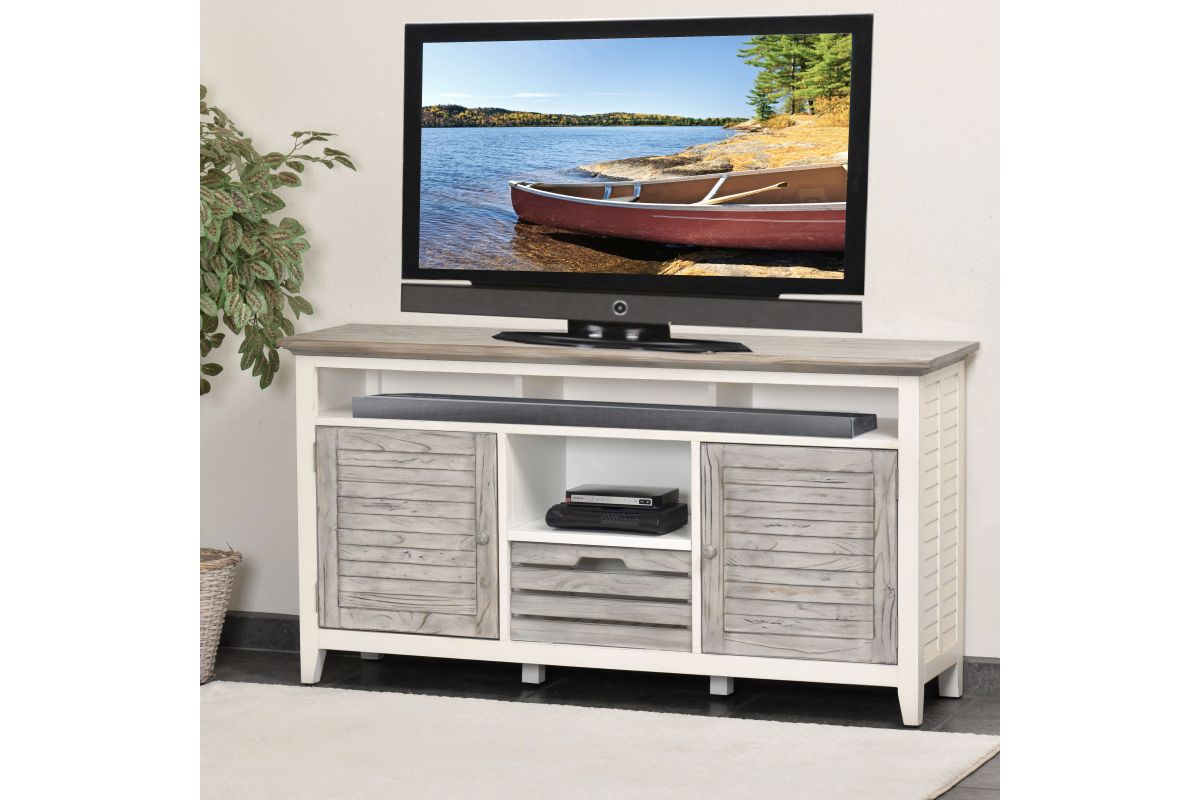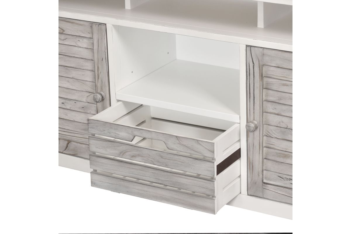 Add style and storage to your home with the Islamorada Entertainment Center. Crafted from solid Mindi wood, this sleek gray/white center features slightly distressed wood and finish with visible wood vein patterns - perfect for bringing a touch of rustic charm to your home. Its drawers feature dovetail joints and soft-closing ball bearing glides, while its wooden drawer knobs add a classic touch. Eco-friendly and safe, this piece will make a perfect addition to your living room.