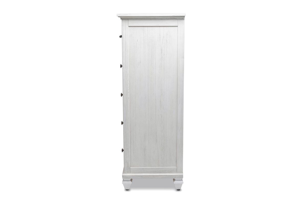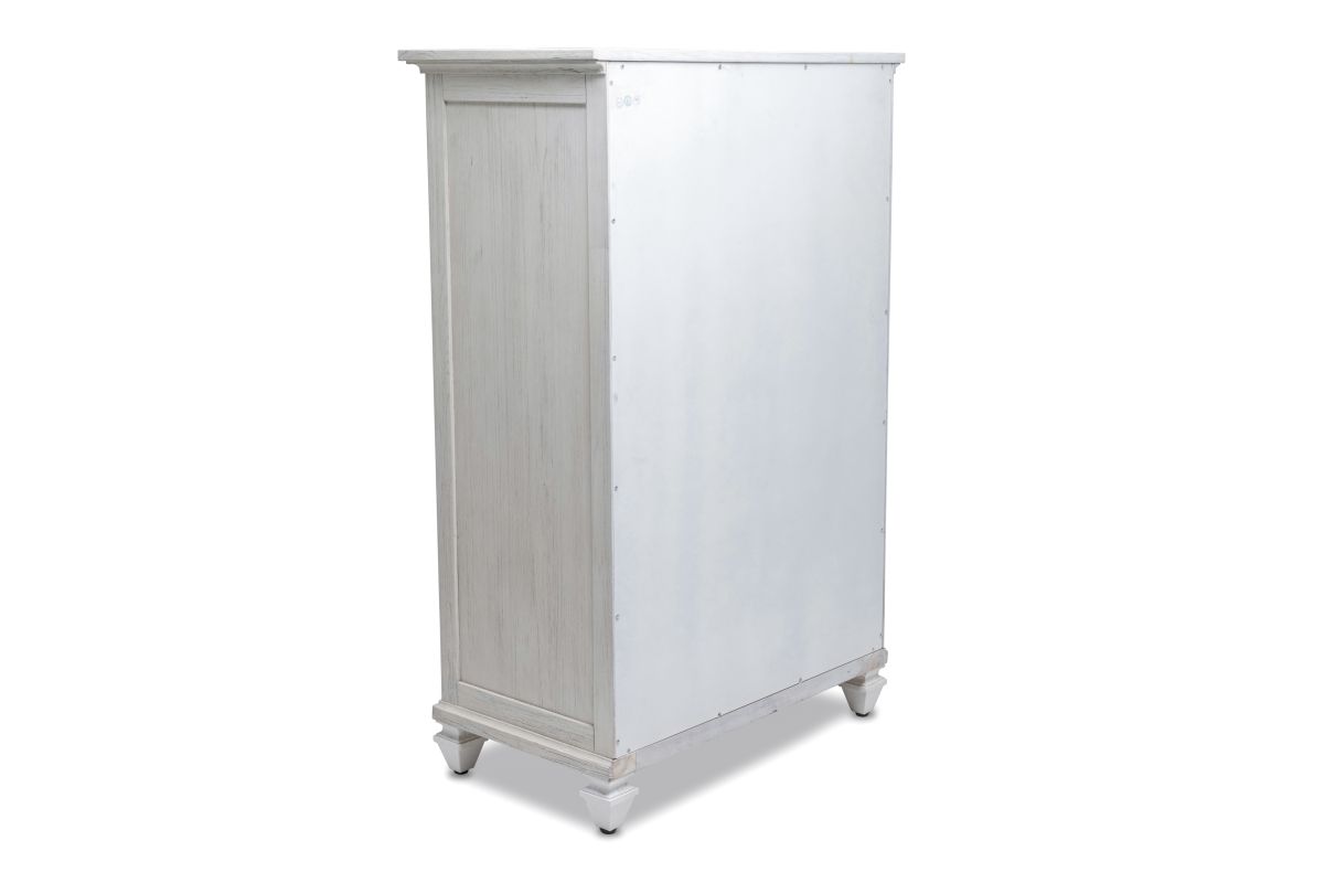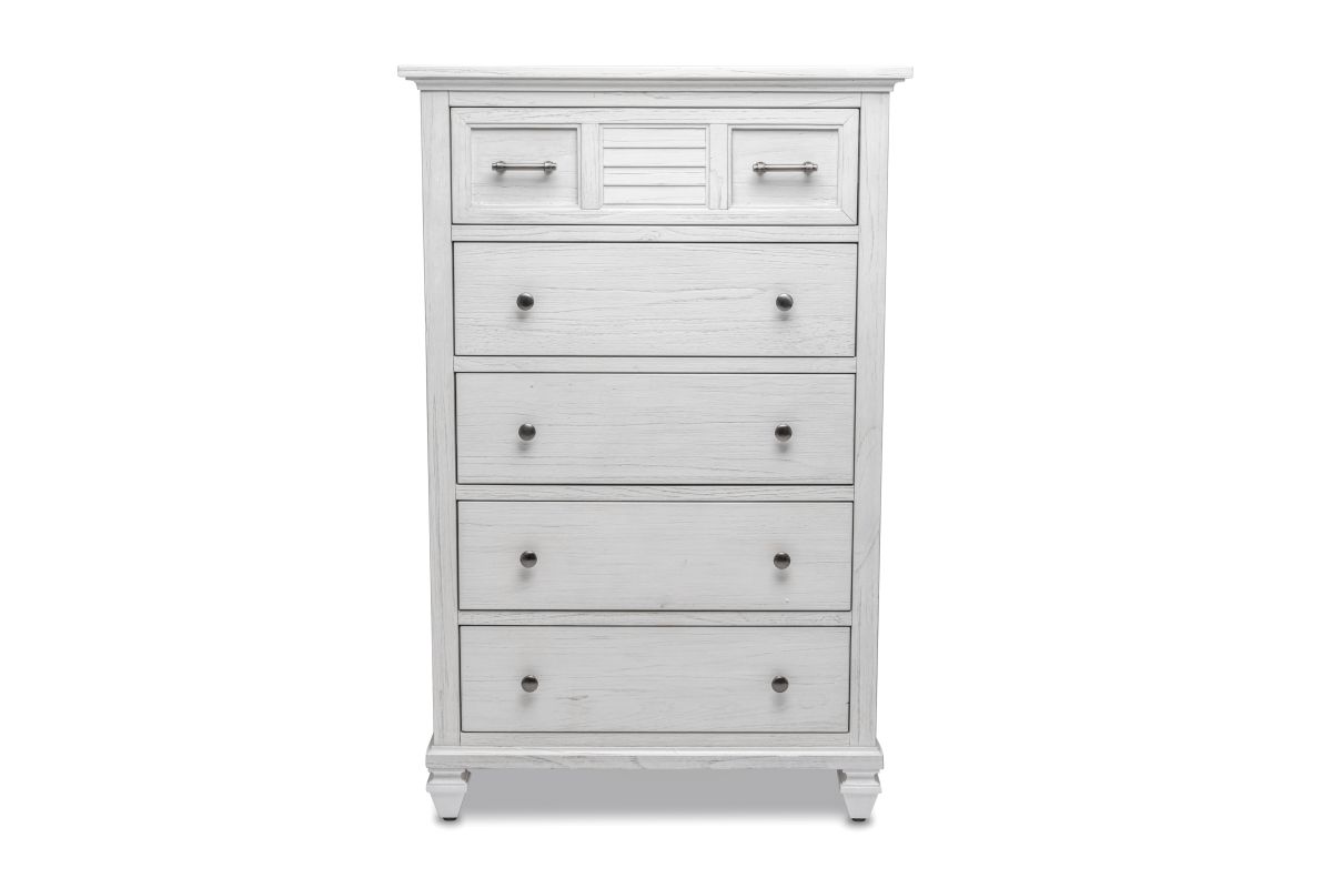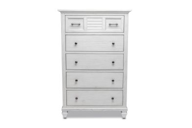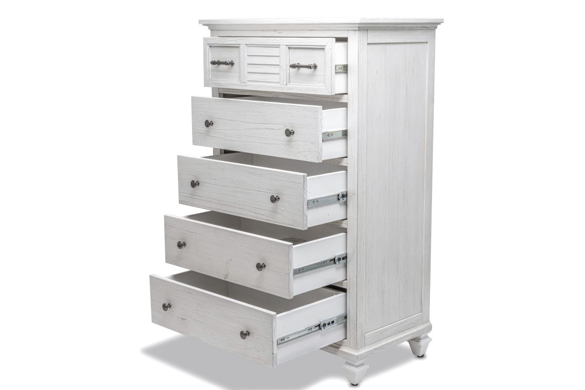 Transform your bedroom into a serene and stylish haven with the Surfside 5 Drawer Chest. Featuring a distressed finish, this classic chest is crafted from solid Mindi Wood, delivering durability and sophistication. Each drawer features dovetail joints and full extension glides, while the brushed painted exterior provides a timeless, elegant look. Unpack, assemble and enjoy the peaceful style of the Surfside 5 Drawer Chest. Assembly is required.