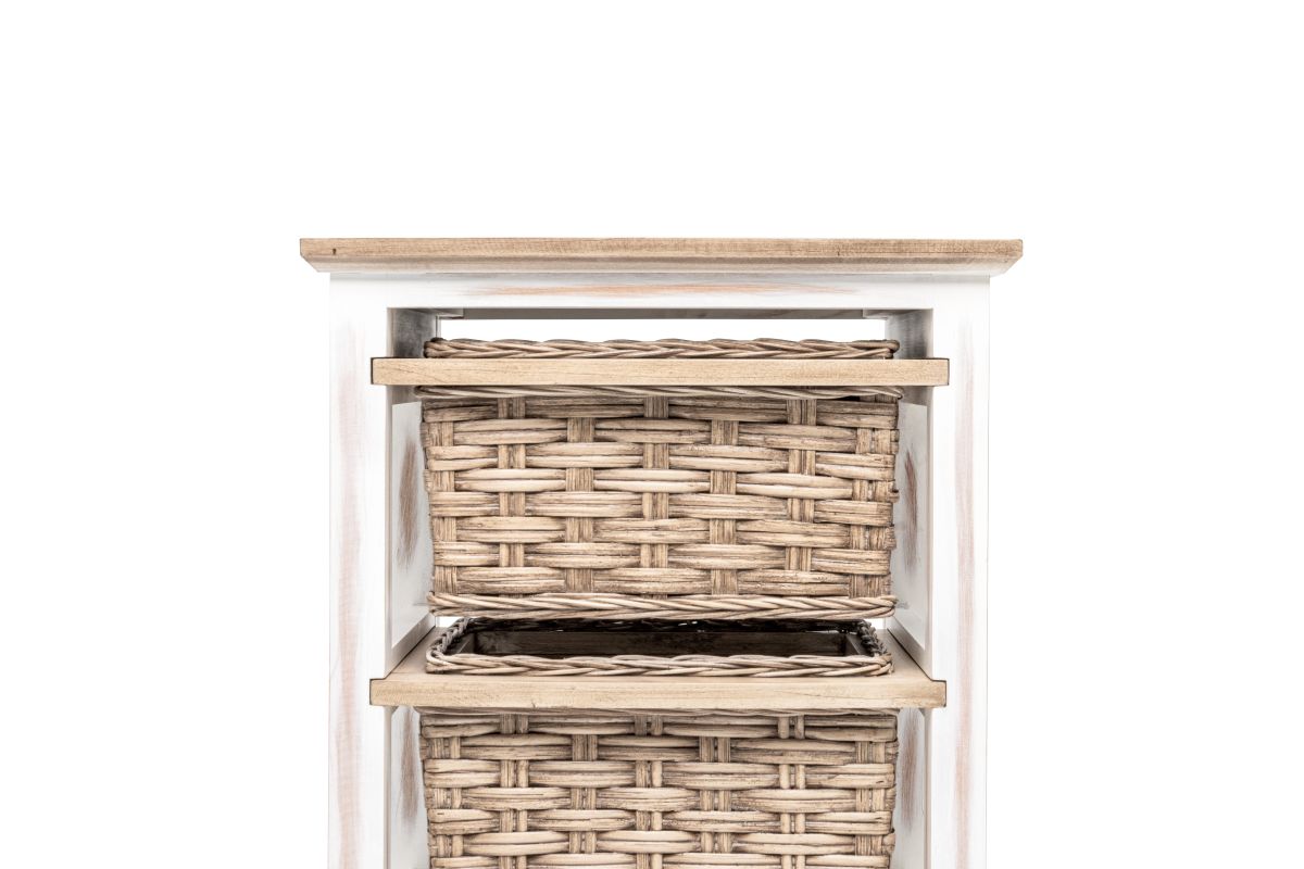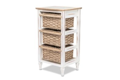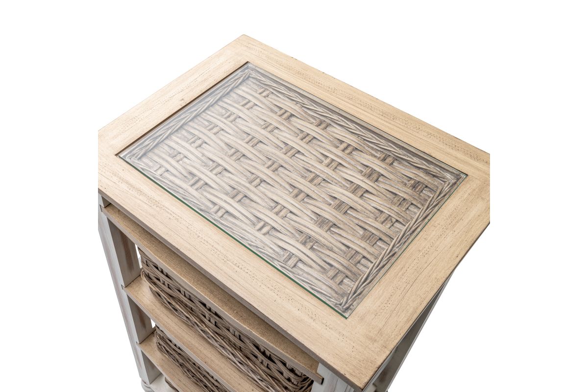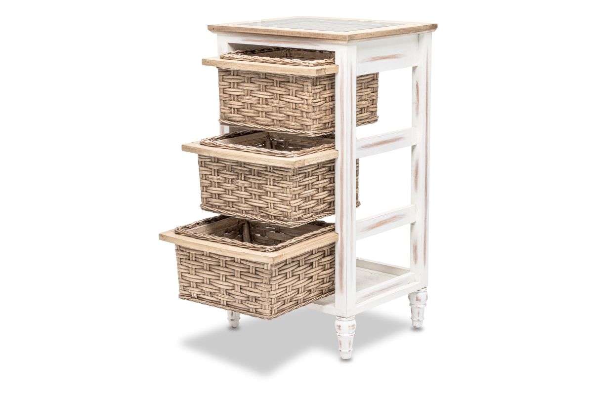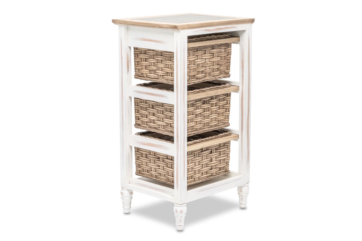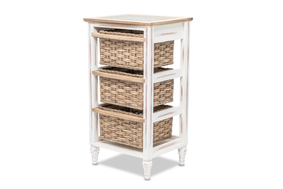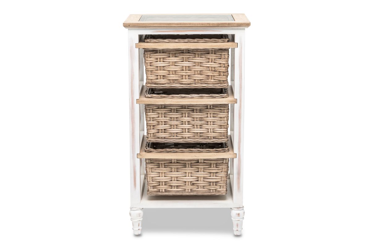 Organize your space without sacrificing style with this beautiful Island Breeze 3-Basket Storage Cabinet. Boasting a classic combination of white and brown and a slightly distressed finish, the cabinet is expertly crafted from wood and seagrass for a truly unique look. The baskets run on wood for easy access and convenience, while the inset glass, woven top, and detachable feet ensure a design that is as practical as it is stylish.