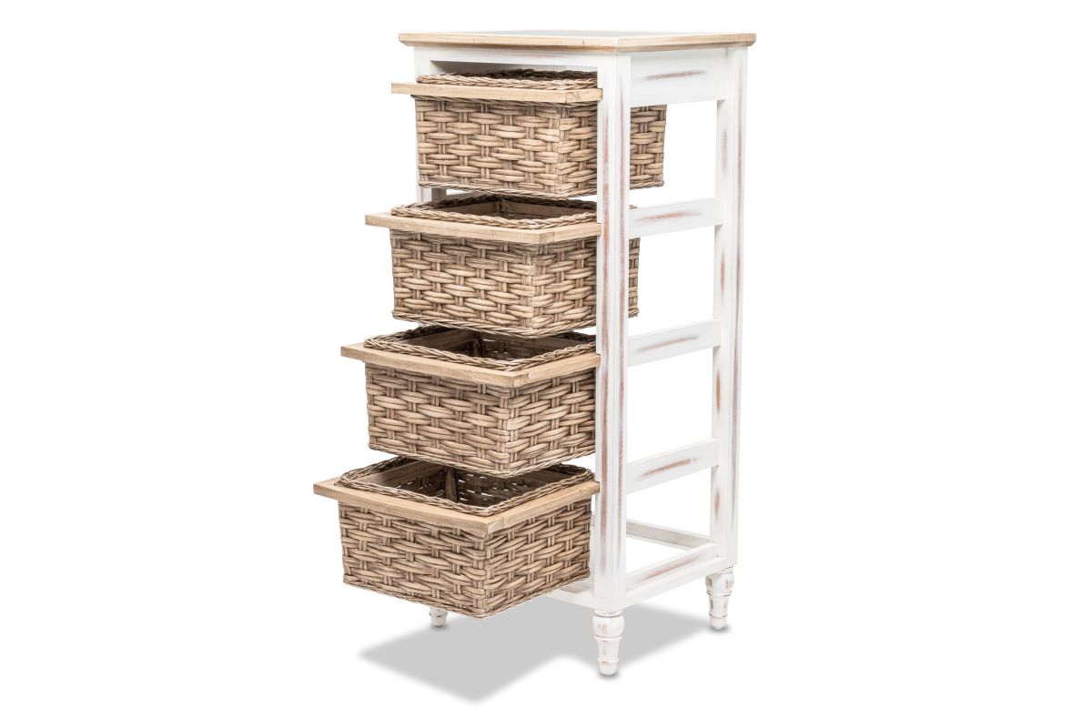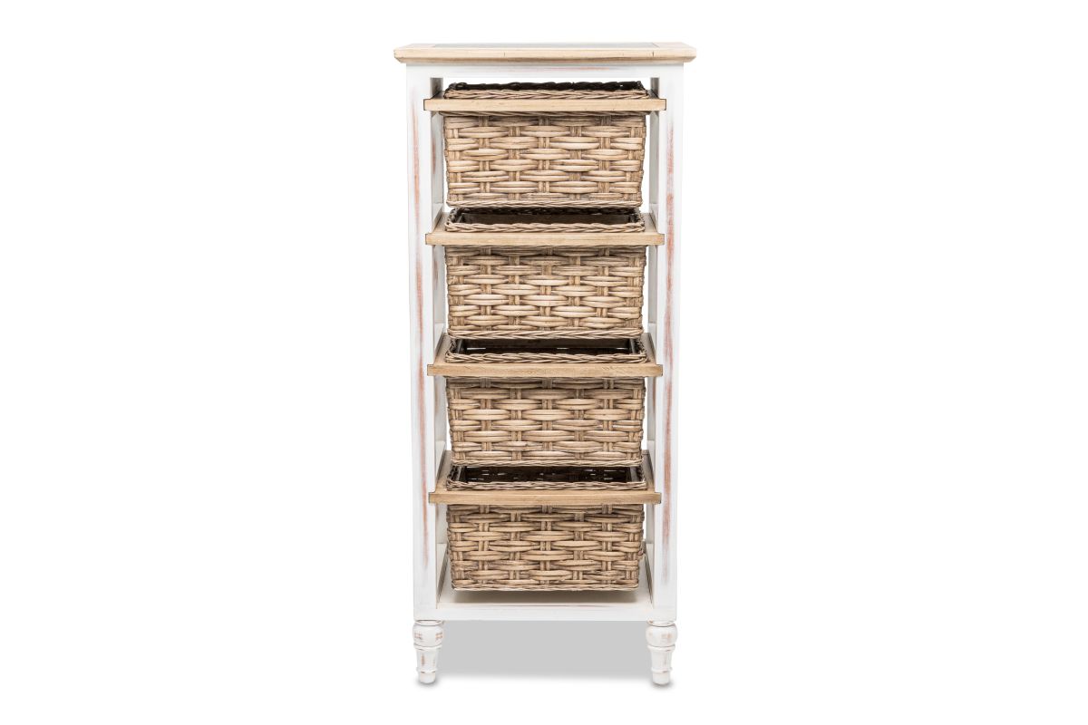 Discover the perfect storage solution for your home with this Island Breeze 4-Basket Vertical Storage Cabinet. Featuring a slightly distressed finish, wood and seagrass primary materials, and four baskets that run on wood, this stylish piece will add charm and extra storage to any room. Plus, it has an inset glass top, and the feet install with no tools in under one minute!