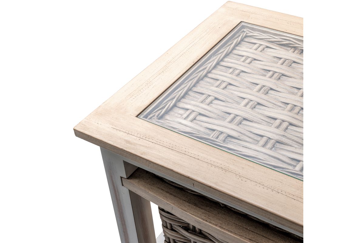 - This item has an inset glass that sits above the woven top