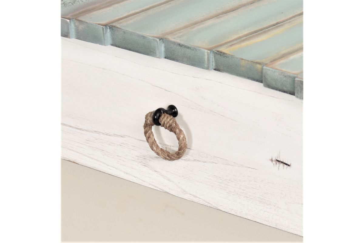 - Drawers use ring pulls made of natural rope