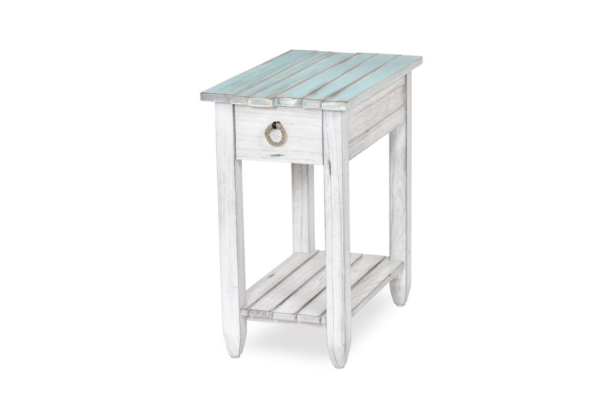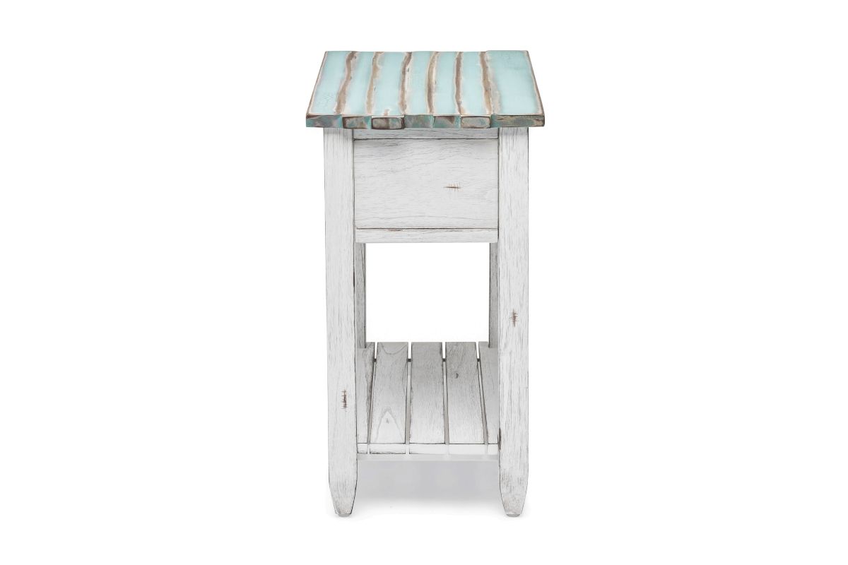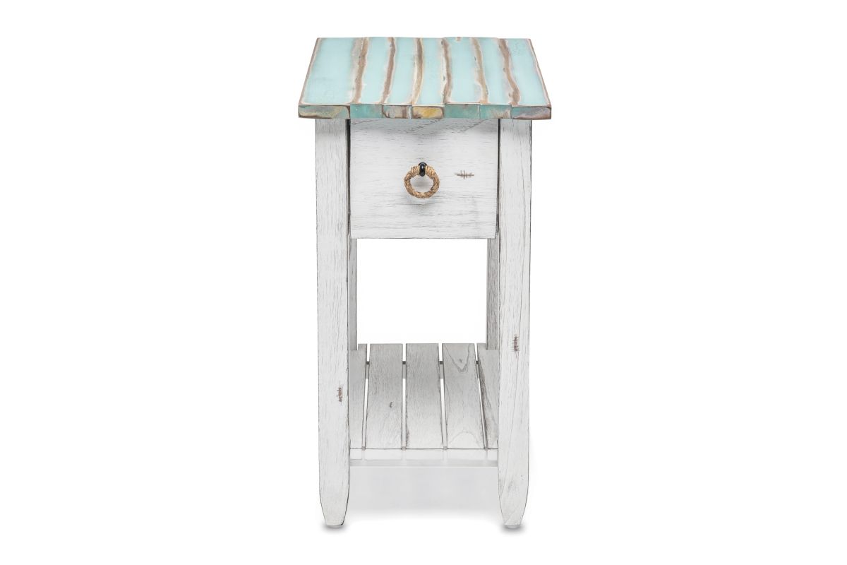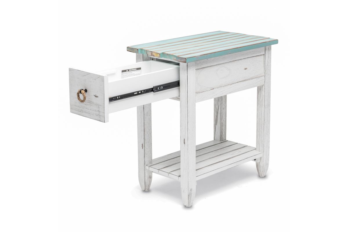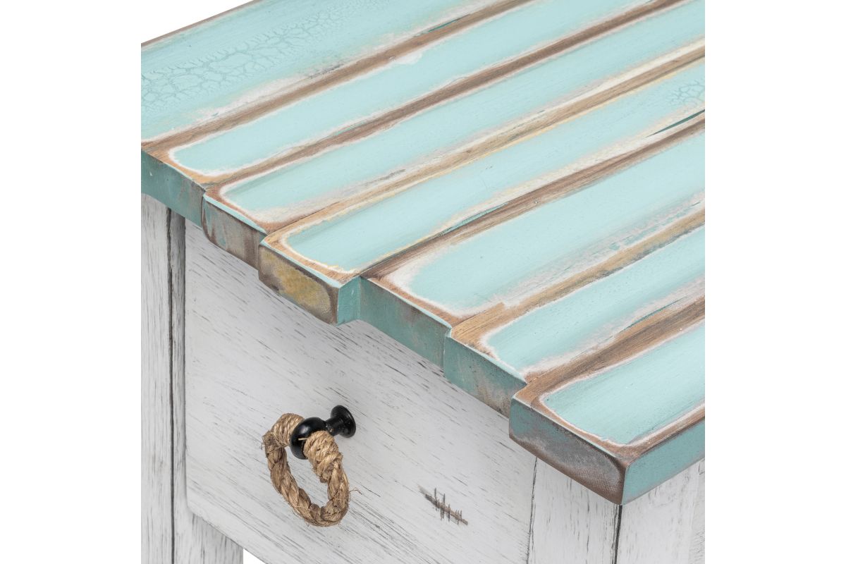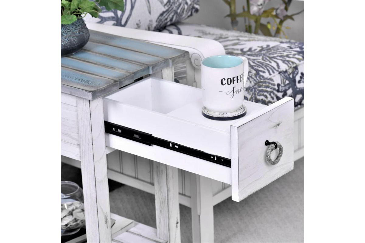 Make a statement in your living space with the Picket Fence Chairside Table. This beautiful piece of furniture has an eye-catching distressed finish, made with kiln-dried solid wood and Mindi Wood/White Cedar. It features a spacious drawer built with dovetail joints and full extension ball bearing glides with a stylish ring pull of natural rope. Enjoy easy assembly with legs and shelf shipped detached with all necessary hardware.