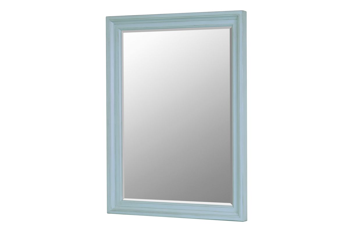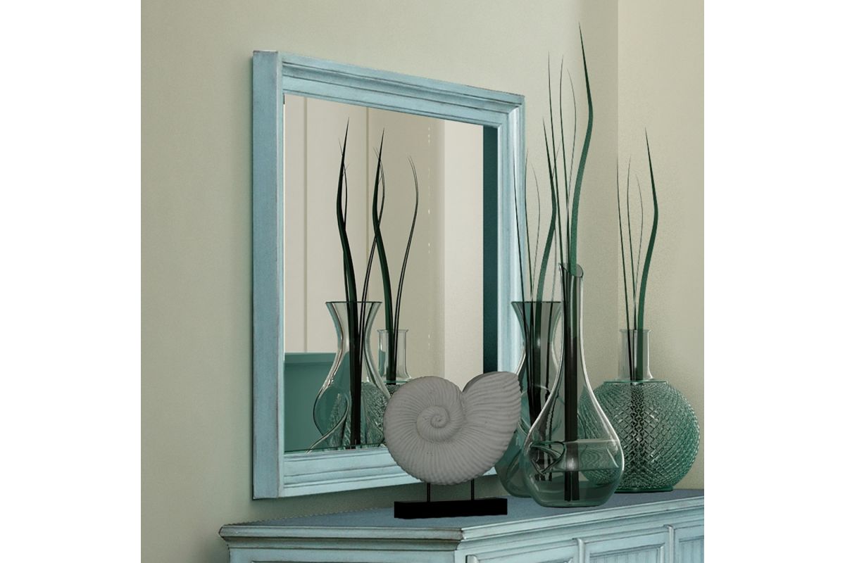 Discover creative style and superior quality with the Monaco Mirror. Crafted with Mindi Wood, this mirror's distressed white or blue exterior and light glazed edges add character to any setting. Plus, its silver or blue coating offers an enhanced image for your bedroom, bathroom, or living room. This wall-hanging mirror is easy to mount with its pre-installed slots - hardware not included.