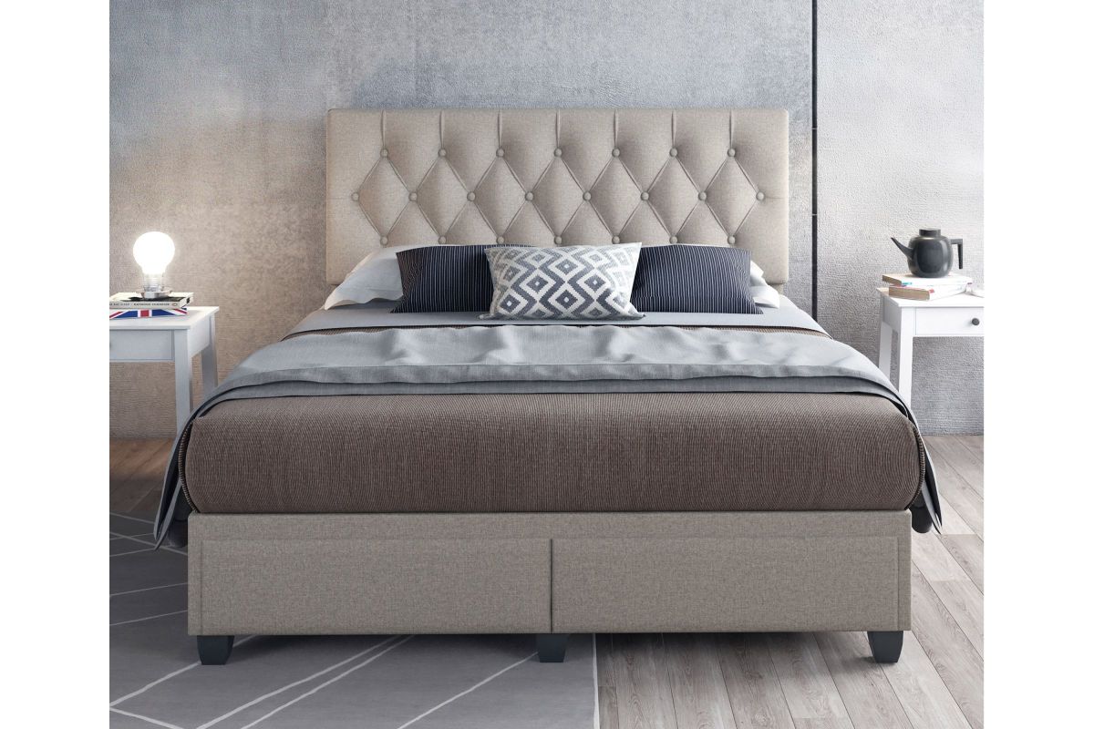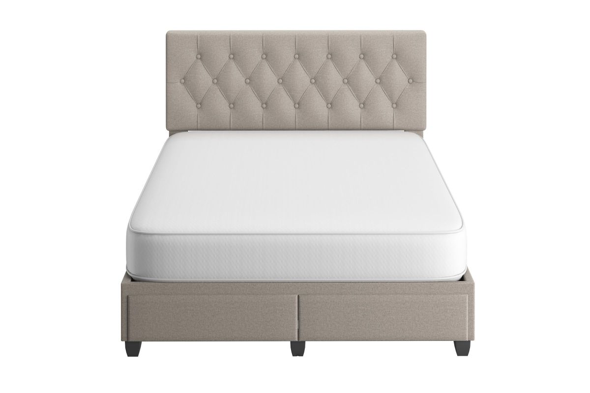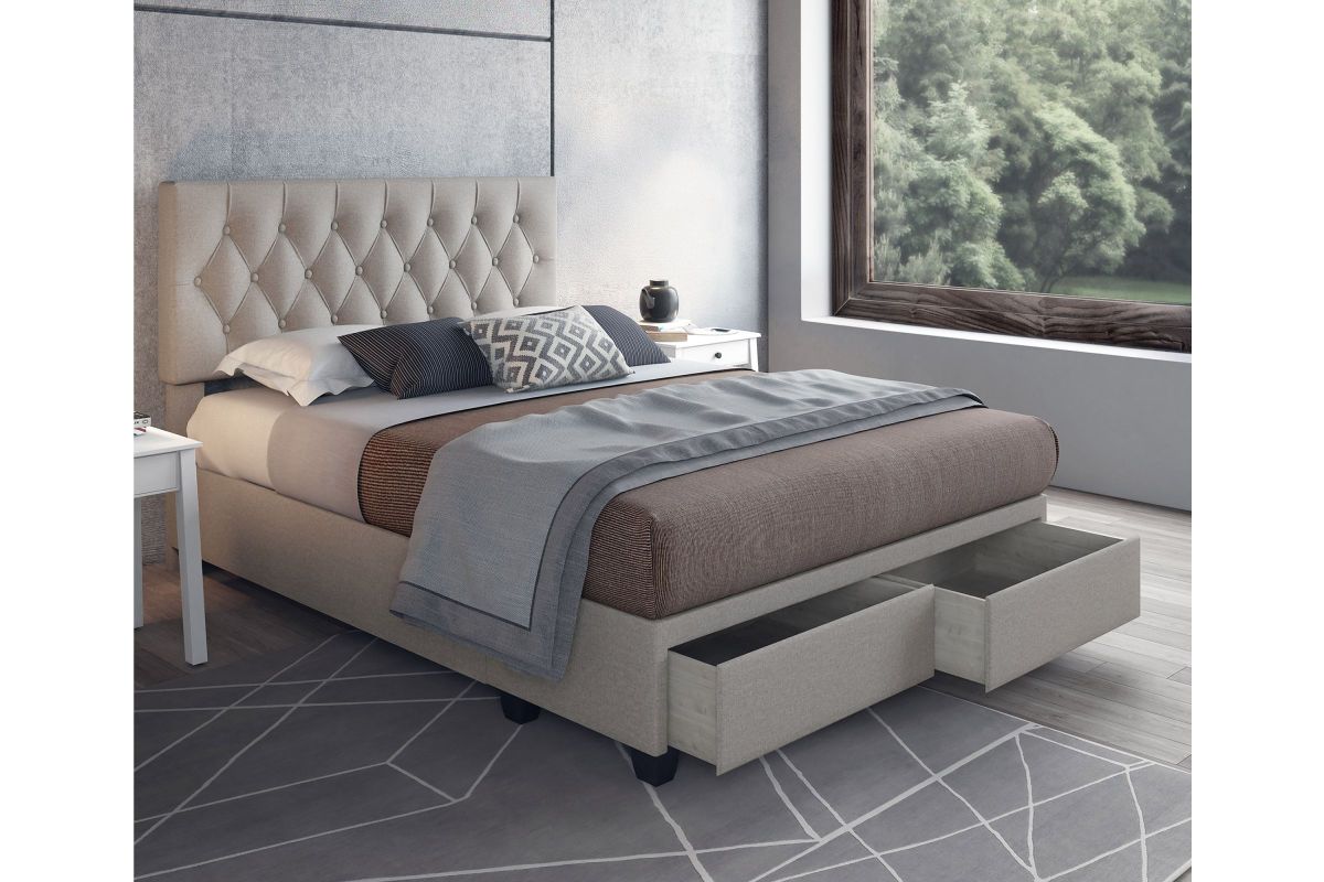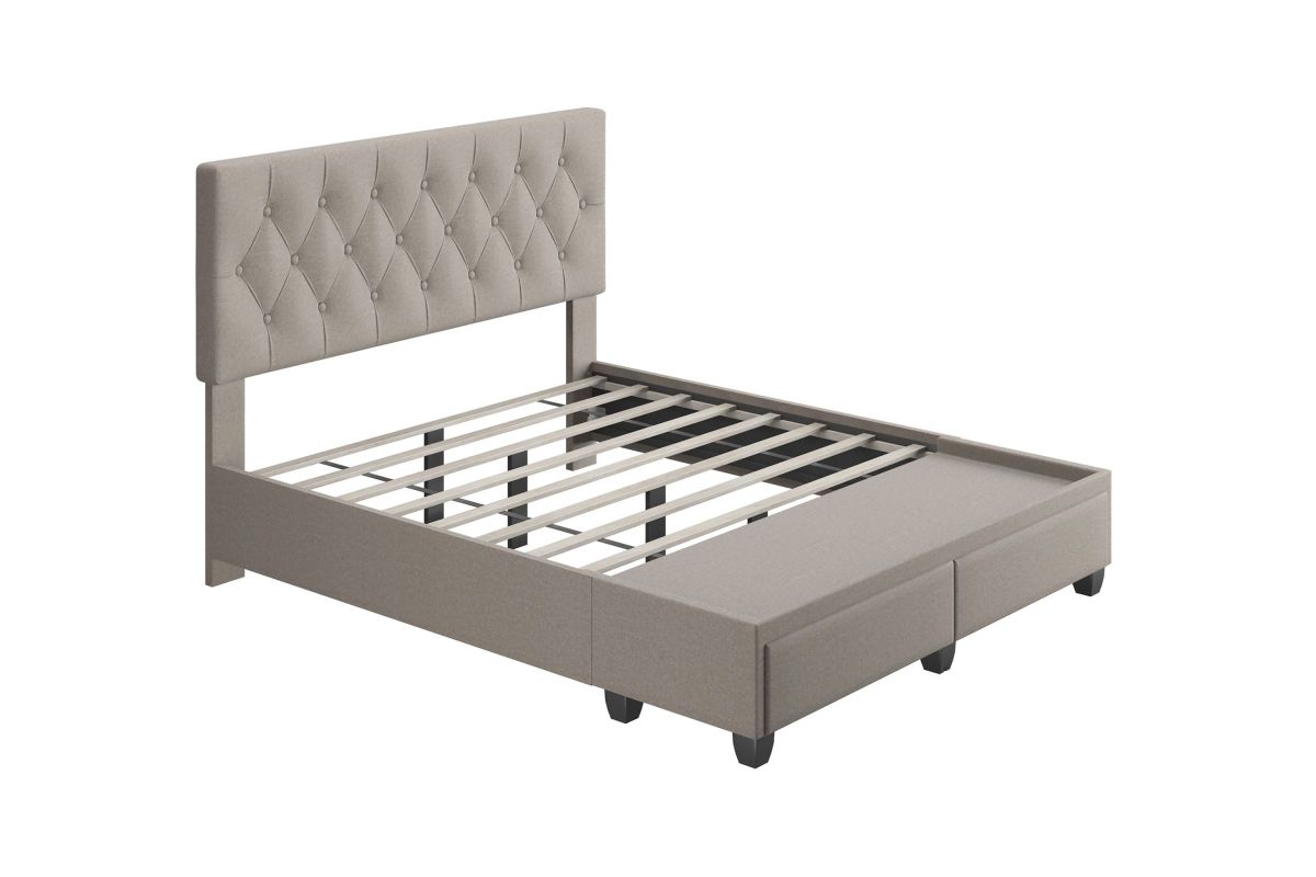 Timeless and functional, this upholstered storage platform bed provides 2 large storage drawers to help keep your space organized. Euro side glides on the drawers ensure smooth opens every time. The headboard features classic button-tufting and the bed is completely upholstered and slightly padded for a premium look and feel.