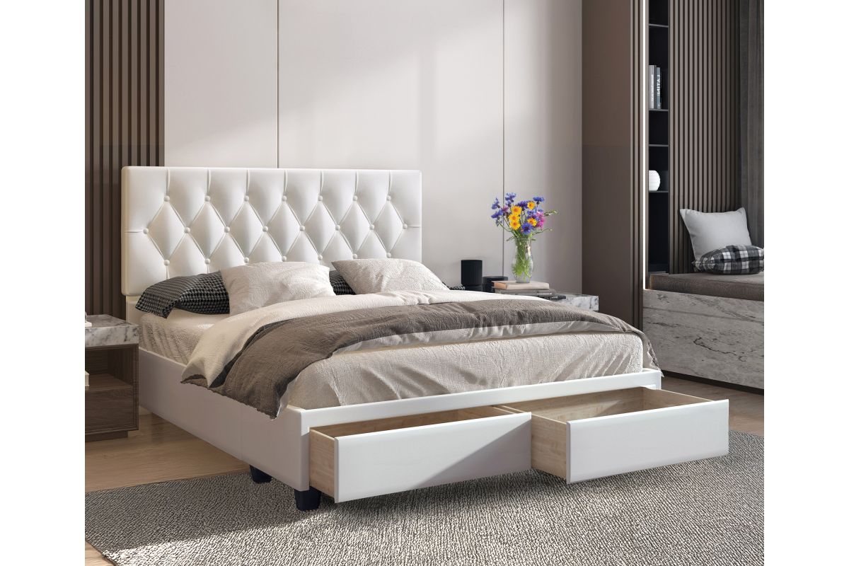 Timeless and functional, this upholstered storage platform bed provides 2 large storage drawers to help keep your space organized. Euro side glides on the drawers ensure smooth opens every time. The headboard features classic button-tufting and the bed is completely upholstered and slightly padded for a premium look and feel.