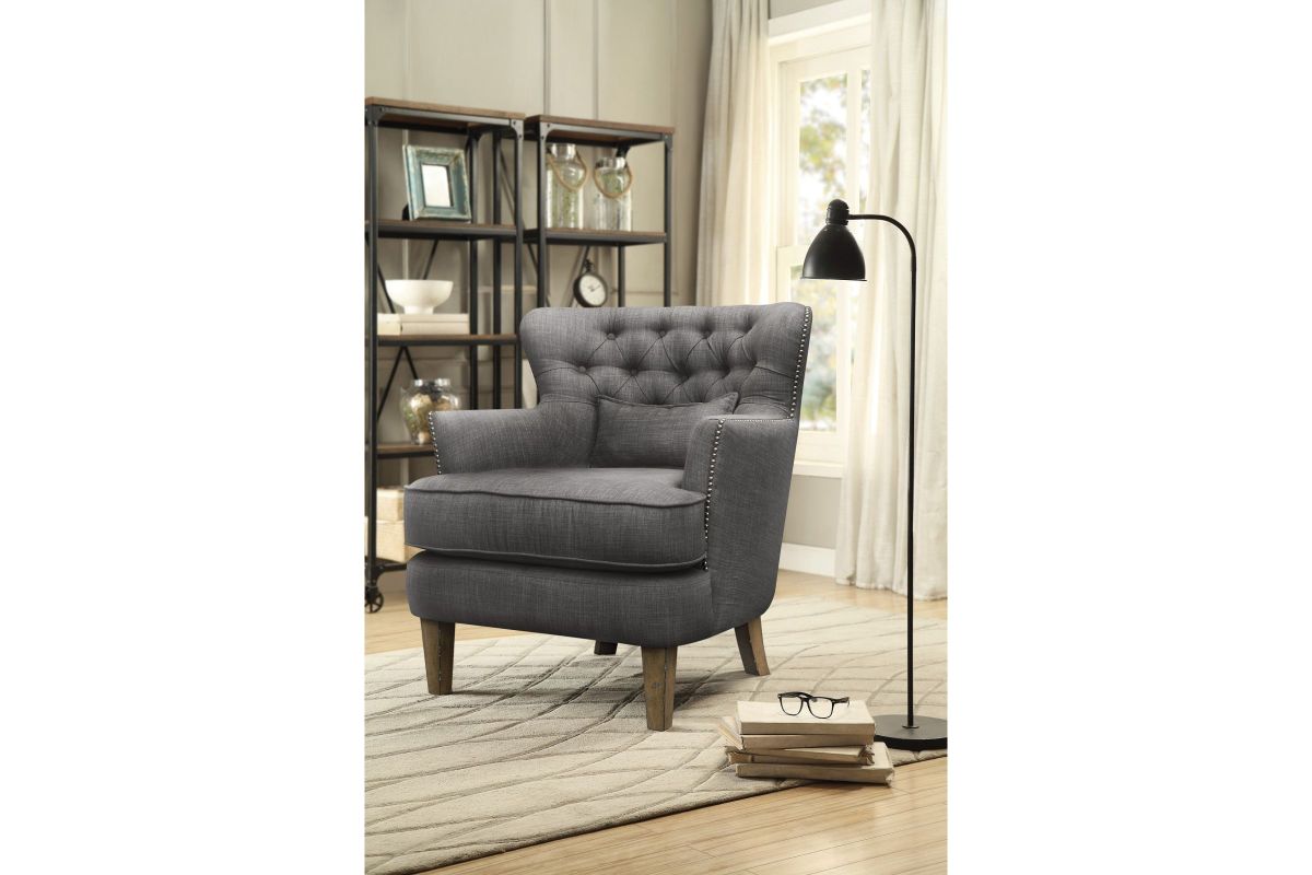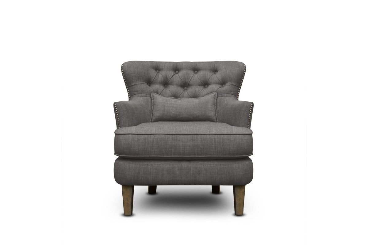 The Zeith Dark Gray Accent Chair brings modern comfort to any room with its soft dark gray upholstery, supportive cushioning, and gently sloped arms. Perfect for small spaces, reading corners, or living areas, it stands on tapered wooden legs that add a subtle mid-century touch to its clean, compact design. Assembly Required