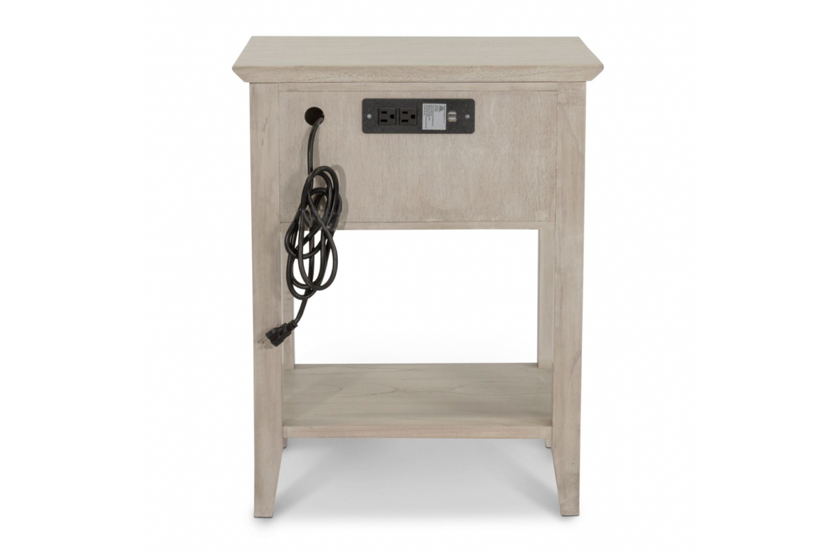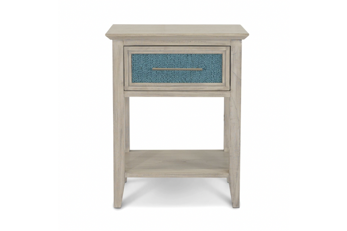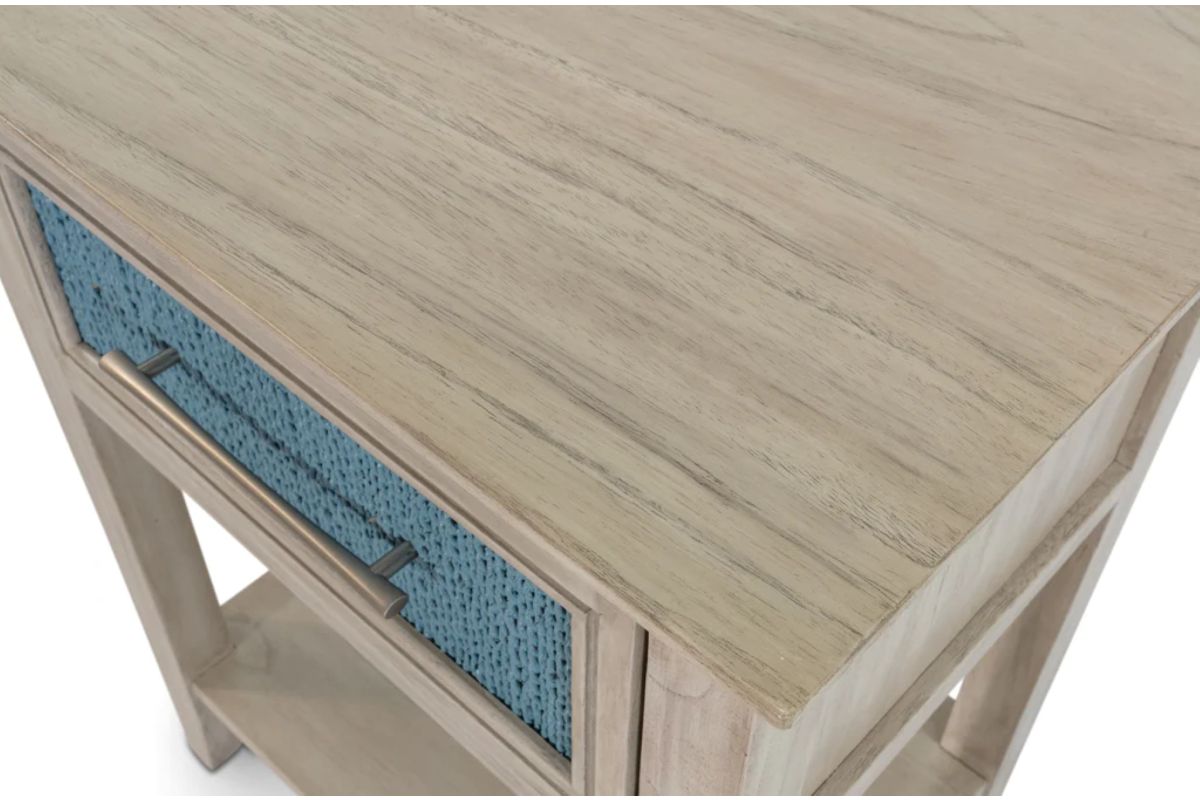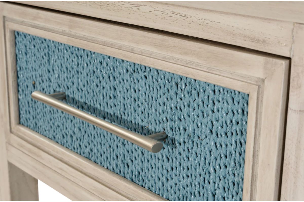 Designed to bring both beauty and utility to your bedside, the Ocean Blue & Aged Ivory nightstand blends hand-crafted details with modern functionality. With its Ocean Blue rope paneling, aged ivory frame, and smart charging features, this piece adds laid-back charm while keeping your essentials within reach and powered up.