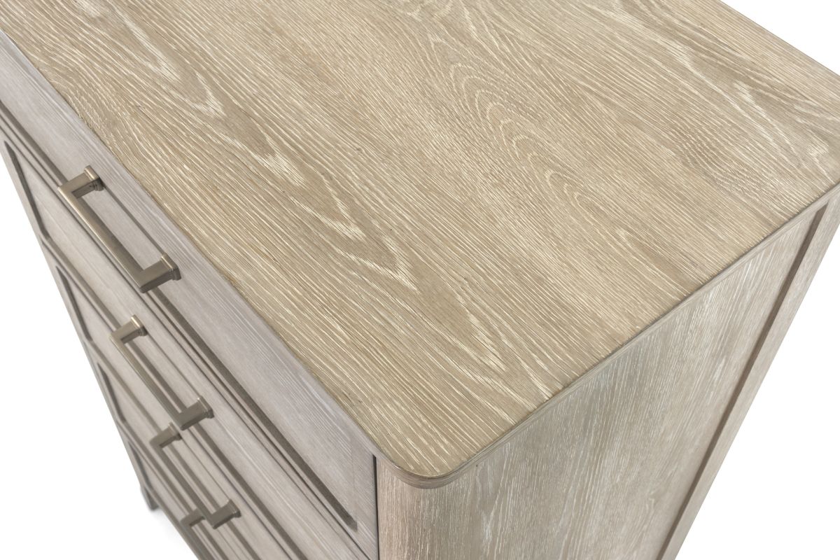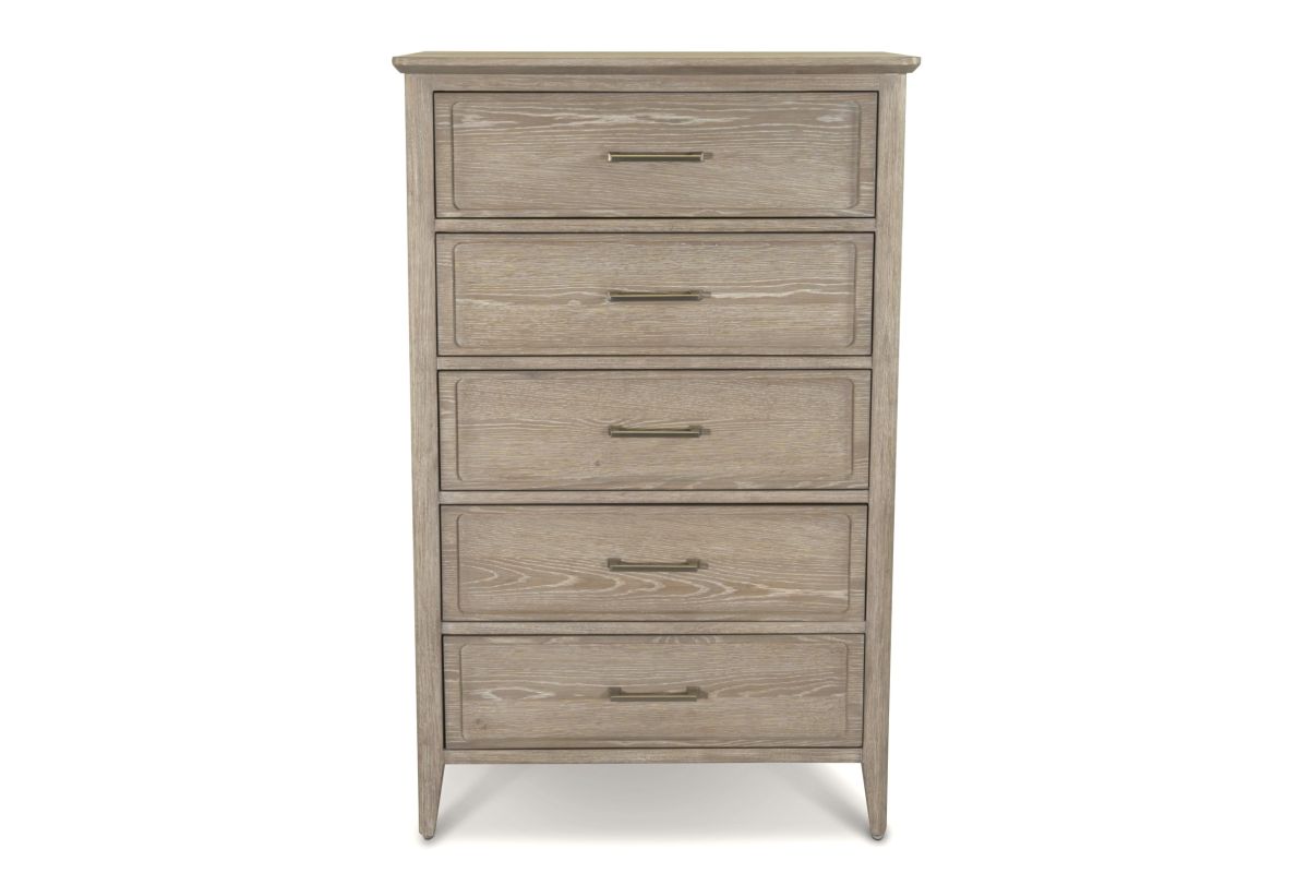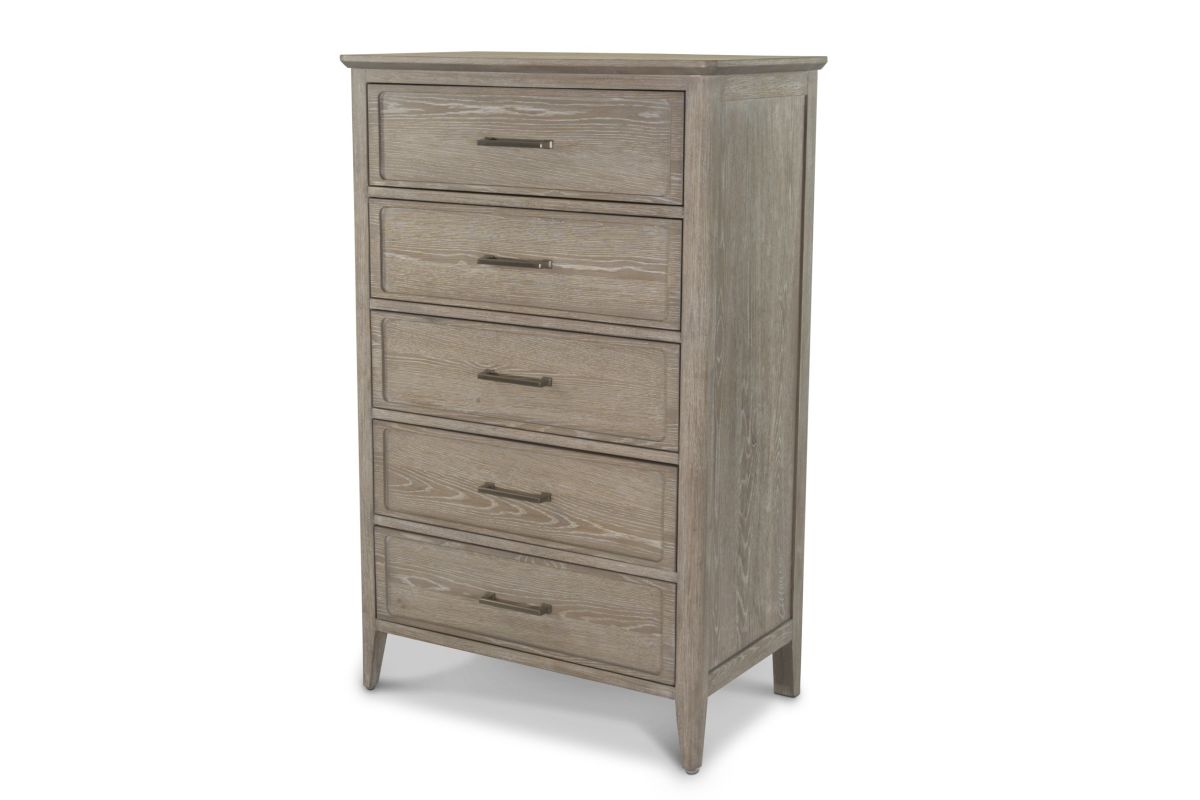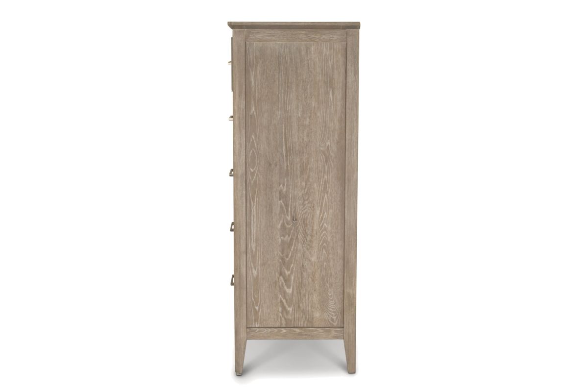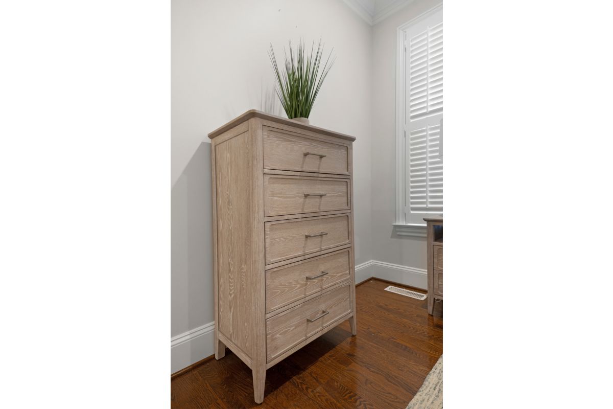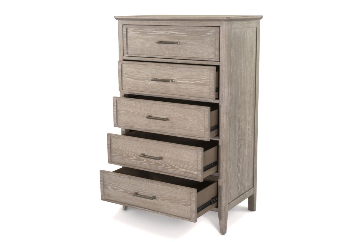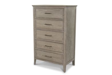 Add generous vertical storage and timeless design to your bedroom with this solid white oak 5-drawer chest. Finished in a beautifully layered glazed driftwood tone, the chest brings a sense of warmth and sophistication to any space. Built to last with expert craftsmanship and thoughtful features, this piece offers everyday functionality with elevated style, perfectly complementing the rest of the bedroom collection.