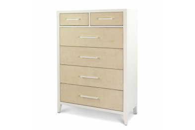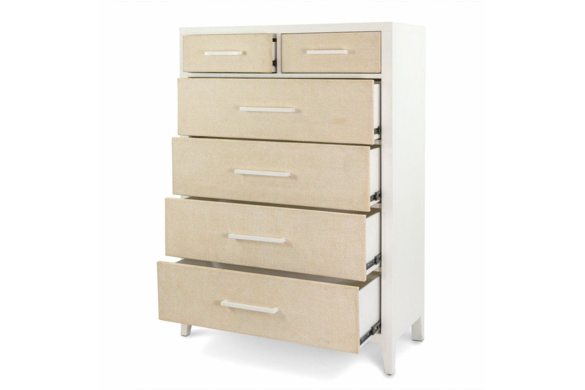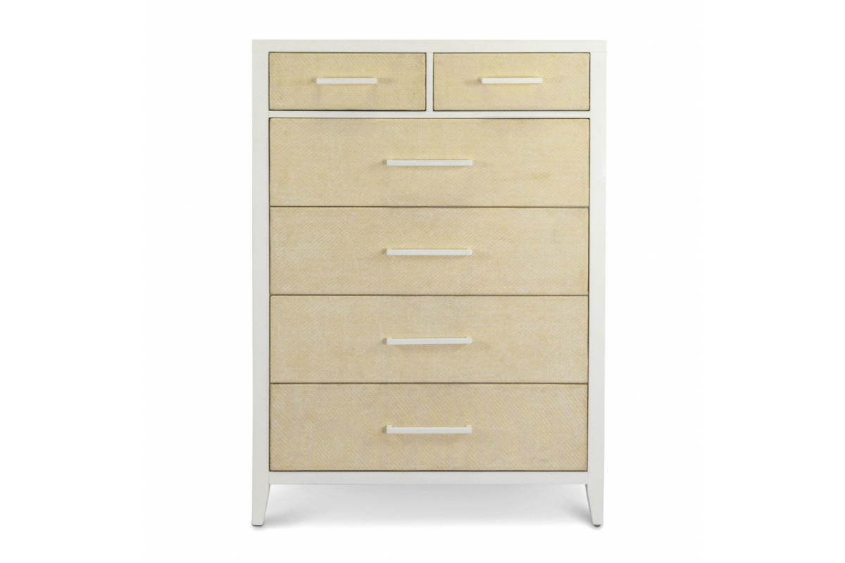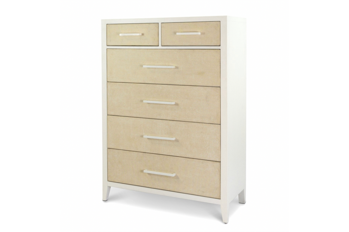 Elevate your storage with this tall coastal chest, standing an impressive 58 inches high and packed with thoughtful details that blend function, durability, and relaxed style. Crafted from solid rubberwood, birch veneer, and engineered woven drawer fronts, this chest showcases a breezy two-tone Sand and Stark White finish for a clean coastal look. With six spacious drawers, full-extension ball-bearing glides, and smooth edges that protect even delicate manicures, this chest is as practical as it is beautiful. Levelers on the legs provide added stability and precision placement on any surface.