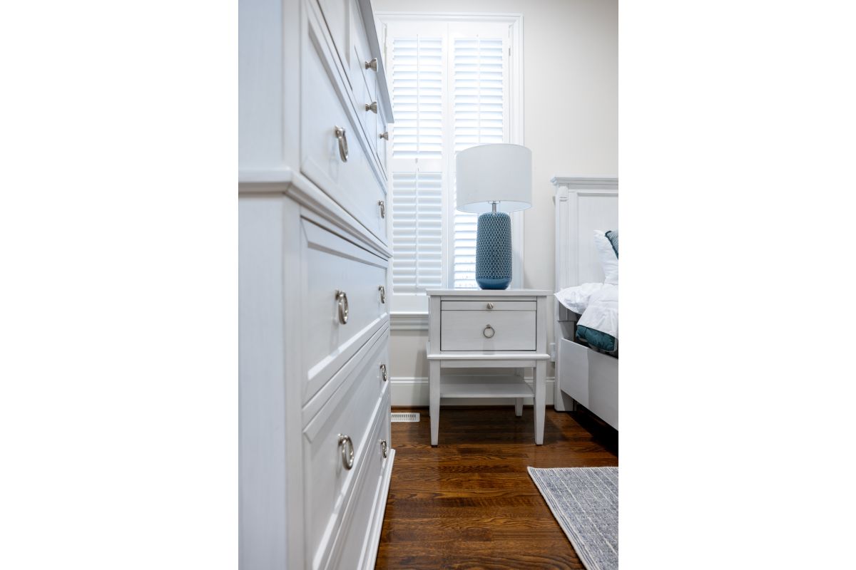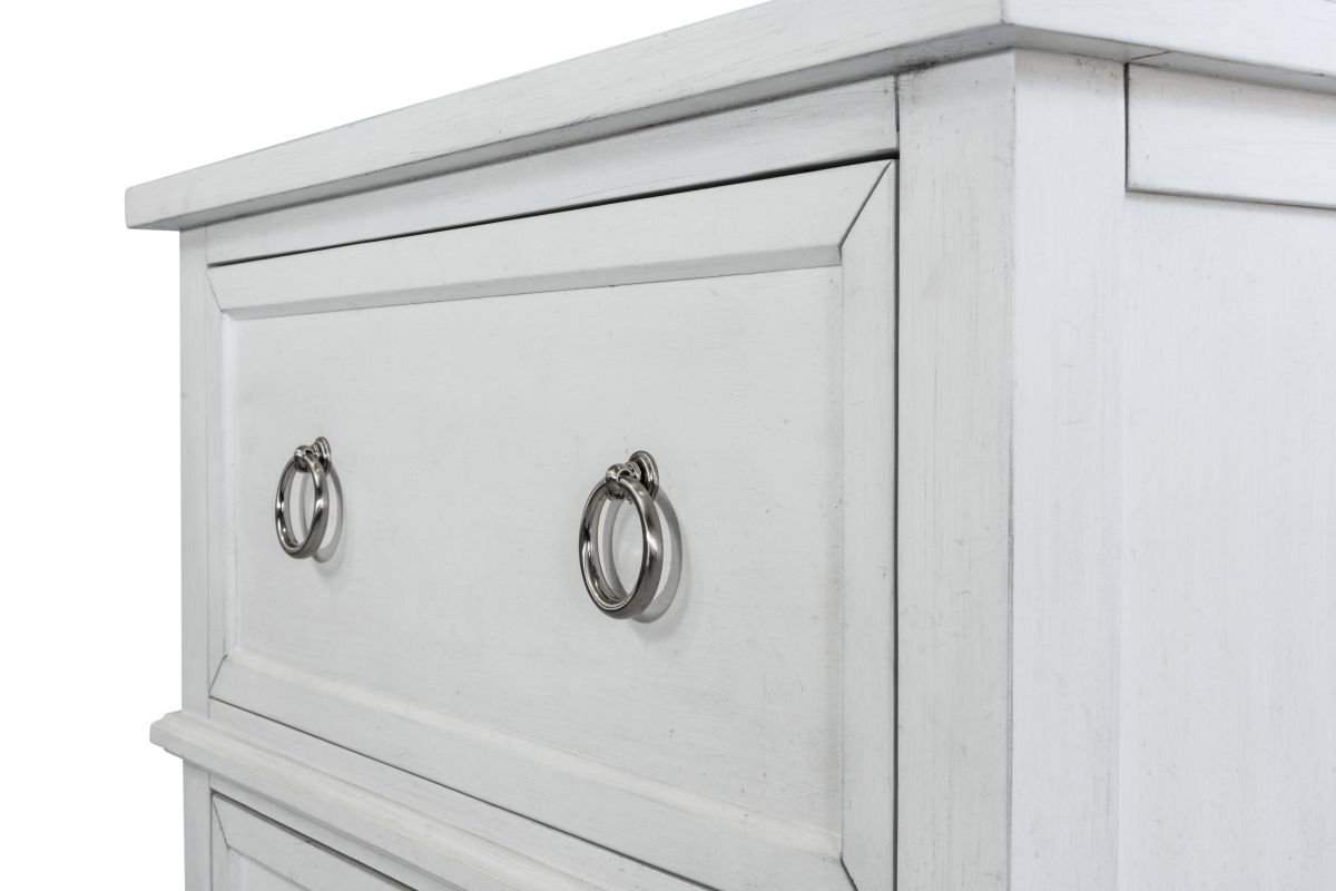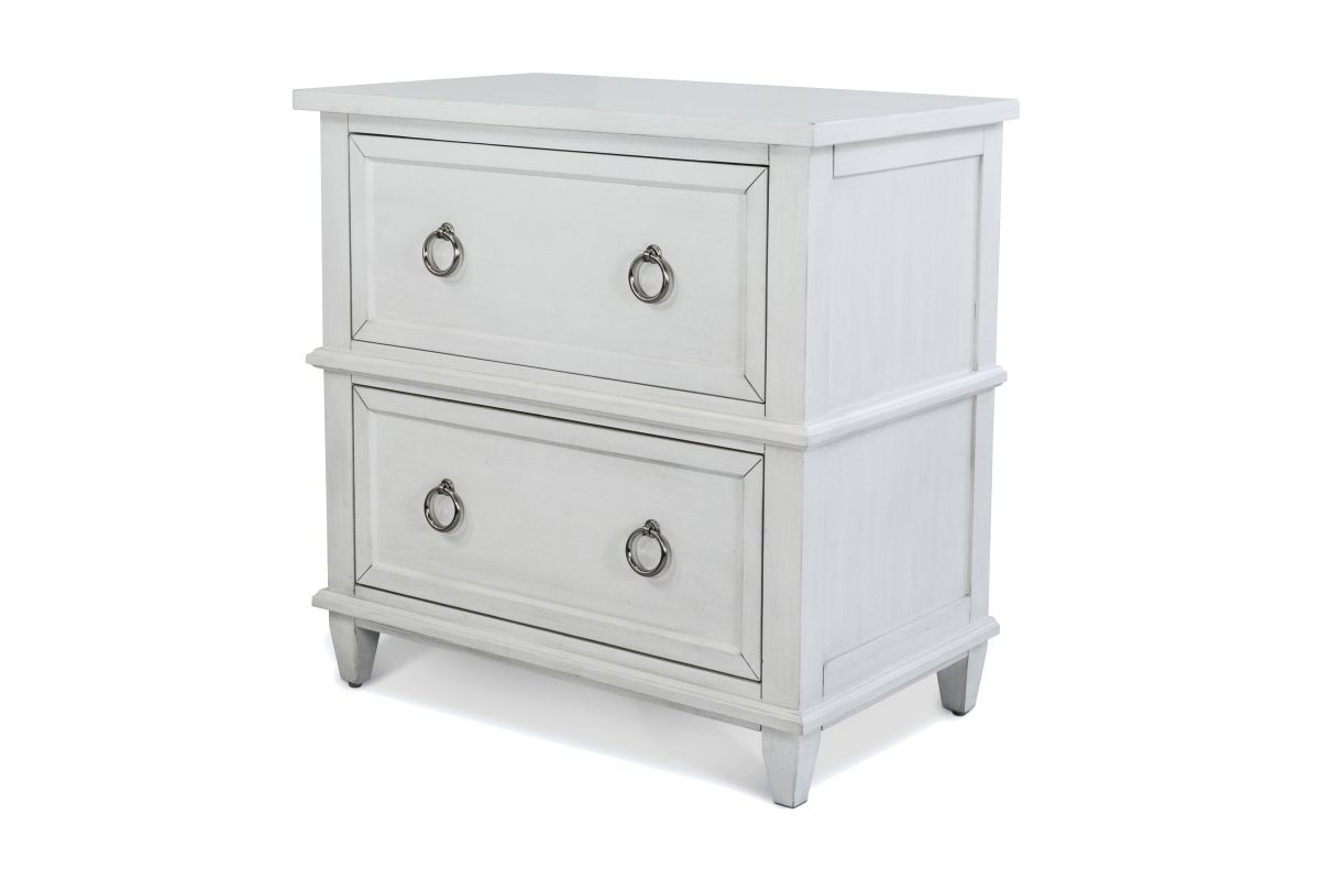 Brighten your bedside with this timeless poplar wood nightstand, finished in Fresh White with a Soft Grey Glaze for a clean, coastal-inspired look. Thoughtfully designed with two spacious drawers and an open shelf below, it offers a perfect mix of form and function. Pewter-finished ring and knob hardware adds a subtle shine, while ball-bearing glides ensure smooth, quiet operation. Felt-lined top drawers protect delicate items, and a hidden USB and power outlet on the back keeps your devices charged and close at hand—all crafted from SCS-certified wood.