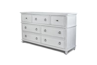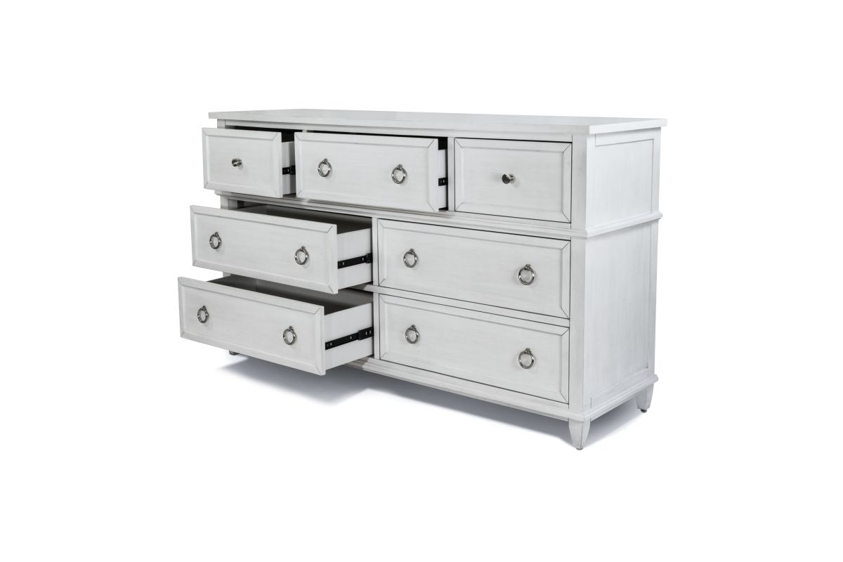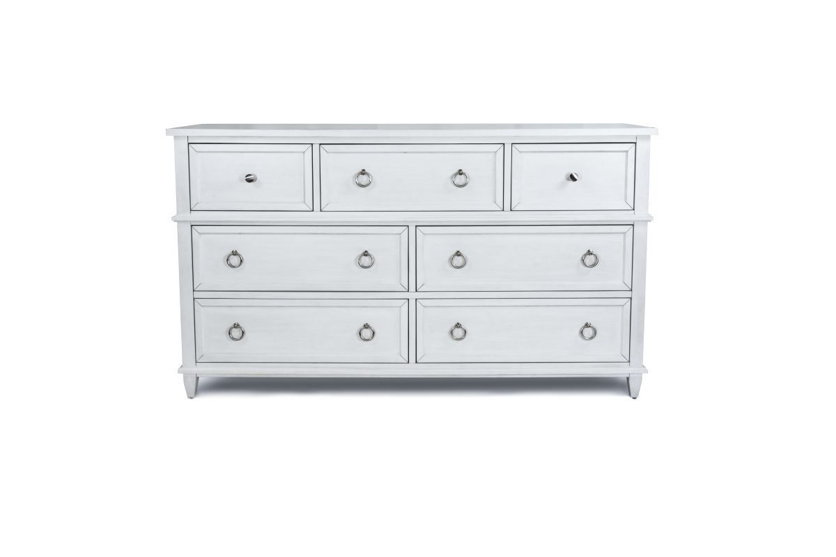 Elevate your bedroom with this elegant 7-drawer dresser, thoughtfully crafted from poplar wood and finished in a Fresh White tone with a Soft Grey Glaze. This spacious piece brings refined style and practical storage to your space, featuring a mix of pewter-finished knobs and ring pulls, a 12-step glazed finish, and oversized drawer boxes. The top drawers are felt-lined to protect delicates, and a sliding jewelry tray offers a discreet home for your favorite accessories. With dovetail construction, ball-bearing glides, and cedar-lined bottom drawers, every detail is built for longevity and everyday luxury.