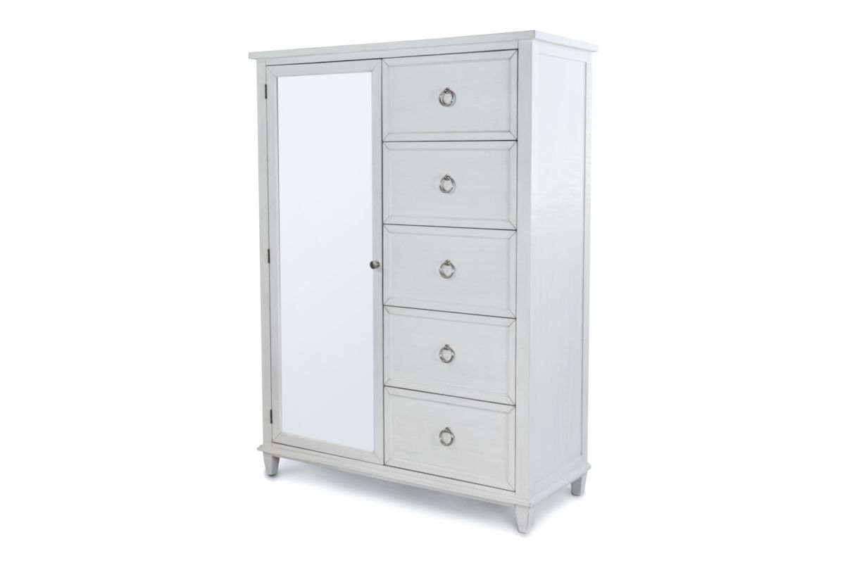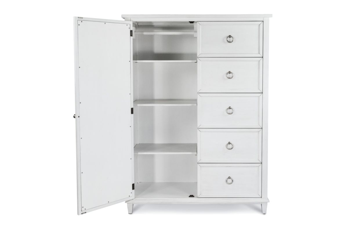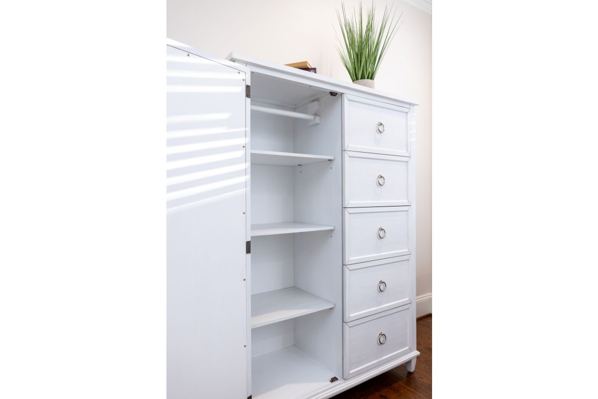 Designed to blend beauty and versatility, this 5-drawer chest brings smart storage and subtle sophistication to any bedroom. Made from solid poplar wood and finished in Fresh White with a Soft Grey Glaze, it features five generously sized drawers, plus a side cabinet with a reversible mirrored door. Choose between a mirrored or clean white panel look, depending on your style. Inside, a hanging clothes bar and fixed shelf provide hidden vertical storage for garments, bags, or extra linens. With ball-bearing glides, cedar-lined bottoms, and felt-lined top drawers, this chest balances charm and functionality in every detail.