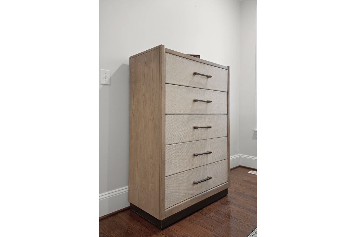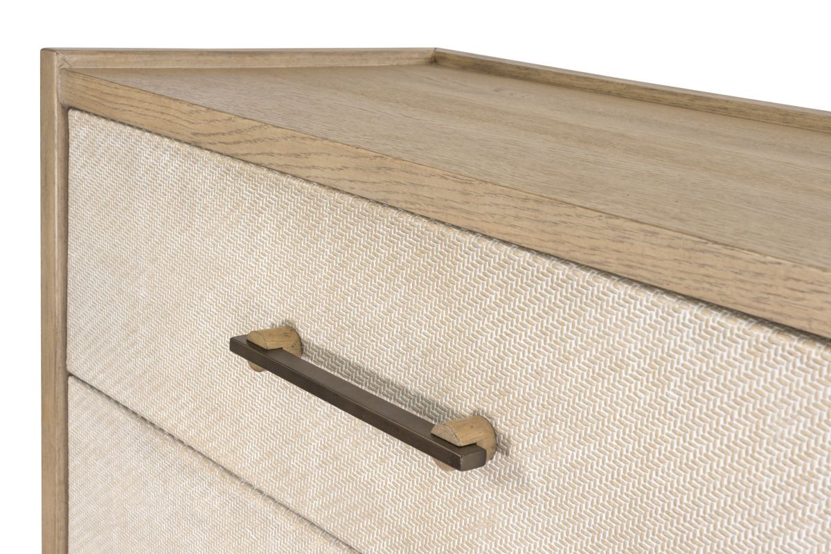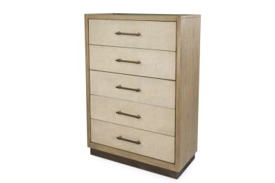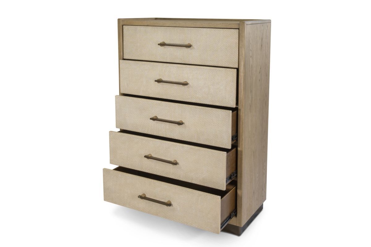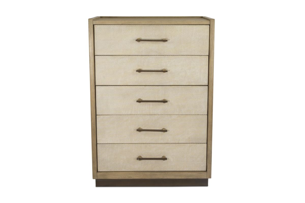 Enhance your bedroom storage with the Rio Vista 5-Drawer Chest, expertly crafted from cathedral cut white oak and finished in muted earth tones and clay. This chest combines natural wood elegance with durable engineered woven fabric drawer wraps, offering a perfect blend of style and function. Featuring felt-lined top drawers, cedar bottom panels, and smooth ball-bearing glides, it provides secure and organized storage for your essentials.