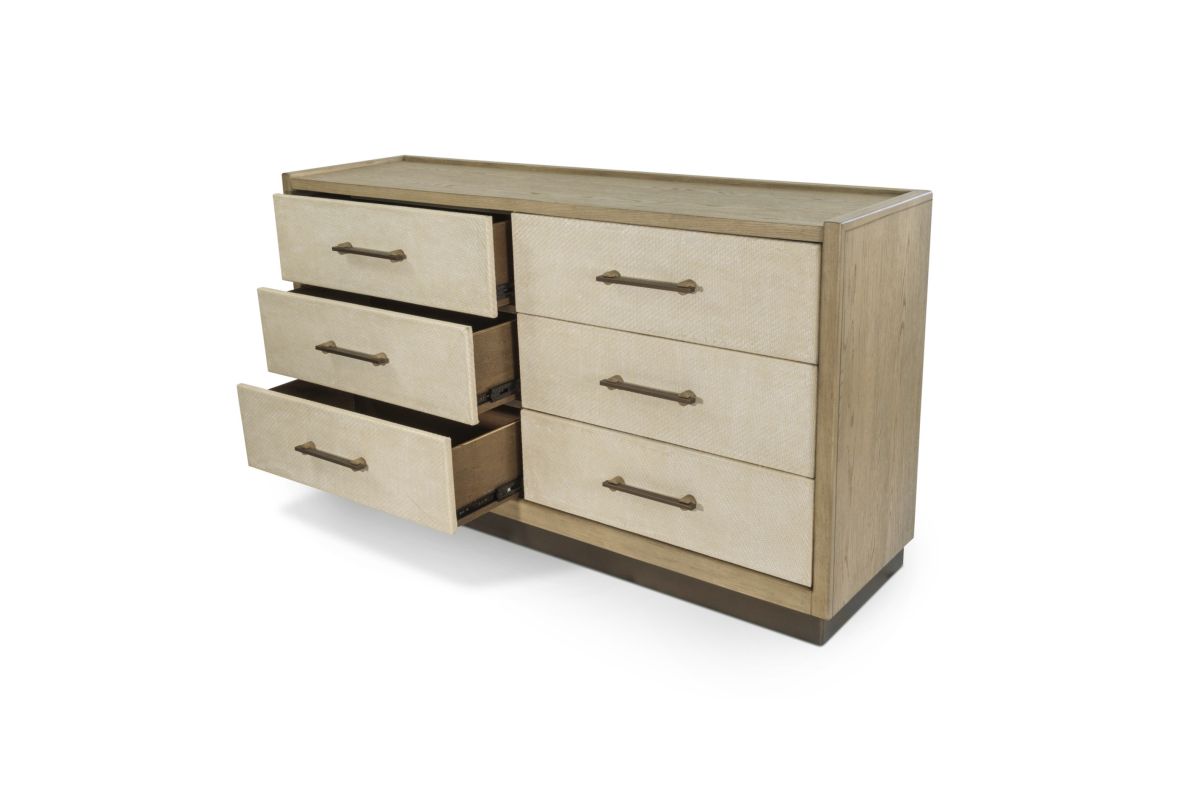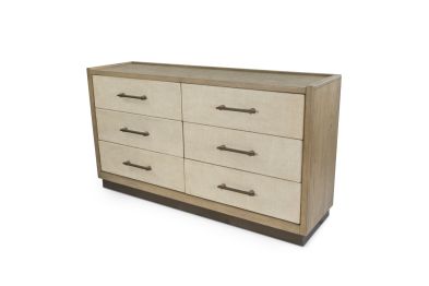 Bring organized elegance to your bedroom with the Rio Vista 6-Drawer Dresser. Crafted from cathedral cut white oak and finished in muted earth tones and clay, this dresser combines natural wood beauty with durable engineered woven fabric drawer wraps. Featuring felt-lined top drawers, cedar bottom panels, and a sliding jewelry tray, it offers versatile storage to keep your essentials beautifully arranged. Built with English dovetail joints and smooth ball-bearing glides, this dresser ensures lasting quality and effortless use.
