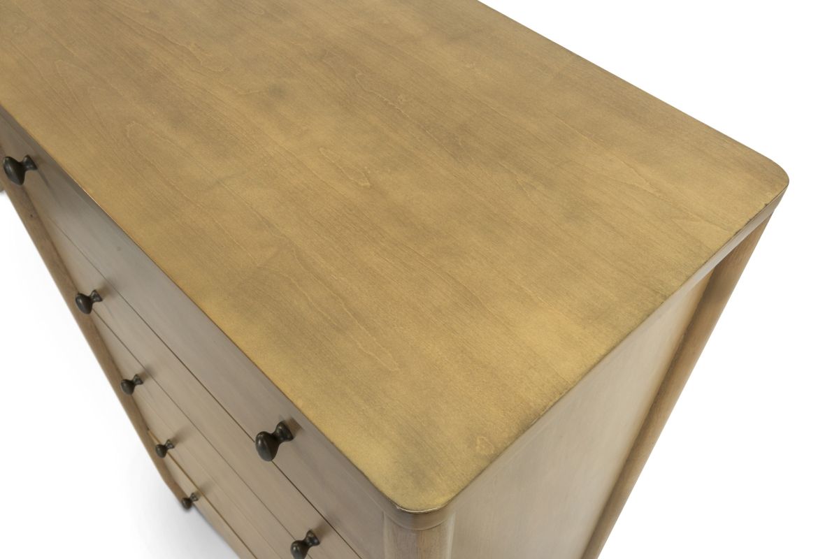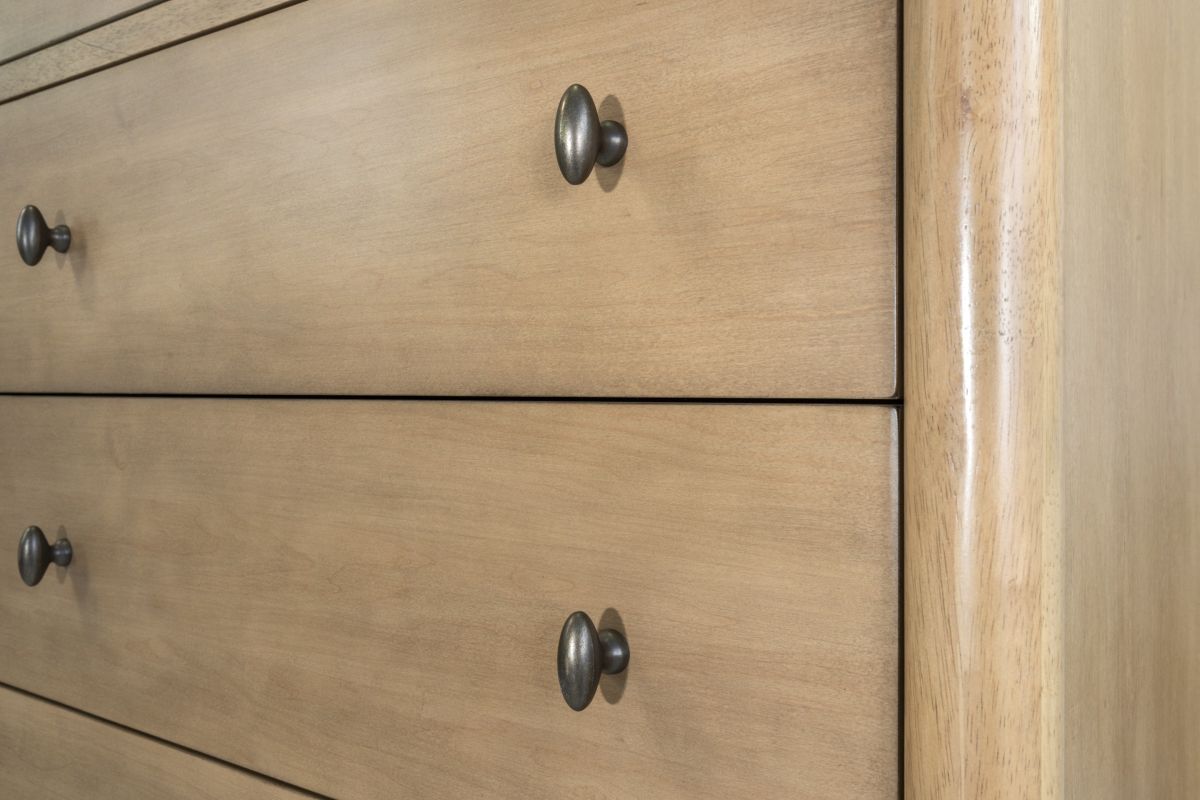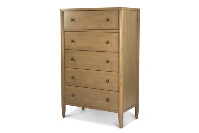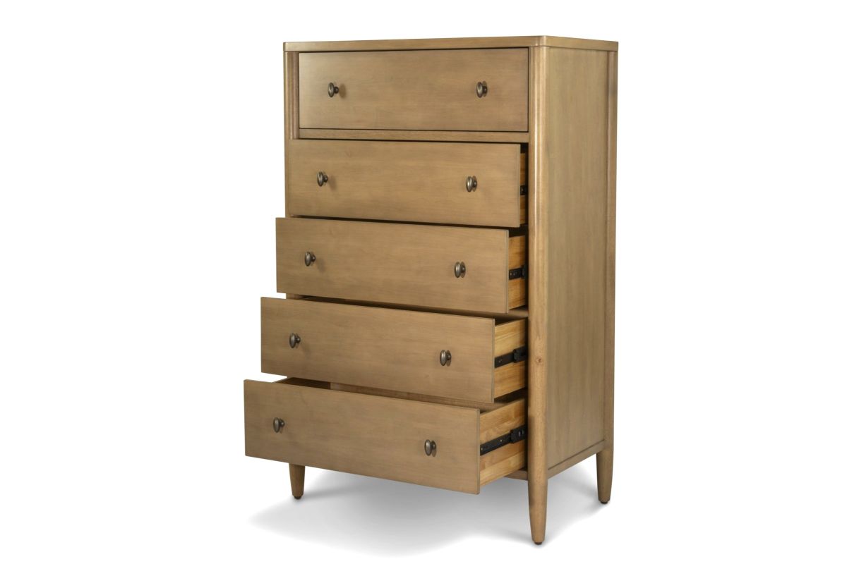 This lower-profile 5-drawer chest is the perfect blend of refined style and everyday functionality. Crafted from solid maple with a warm maple finish, it offers generous storage in a streamlined silhouette ideal for compact spaces or modern interiors. Each drawer is built with English dovetail construction and full-extension ball-bearing glides, while the top drawer is fully felt-lined to keep delicate items safe. Designed to complement the coordinating low-profile bed, this chest brings both beauty and practicality to your bedroom.