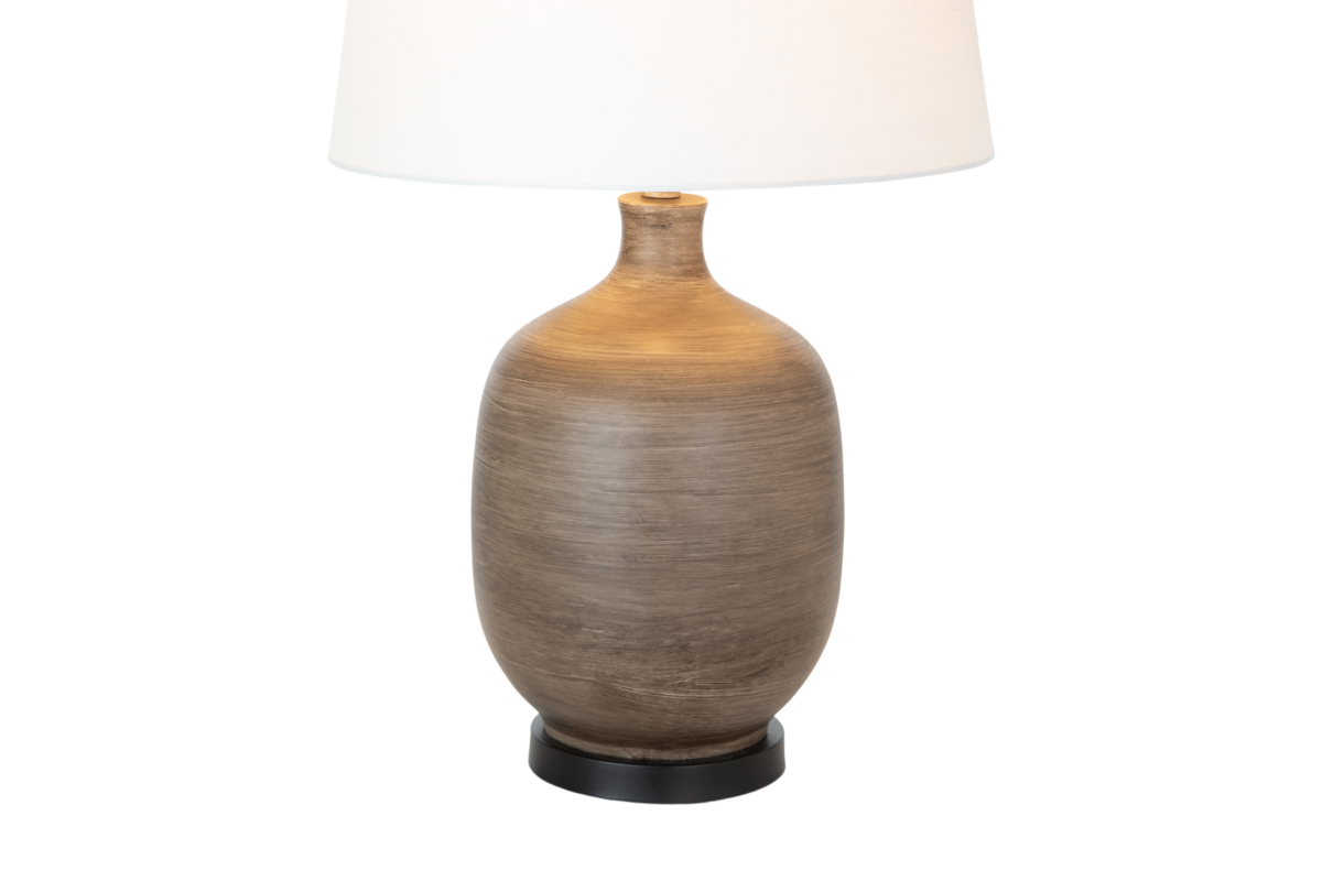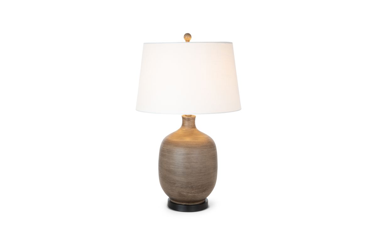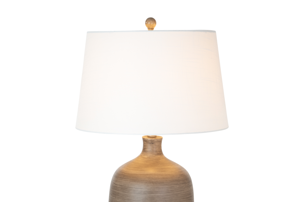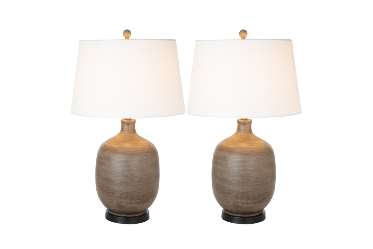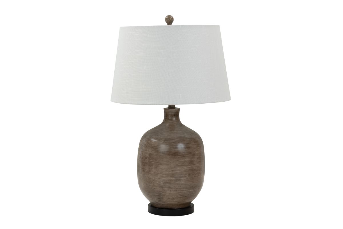 The lamp base boasts a sophisticated blend of grey and brown hues, creating an intriguing poly resin texture that mimics the warmth and character of natural wood, perfectly in tune with farmhouse aesthetics. At 28 inches in height, it's the ideal size to sit atop a farmhouse-style side table, nightstand, or console, adding a touch of modern elegance to your rustic surroundings.