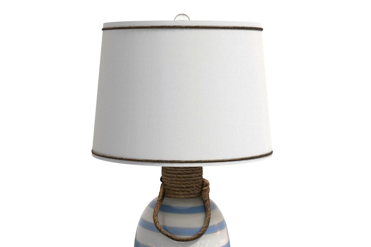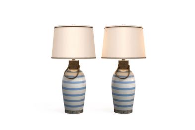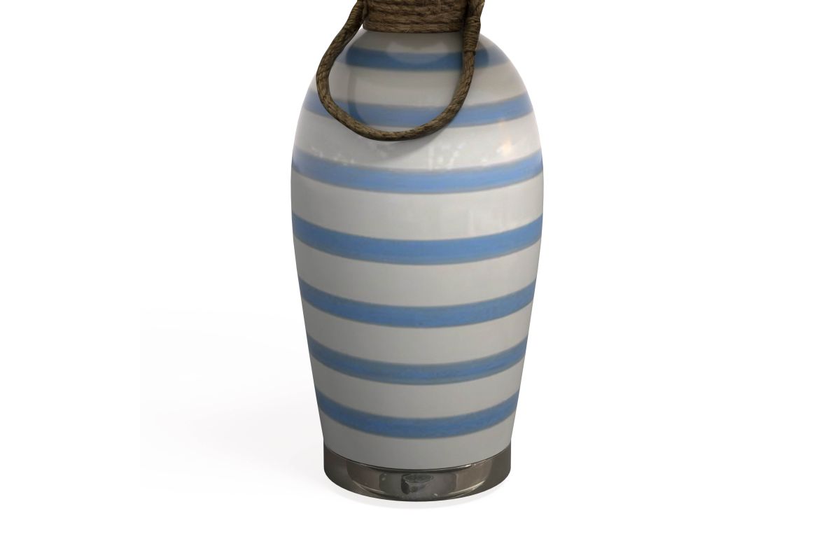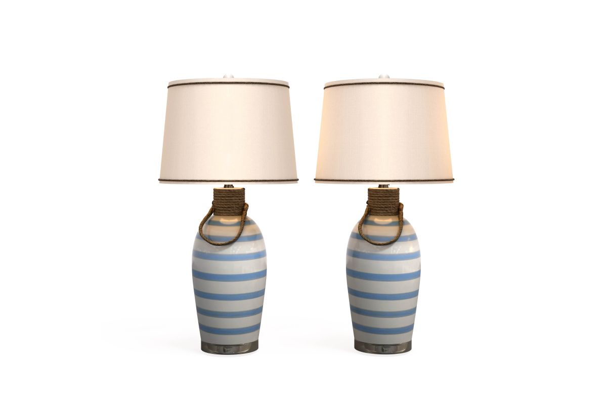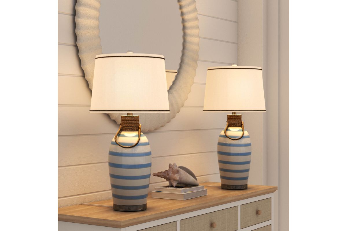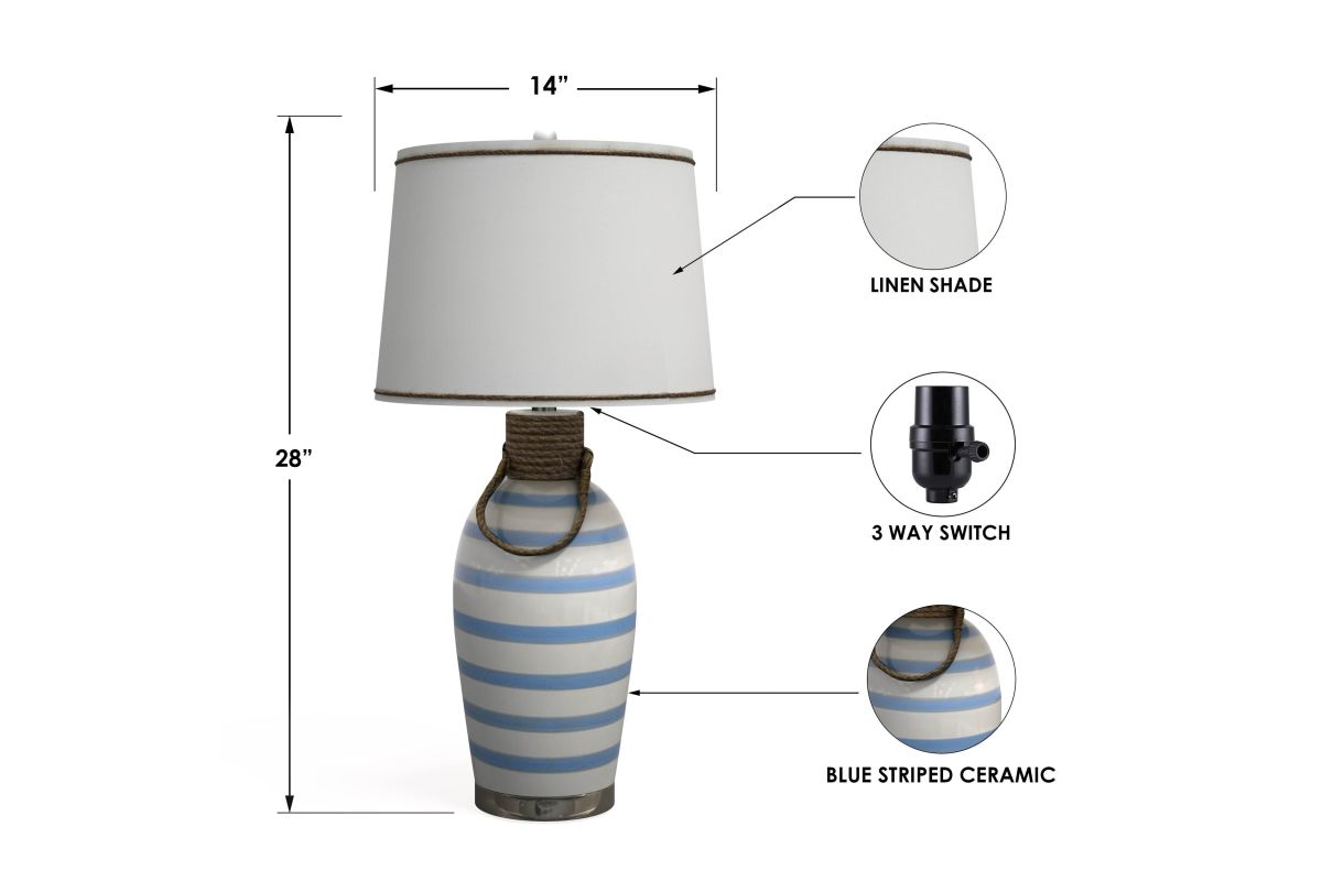 Transform your home with this stunning set of 2 striped ceramic table lamps, designed to bring a breezy coastal vibe to any room. Each lamp features a nautical-inspired blue and white striped base, accented with natural rope detailing for a perfect balance of casual elegance. The crisp white linen drum shade completes the look, diffusing light beautifully to create a warm and inviting atmosphere. Some assembly required.