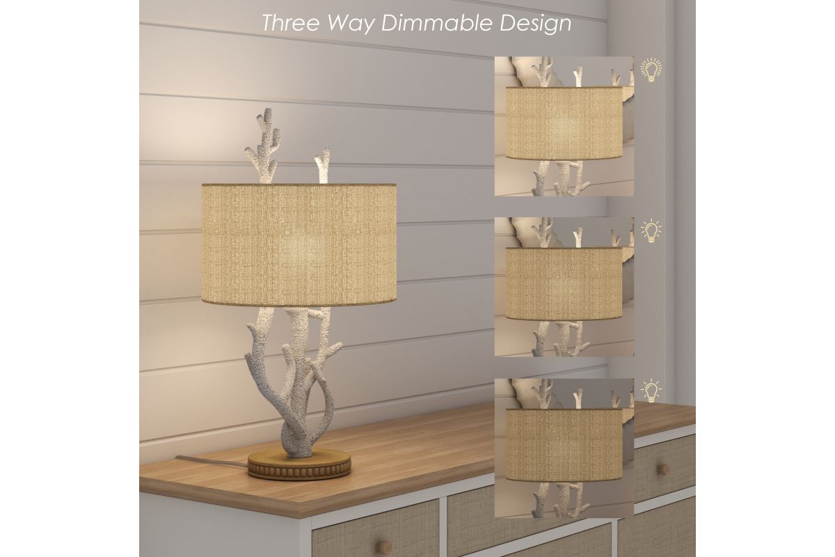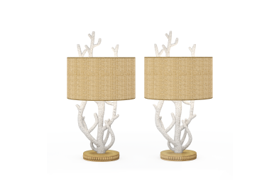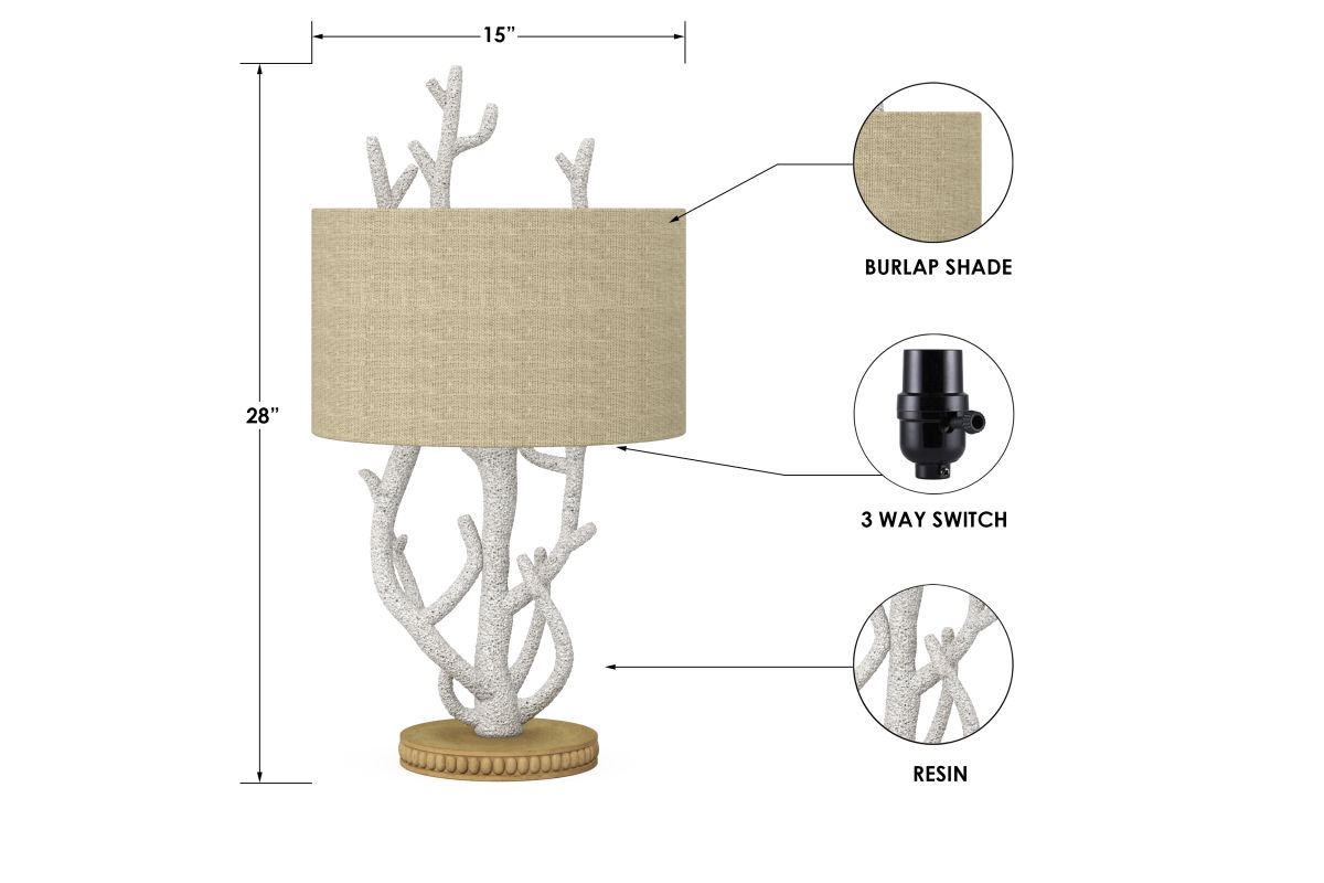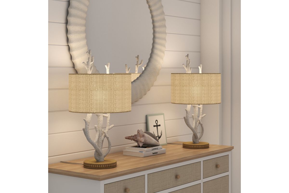 Enhance your home with this unique set of 2 coral-inspired table lamps, perfect for adding a touch of coastal elegance to any room. The sculptural white base mimics the natural texture of coral, resting on a finely detailed wooden pedestal for an earthy yet refined look. Topped with a warm beige drum shade, these lamps deliver a soft, natural glow that complements their seaside charm. Some assembly required.