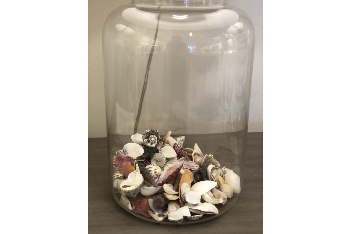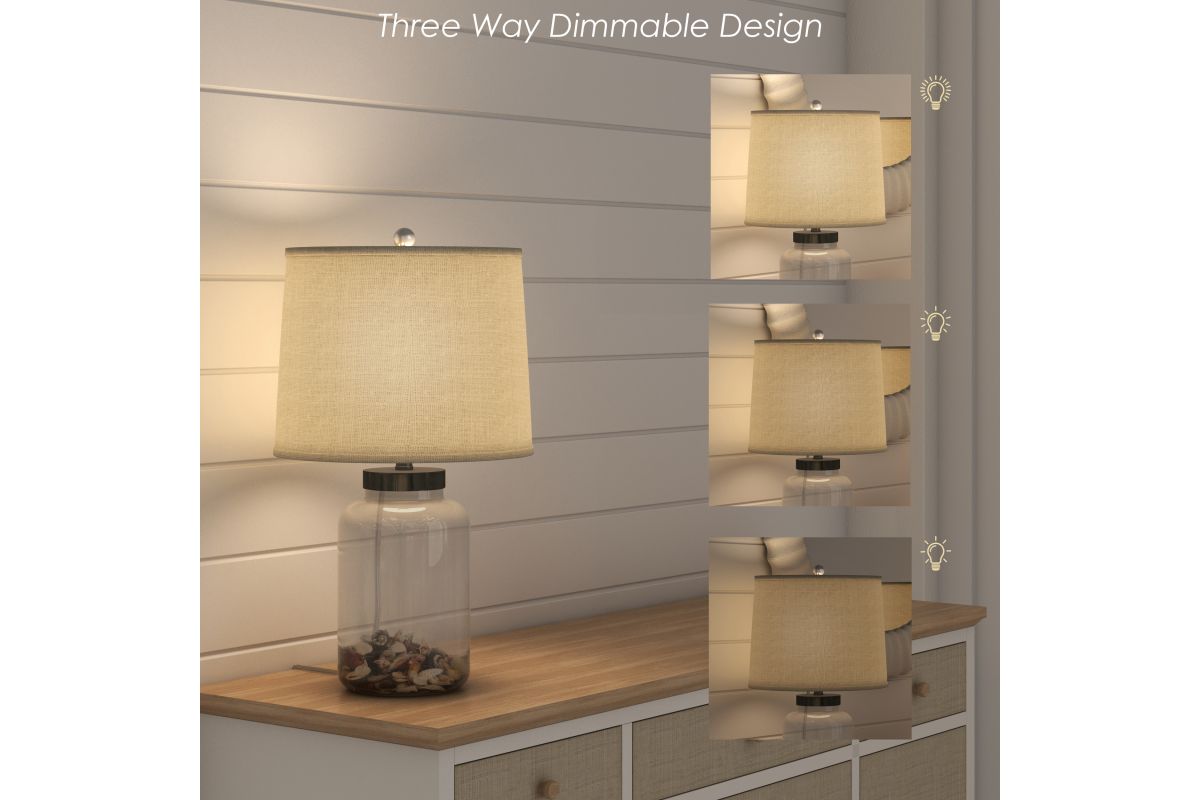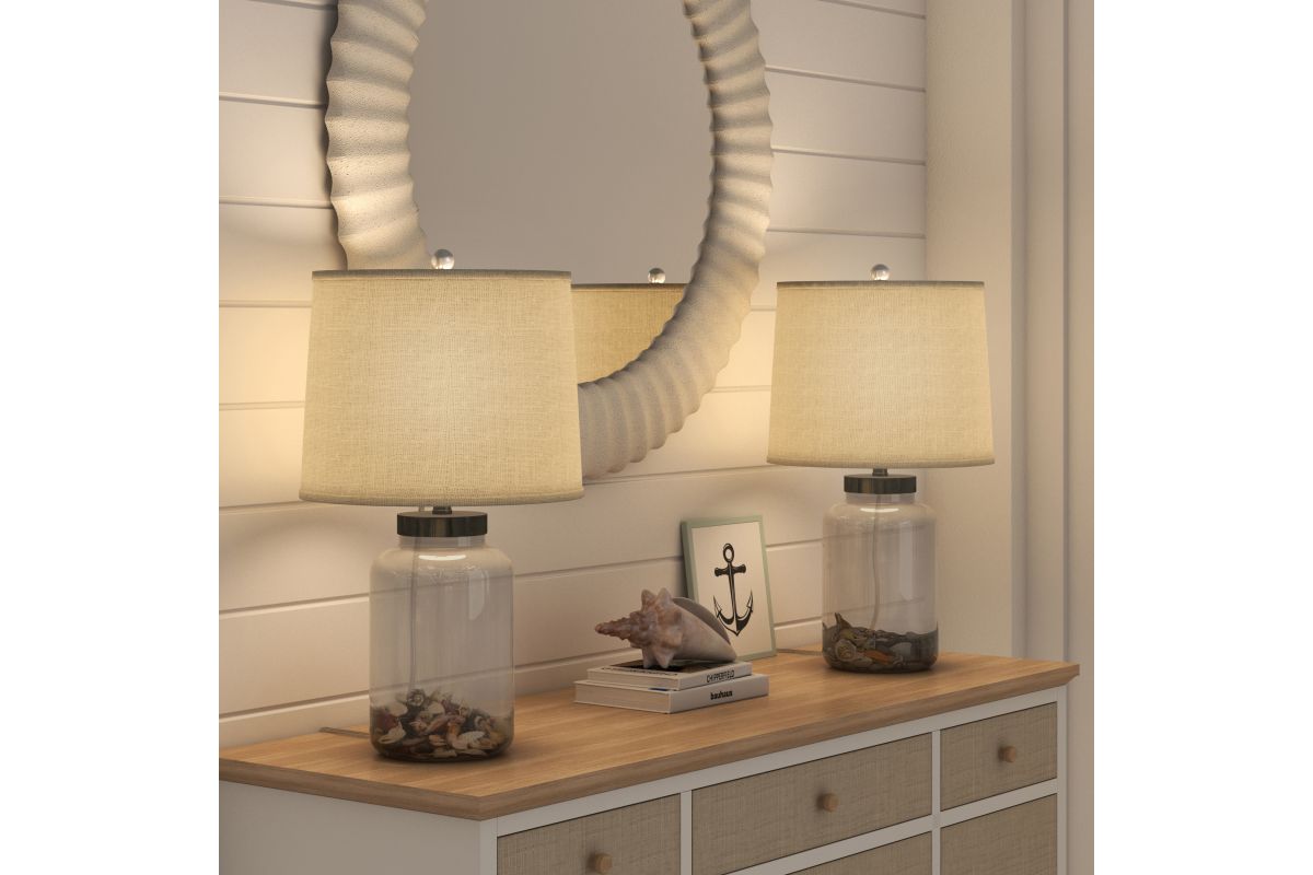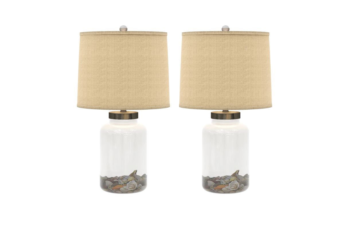 Elevate your living space with the timeless elegance of this set of two clear glass jar table lamps. Inspired by the breezy beauty of the coast, these lamps feature a transparent glass base filled with decorative seashells and pebbles, exuding serenity and sophistication. The natural beige fabric shade complements any decor, casting a warm, inviting glow perfect for living rooms, bedrooms, or entryways. With a polished metal top and crystal-clear finial, the lamps deliver a touch of modern refinement while celebrating rustic charm. Some assembly required.
