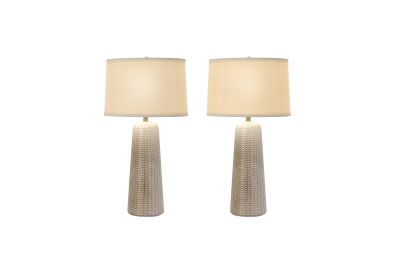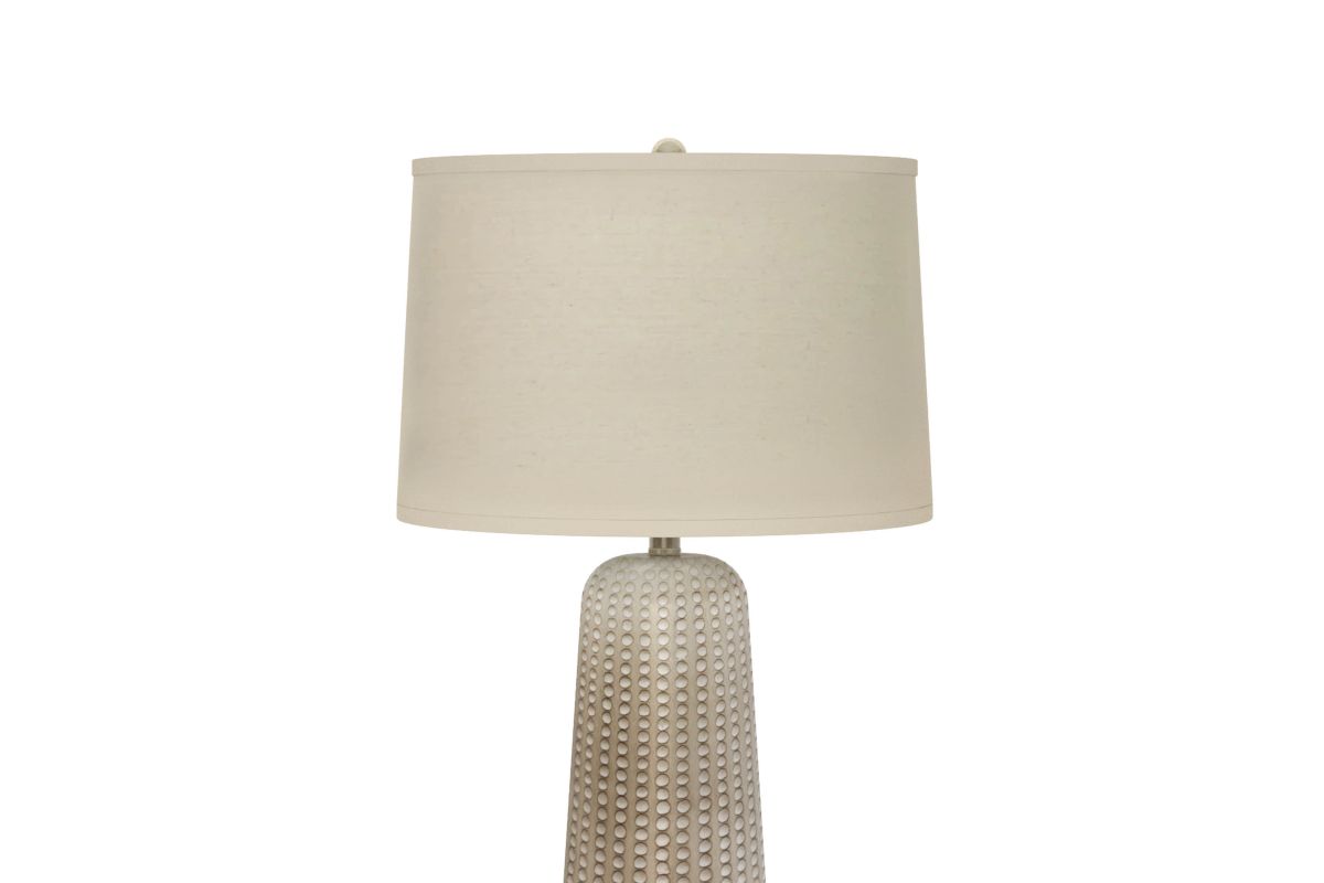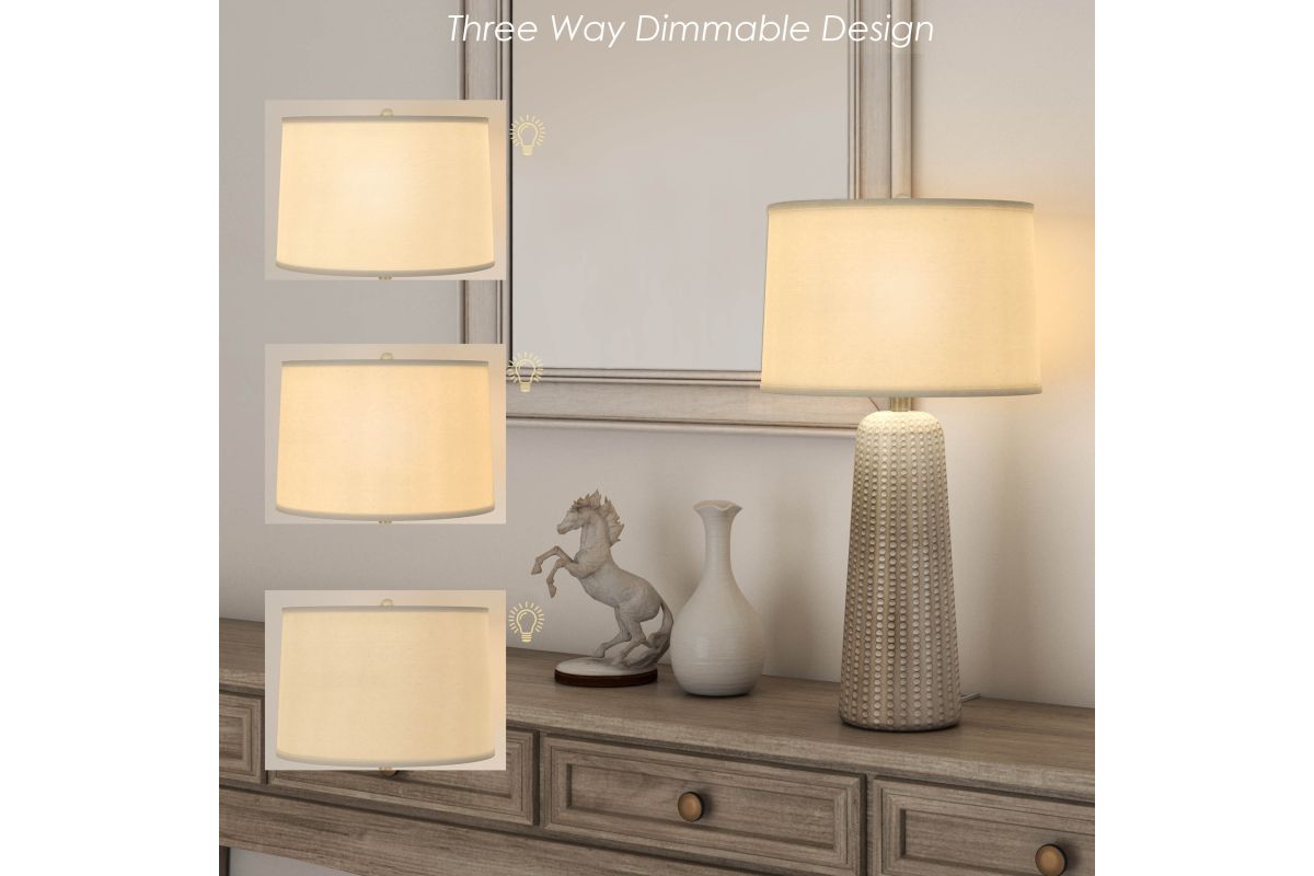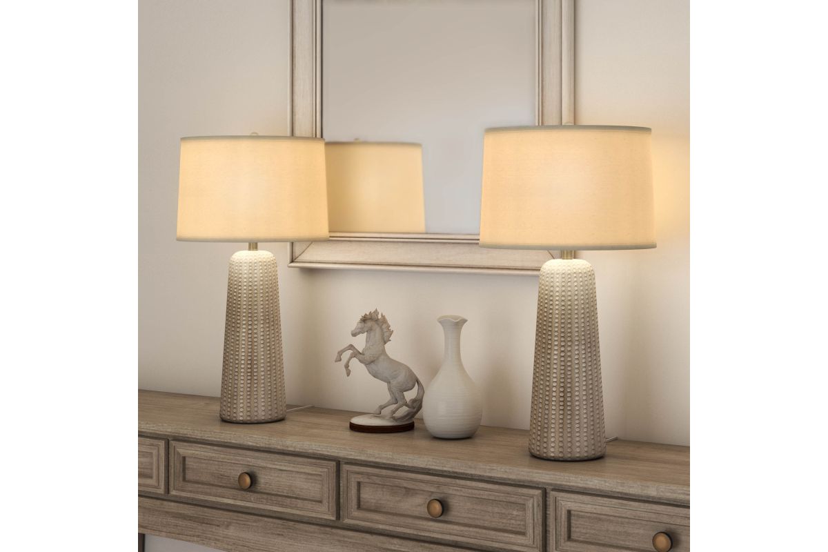 Bring a touch of artisan craftsmanship to your home with this set of two handmade ceramic table lamps, each featuring a beautifully textured dot pattern and a soft, neutral glaze. The tall, tapered silhouette creates a refined profile, while the natural linen shade casts a warm, welcoming glow. Equipped with a 3-way switch, this lamp transitions seamlessly from ambient mood lighting to bright task lighting. Whether placed in a bedroom, living room, or entryway, it adds understated elegance and earthy character to any space. Some assembly required.