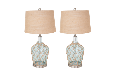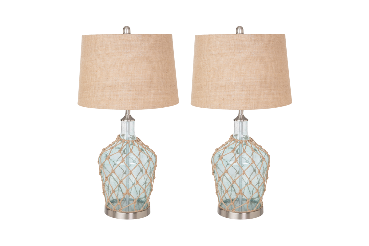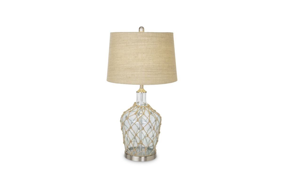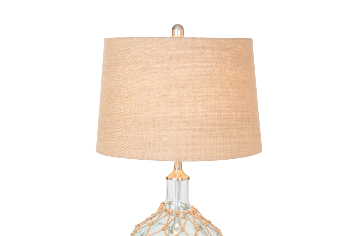 The lamp's base features exquisite bubble glass in clear and light blue hues, reminiscent of glistening ocean waters and endless skies. It stands at 28 inches tall, striking the perfect balance between elegance and versatility. The addition of rope and burlap accents adds a touch of rustic coastal appeal, perfectly complementing the lamp's overall beach-inspired aesthetic.