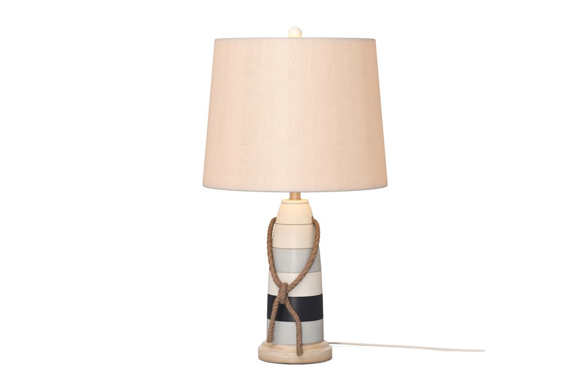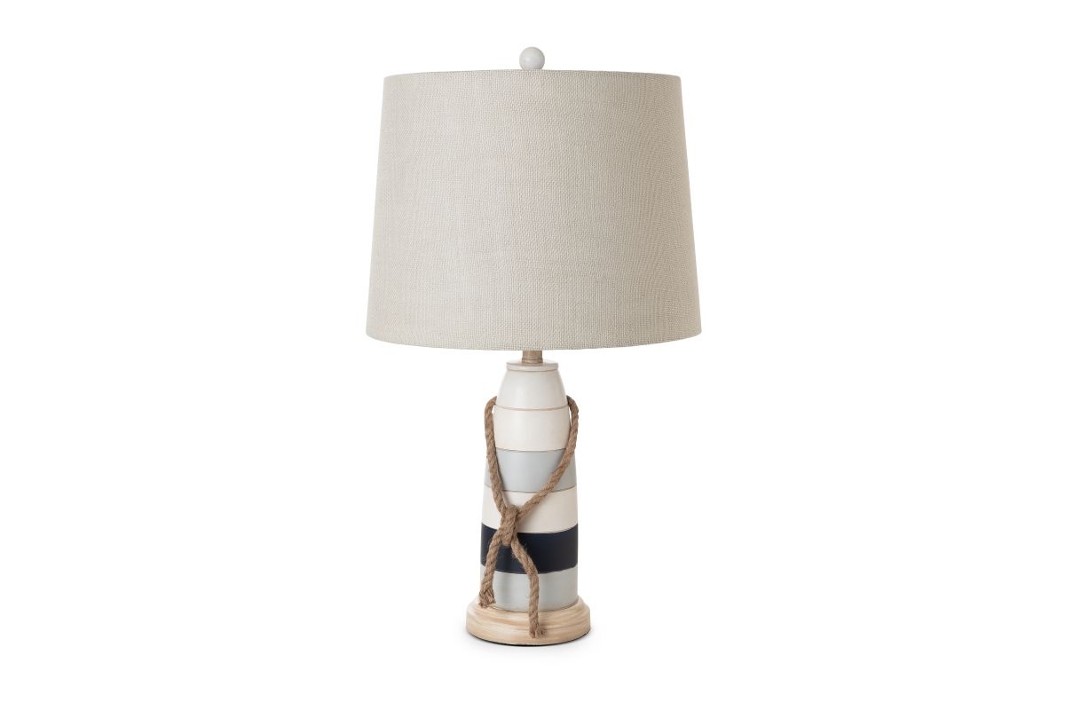 Topping off this coastal creation is a linen hardback shade that brings an element of timeless elegance to the lamp. Its clean lines and neutral tones not only diffuse the light softly, creating a warm and inviting ambiance reminiscent of coastal sunsets but also complement the lamp's overall nautical character.