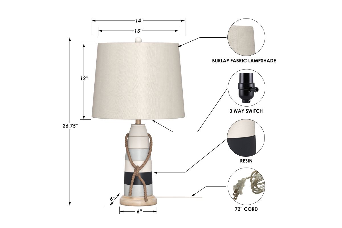 The lamp's base, meticulously crafted from durable poly resin, replicates the iconic buoy design in three coastal colors: white and blue. Standing at 27 inches, it captures the essence of maritime charm while maintaining a versatile presence that complements various decor styles. The buoy's tri-color finish adds a touch of authenticity and visual interest to the lamp, making it a captivating addition to any room.