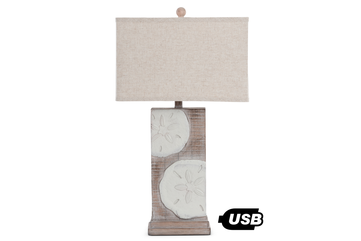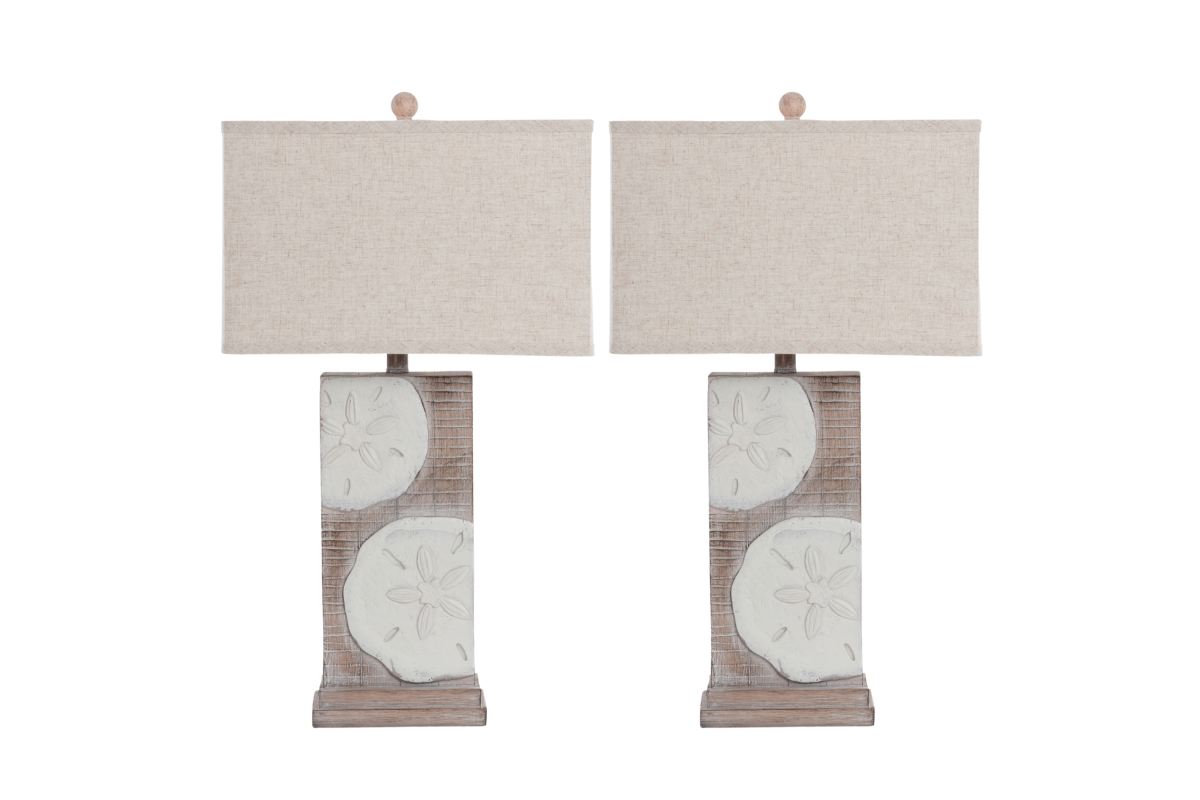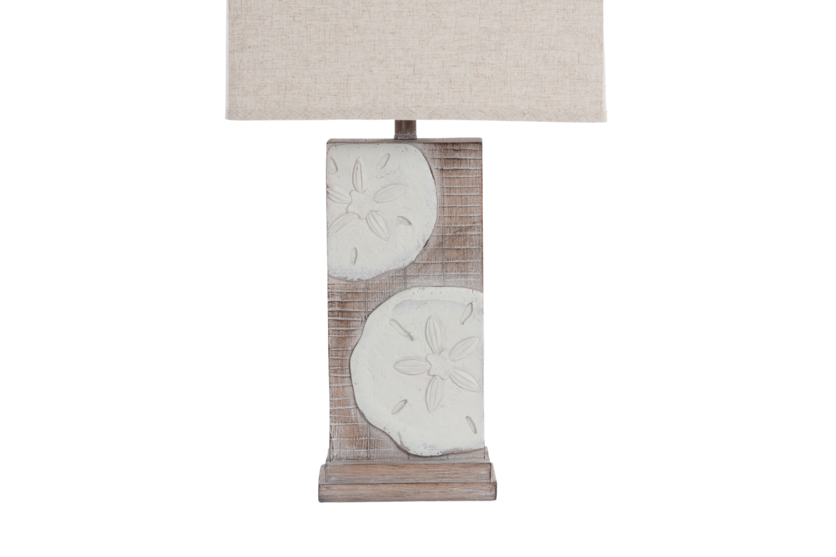 The lamp's base, meticulously crafted from durable poly resin, features an array of delicate sand dollar designs that transition seamlessly into the natural color of the base. Standing at 30 inches, it effortlessly combines coastal charm with a versatile presence that complements various decor styles. The sand dollar motifs and natural finish add a touch of seaside elegance and visual interest to the lamp, making it a captivating addition to any room.