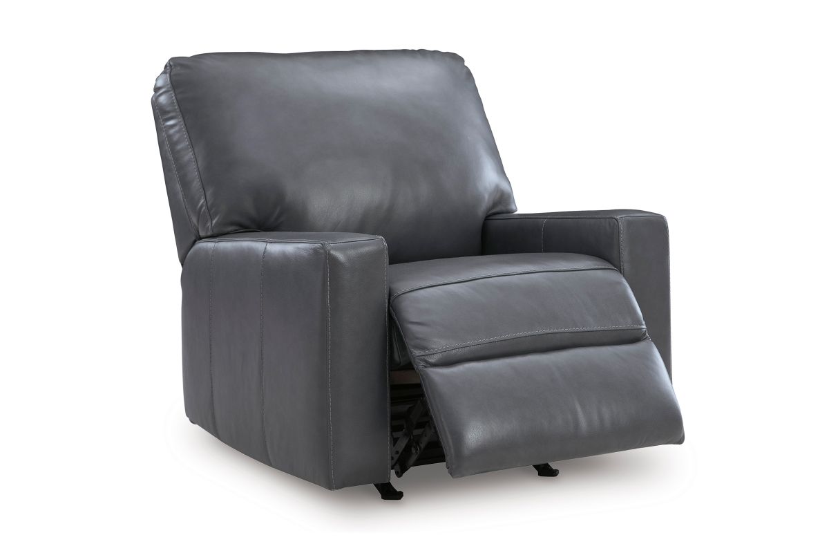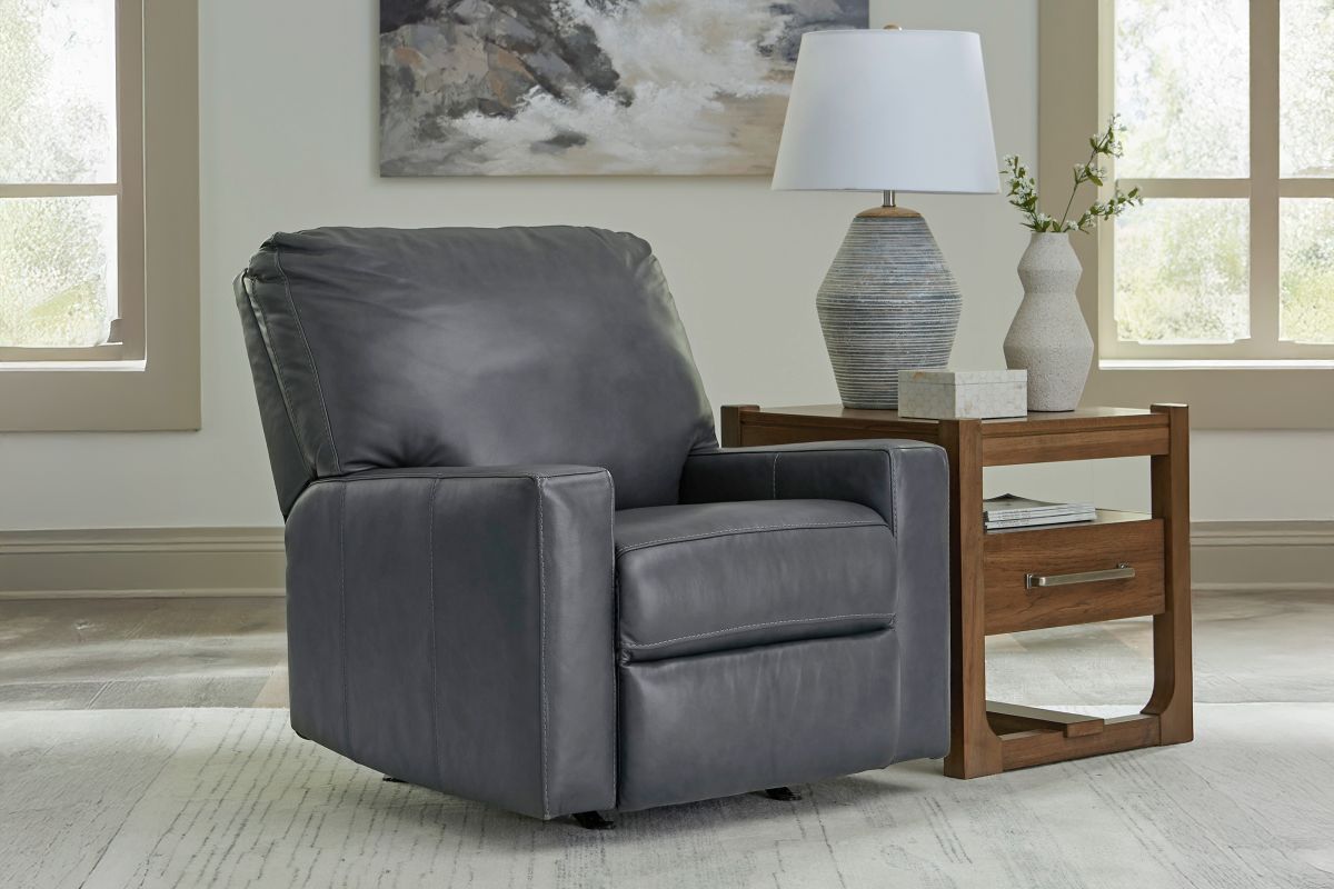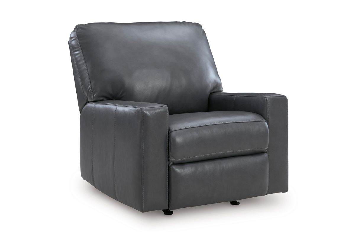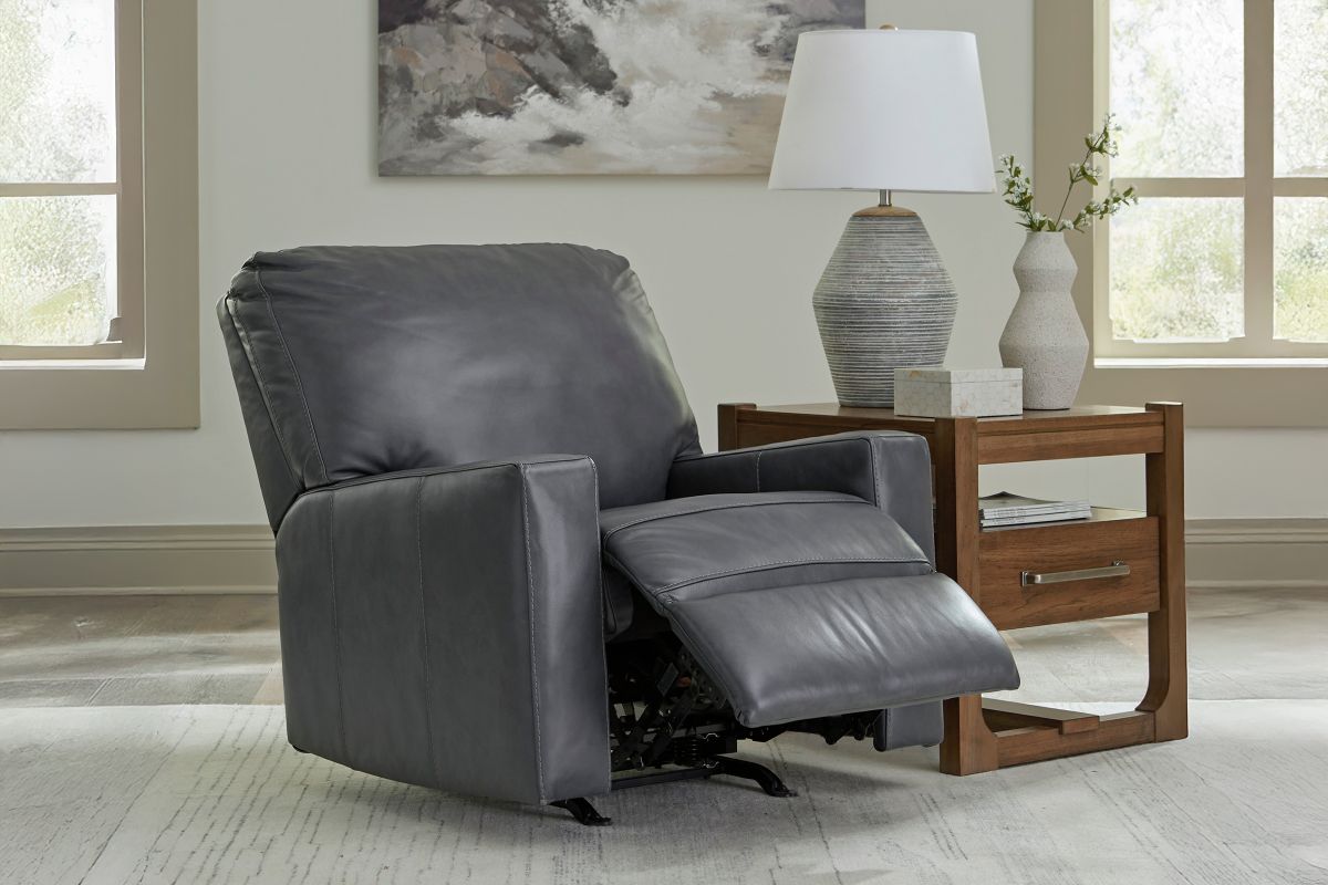 The Baker Blue Leather Recliner combines sleek contemporary style with the comfort you crave. Upholstered in top-grain blue leather, it brings a refined, modern look to your living space while offering exceptional durability. With its smooth reclining feature, supportive cushions, and clean-lined silhouette, this recliner is designed for both relaxation and style.