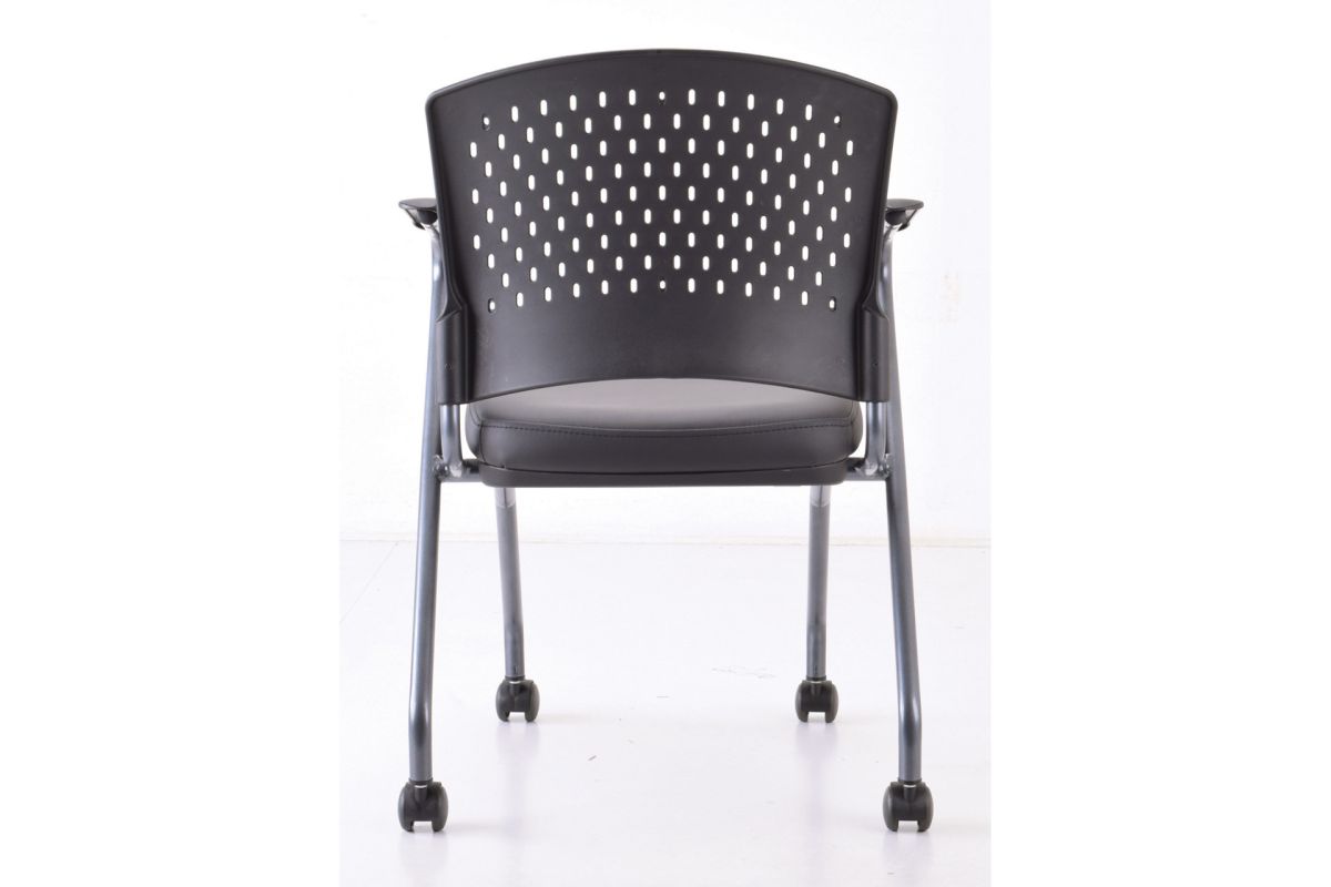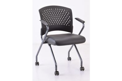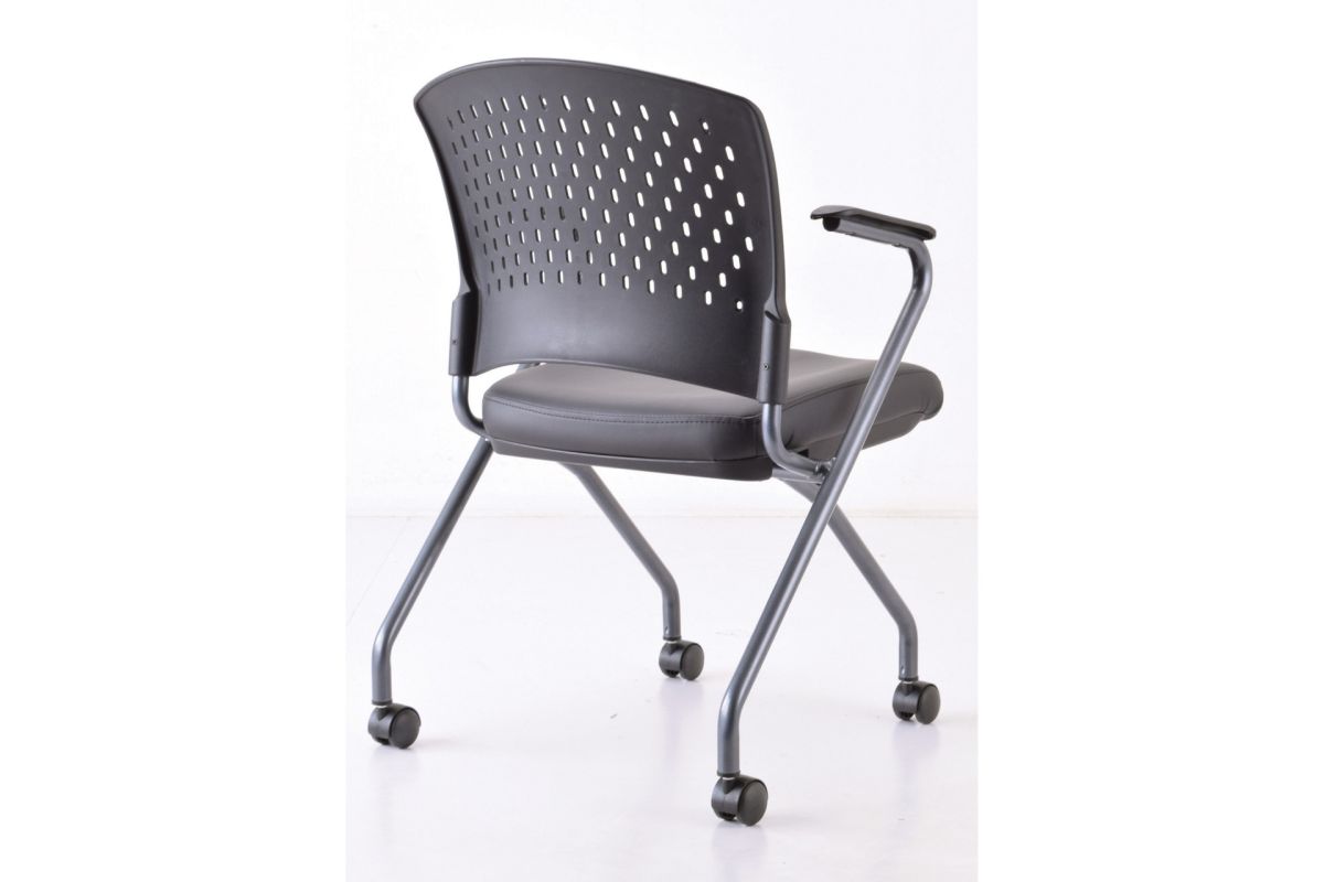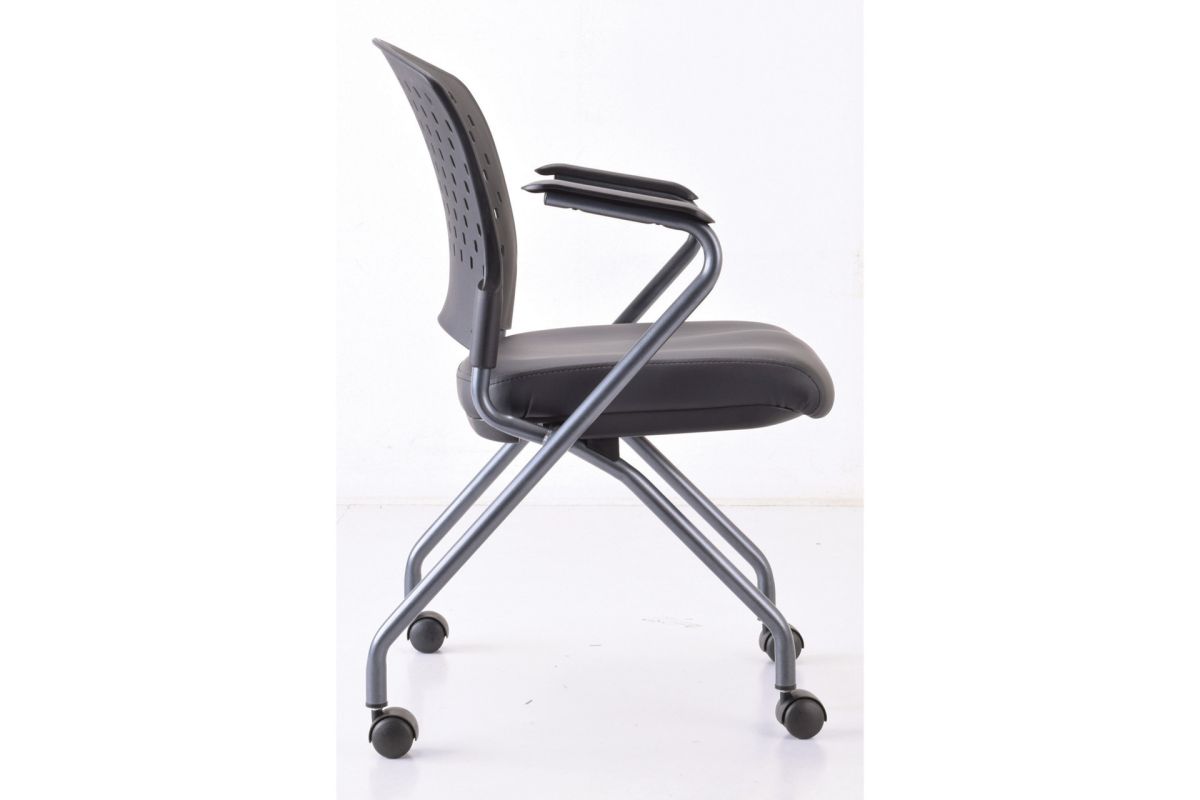 Nesting Chair with Arms and Casters features chairs with a titanium frame and fabric seats. It comes in a variety of upholstery colors.
