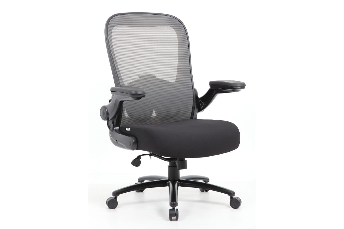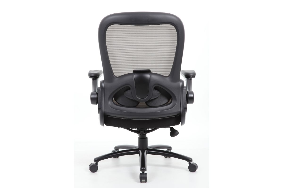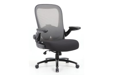 Ryde Big & Tall by OfficeSource features a heavy duty mesh back task chair that will ensure a comfortable sitting experience for a broad range of body types. With a 400 pound weight capacity, this big and tall task chair features a seat that is upholstered in black fabric and features high density foam and spring pack construction for added comfort. The gray accented mesh back allows the cushion to breath, minimizes moisture build up, and offers an adjustable lumbar feature. Enjoy additional features like height adjustable flip arms, a pneumatic gas lift seat height adjustment, a heavy duty spring tilt mechanism, and tilt tension control. This big and tall high back mesh task chair is perfect for any office, conference room, or study.